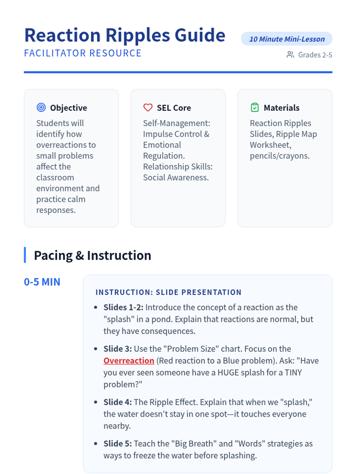 A 10-minute social-emotional learning lesson focused on identifying overreactions and understanding how our emotional responses affect the people and environment around us, specifically in situations of loss or mistakes.