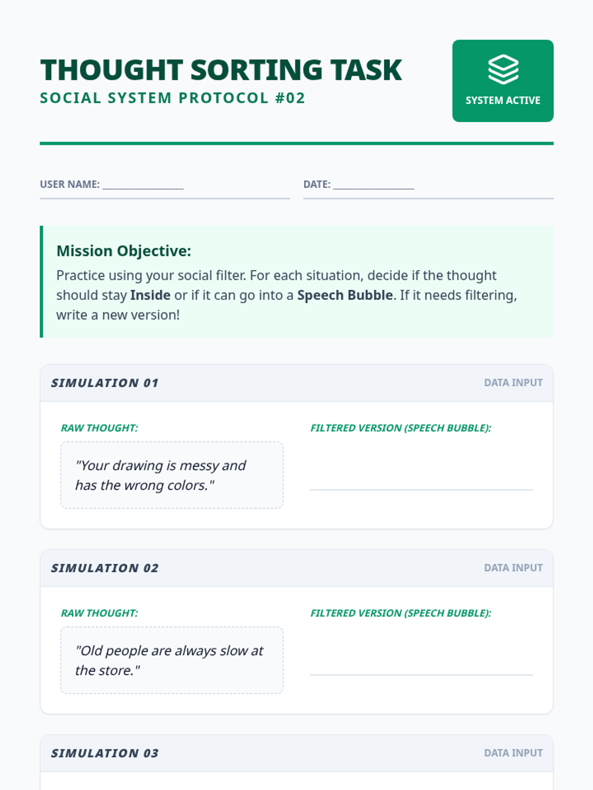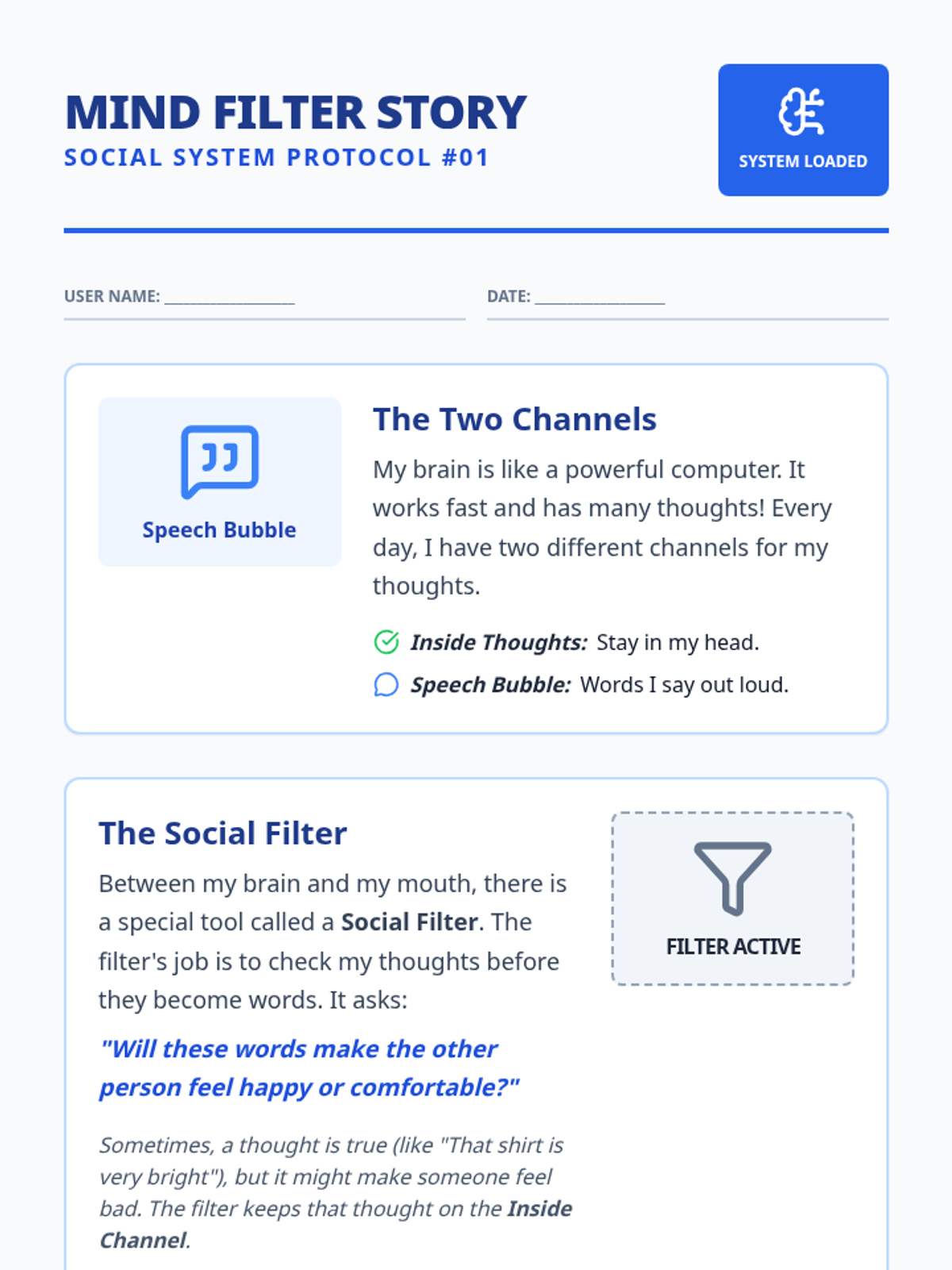 A comprehensive set of tools to help students understand the 'Social Filter,' practice perspective-taking, and manage blunt or inappropriate comments through structured social stories and teacher-led redirection.