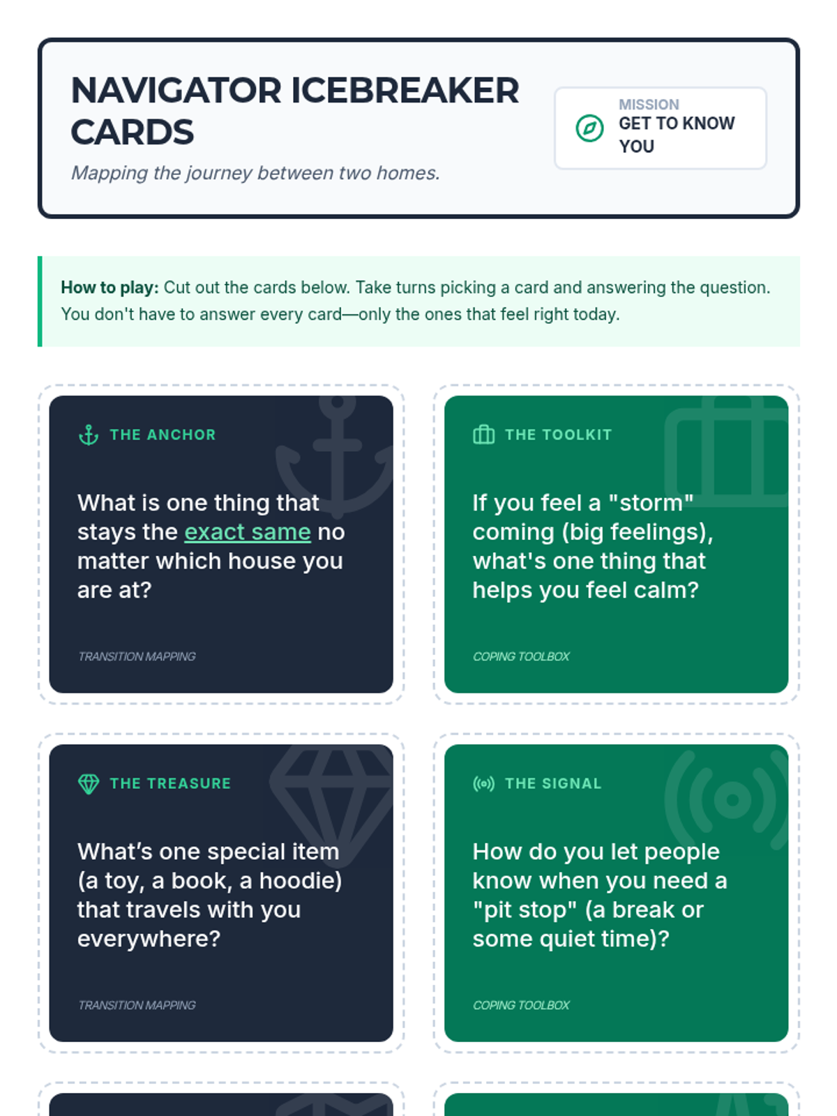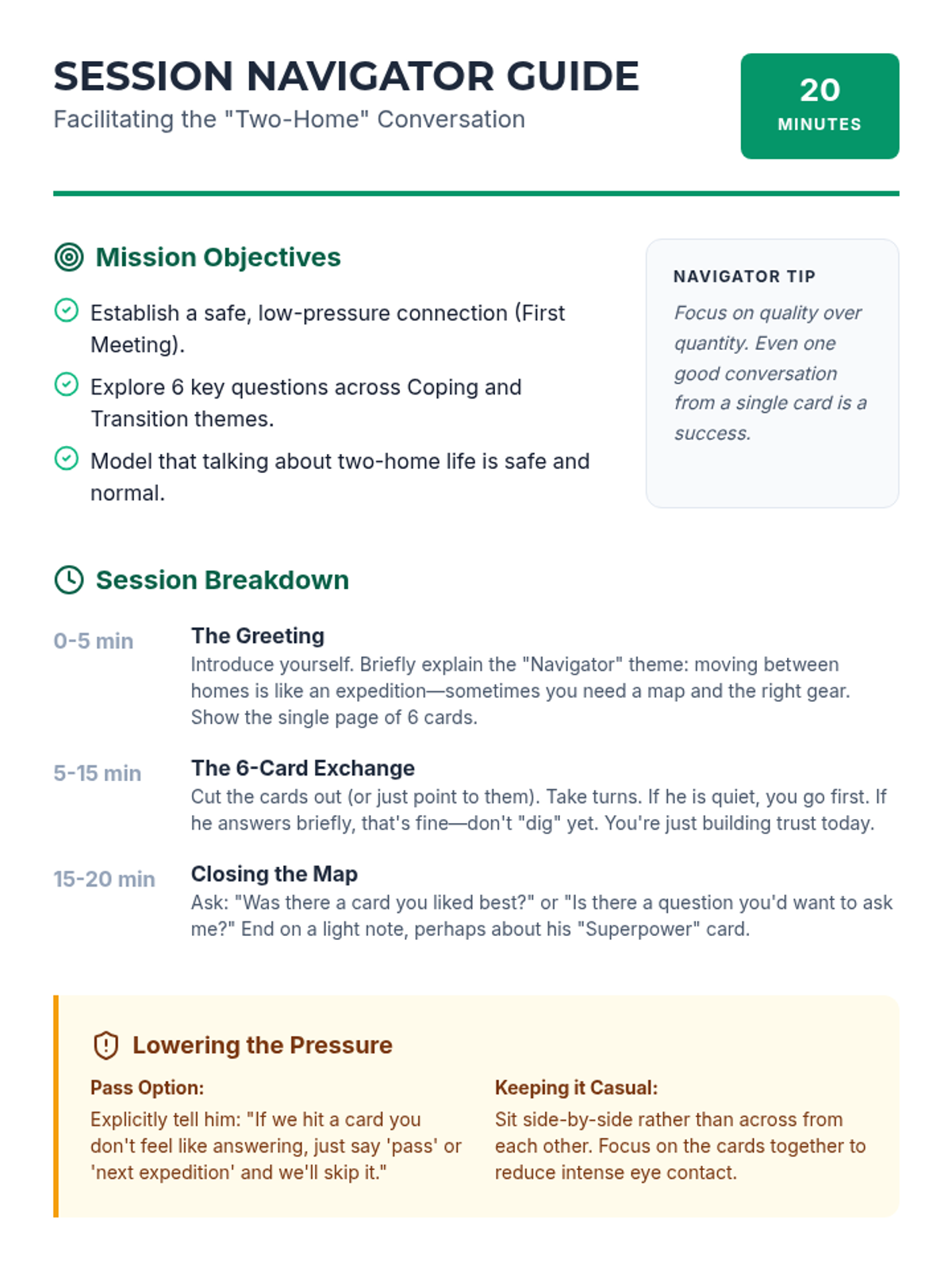 A short, supportive introductory session designed for a student navigating family separation, focusing on identifying coping strategies and managing the logistics of living in two homes.
