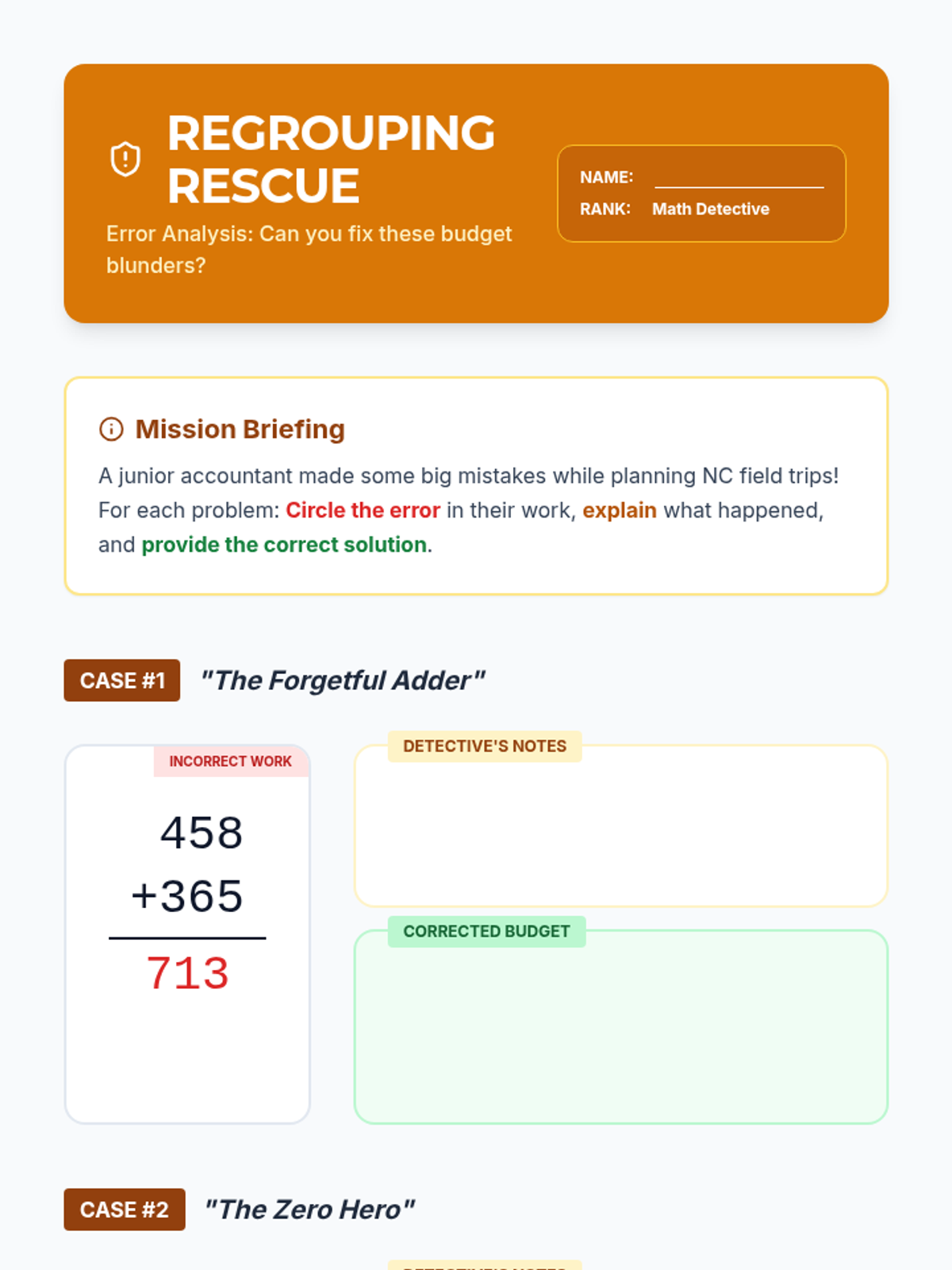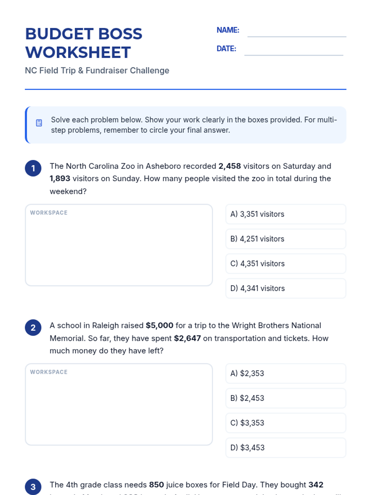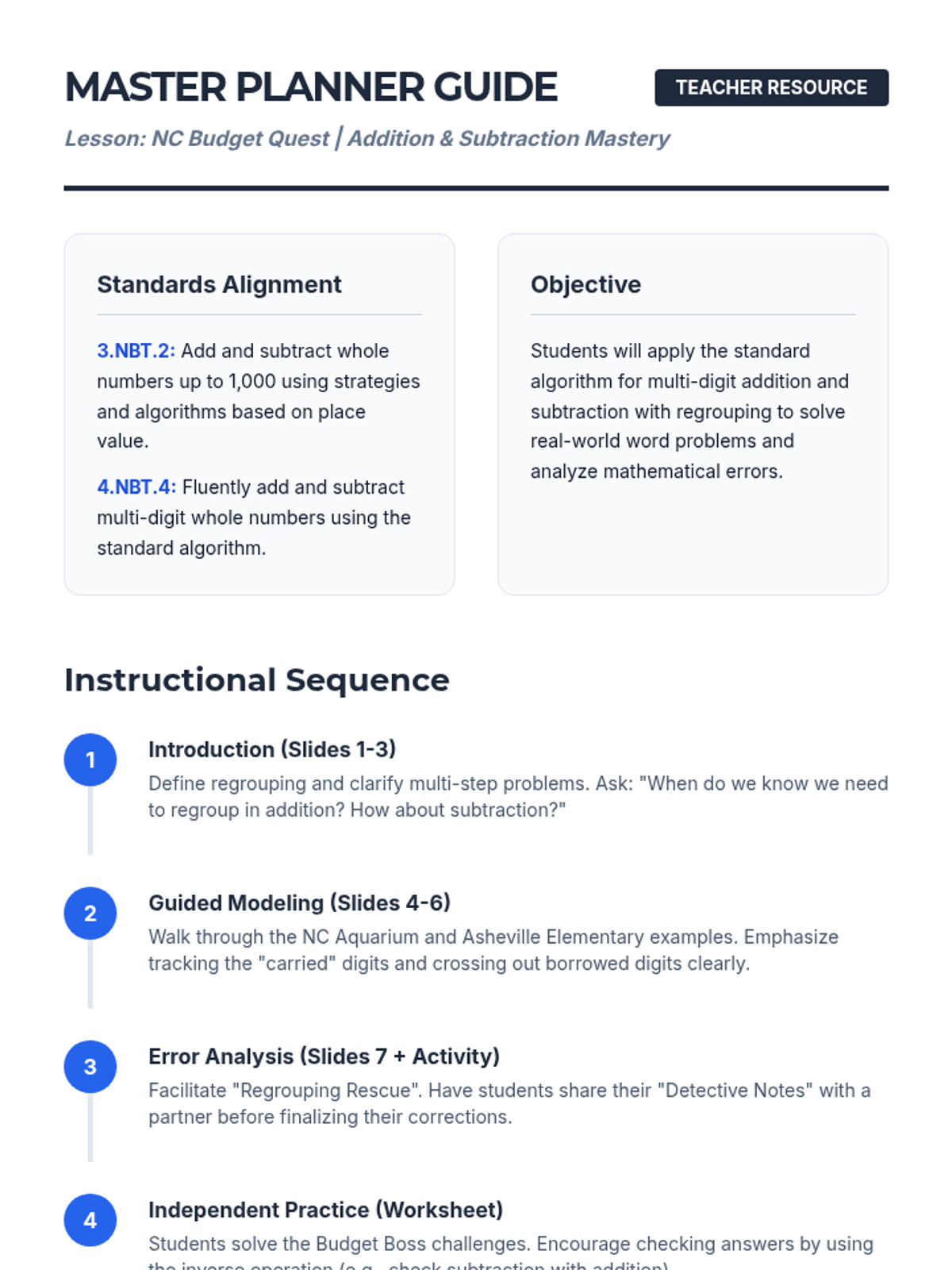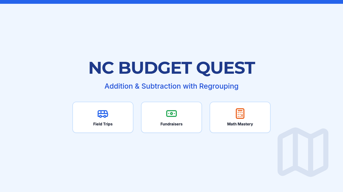 Students master multi-digit addition and subtraction with regrouping through real-world North Carolina scenarios, including field trip planning and school fundraisers. The lesson features step-by-step modeling, EOG-style word problems, and a critical error analysis activity.