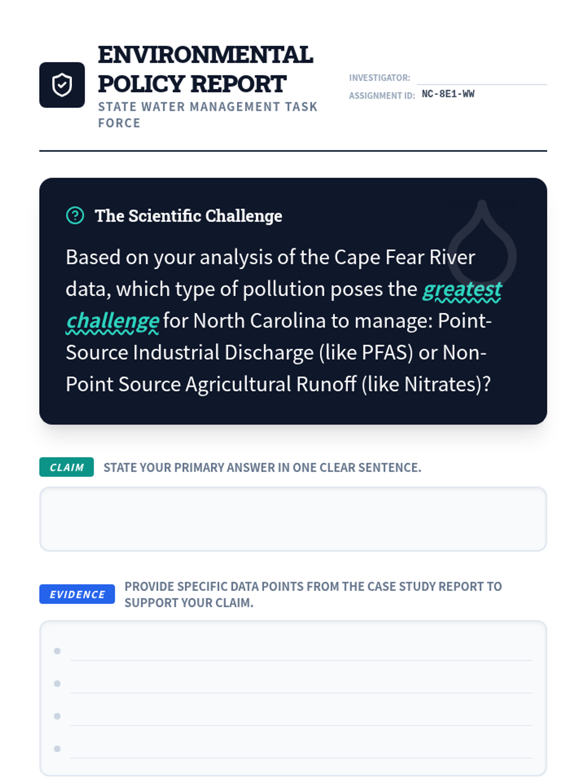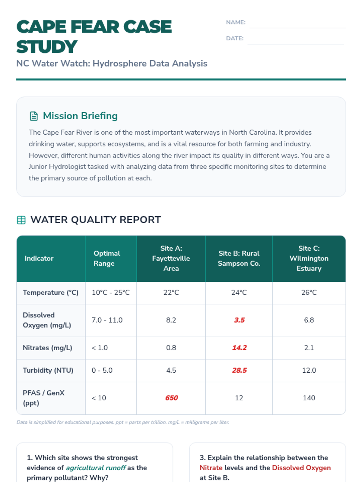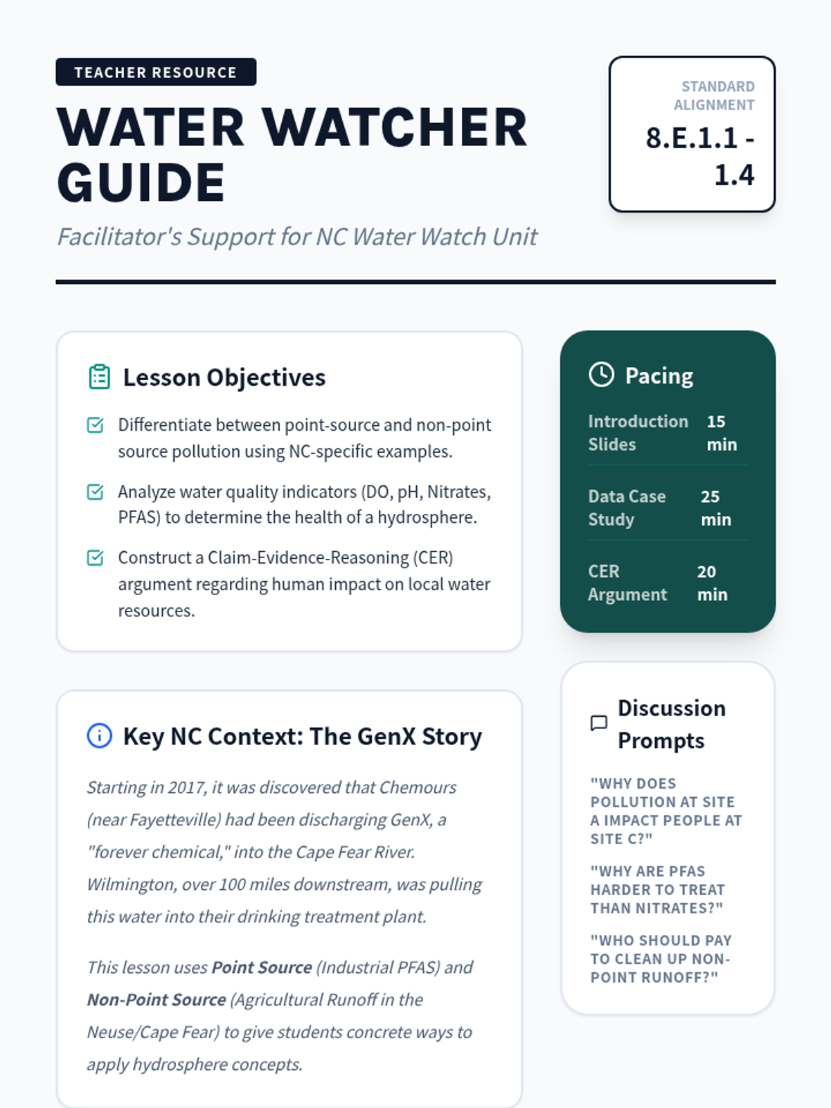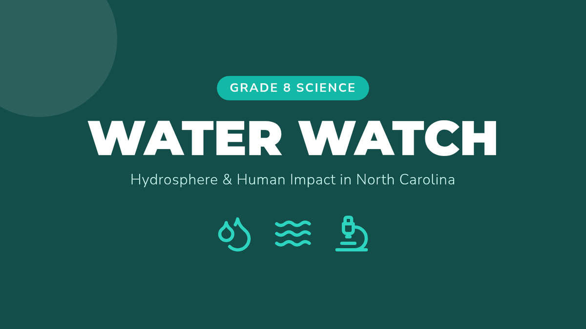 A comprehensive Grade 8 science lesson focused on North Carolina's water quality, specifically examining the impacts of agricultural runoff and PFAS contamination in the Cape Fear River. Students analyze real-world data and construct evidence-based arguments regarding hydrosphere health.