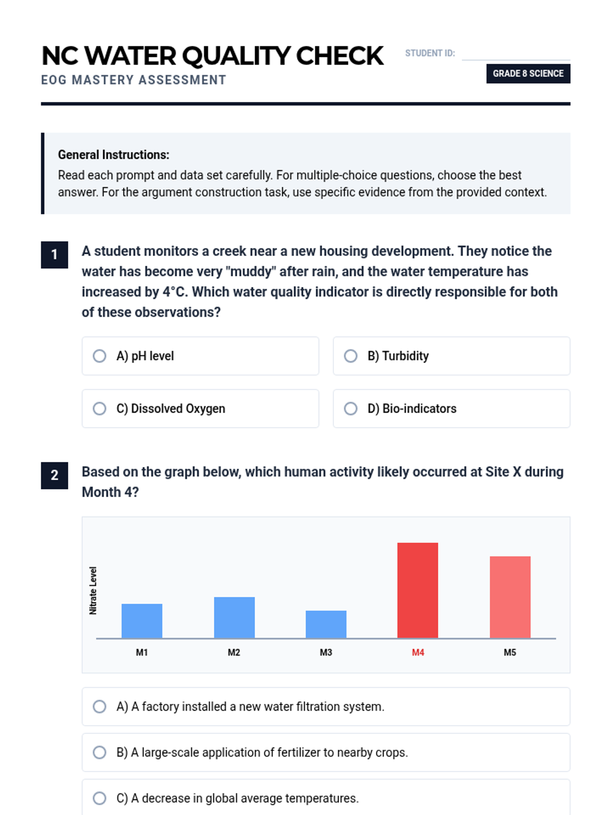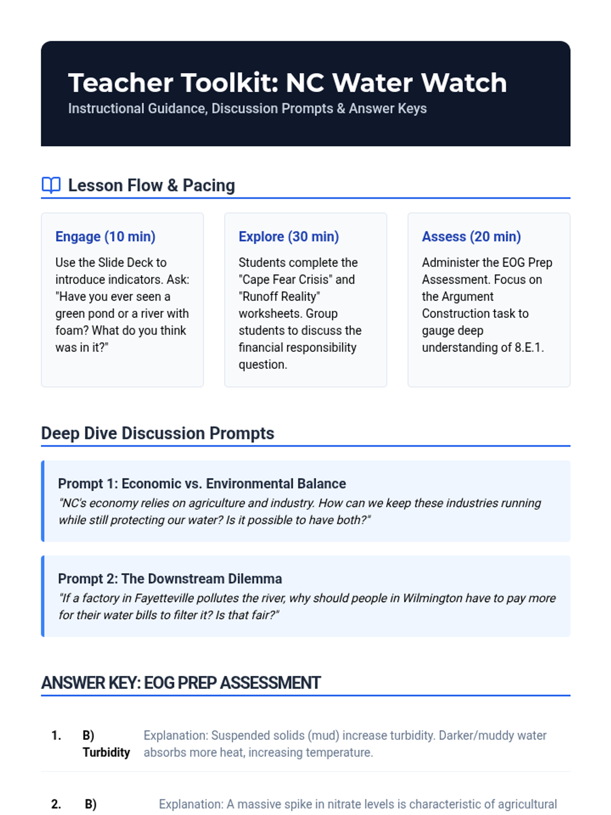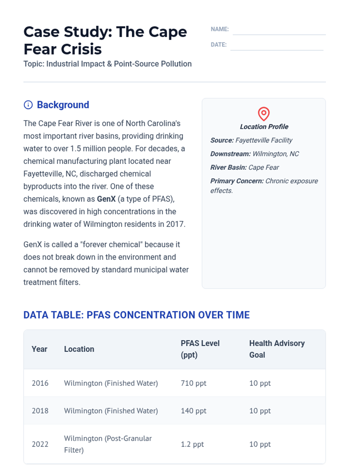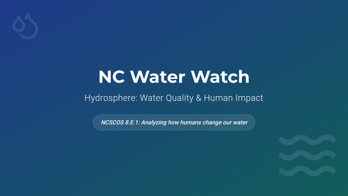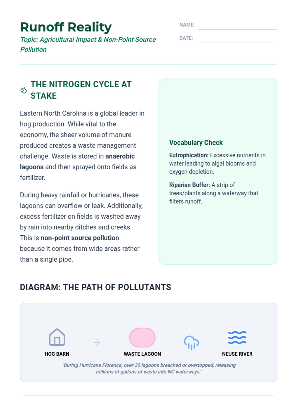 A comprehensive Grade 8 science lesson focused on North Carolina's water quality challenges, including agricultural runoff from hog farms and industrial PFAS contamination in the Cape Fear River. Students analyze data, evaluate human impacts, and propose solutions aligned with NCSCOS 8.E.1.