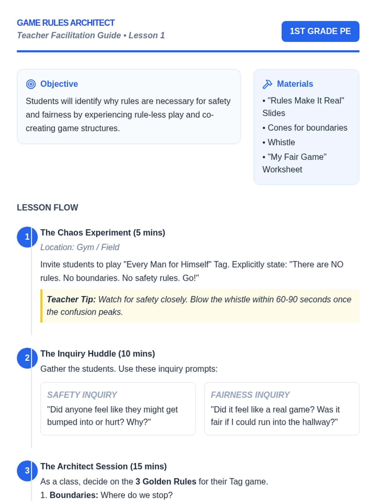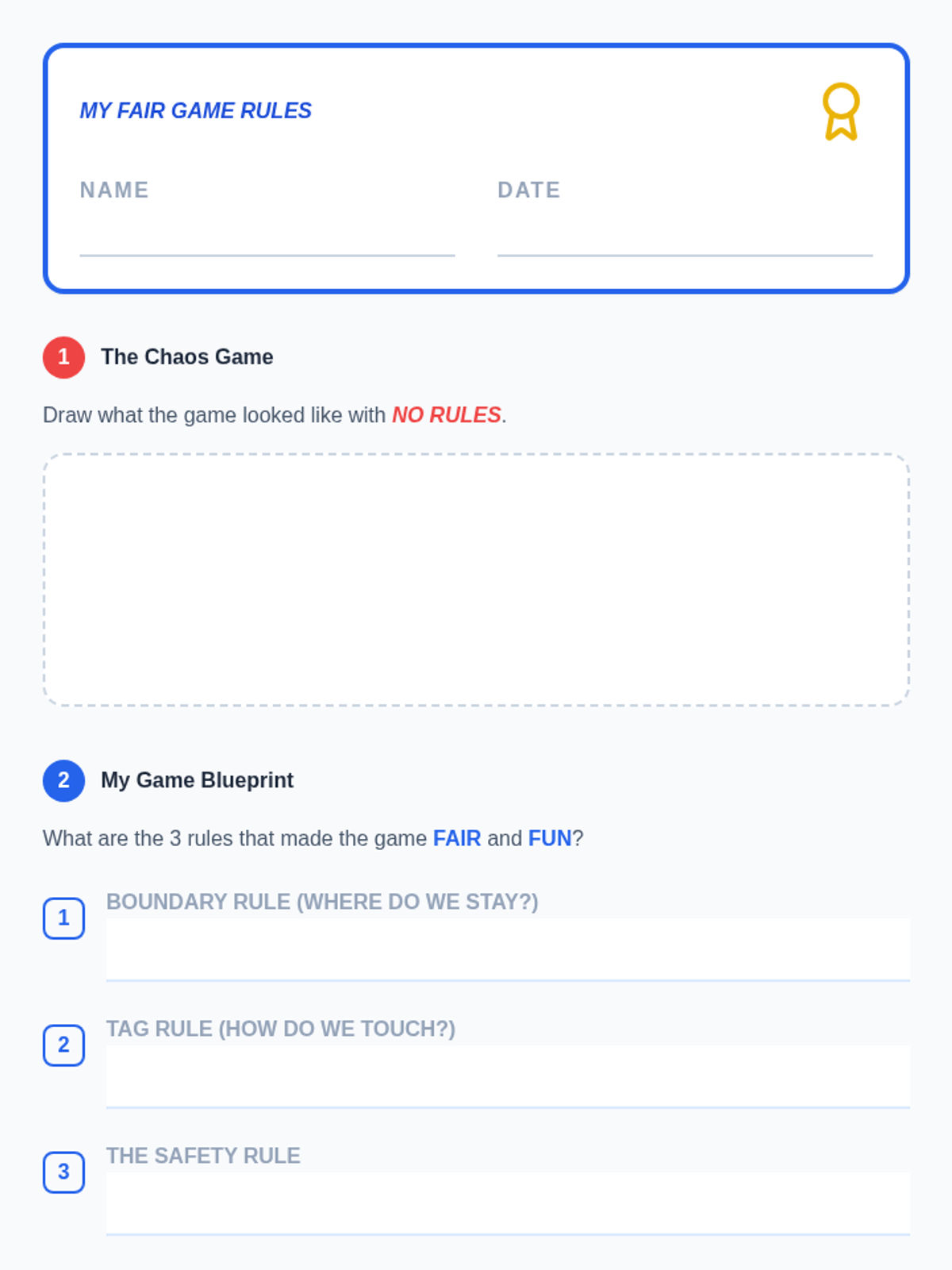 Students experience a game without rules to discover why they are necessary for safety and fun, then co-create rules for a new game.