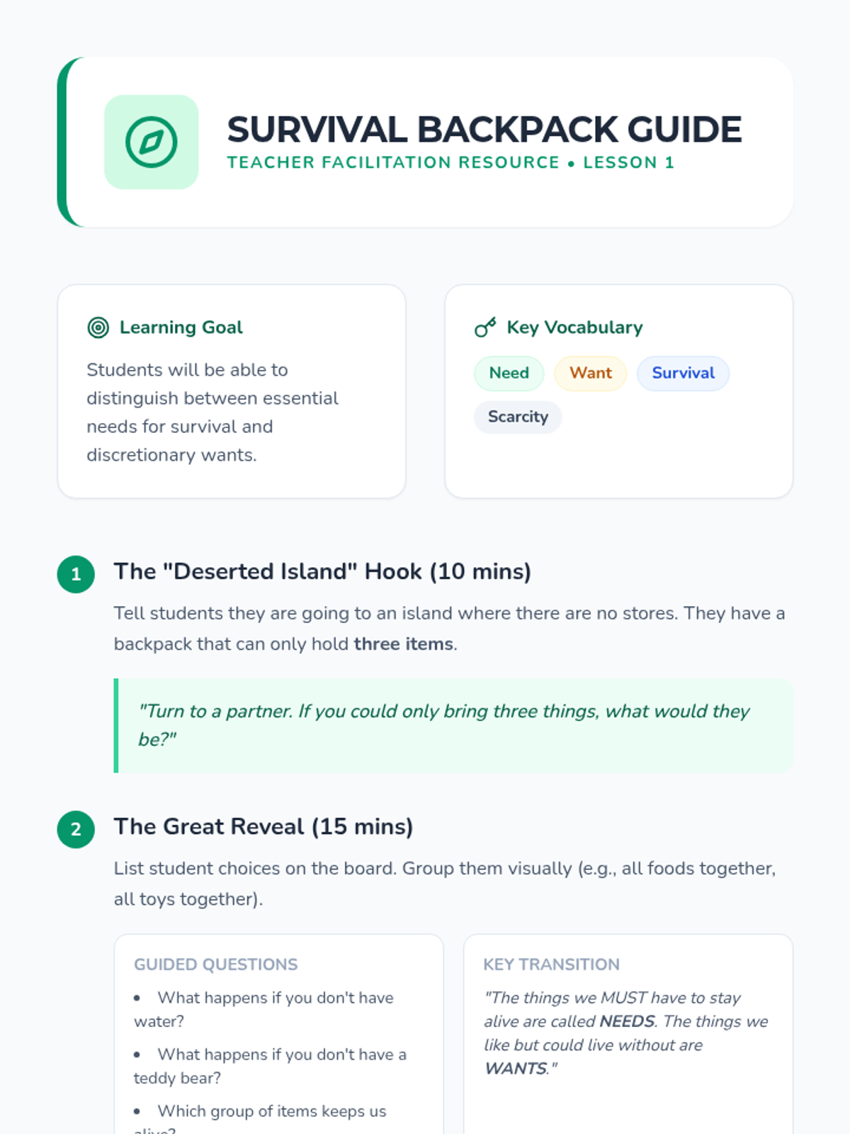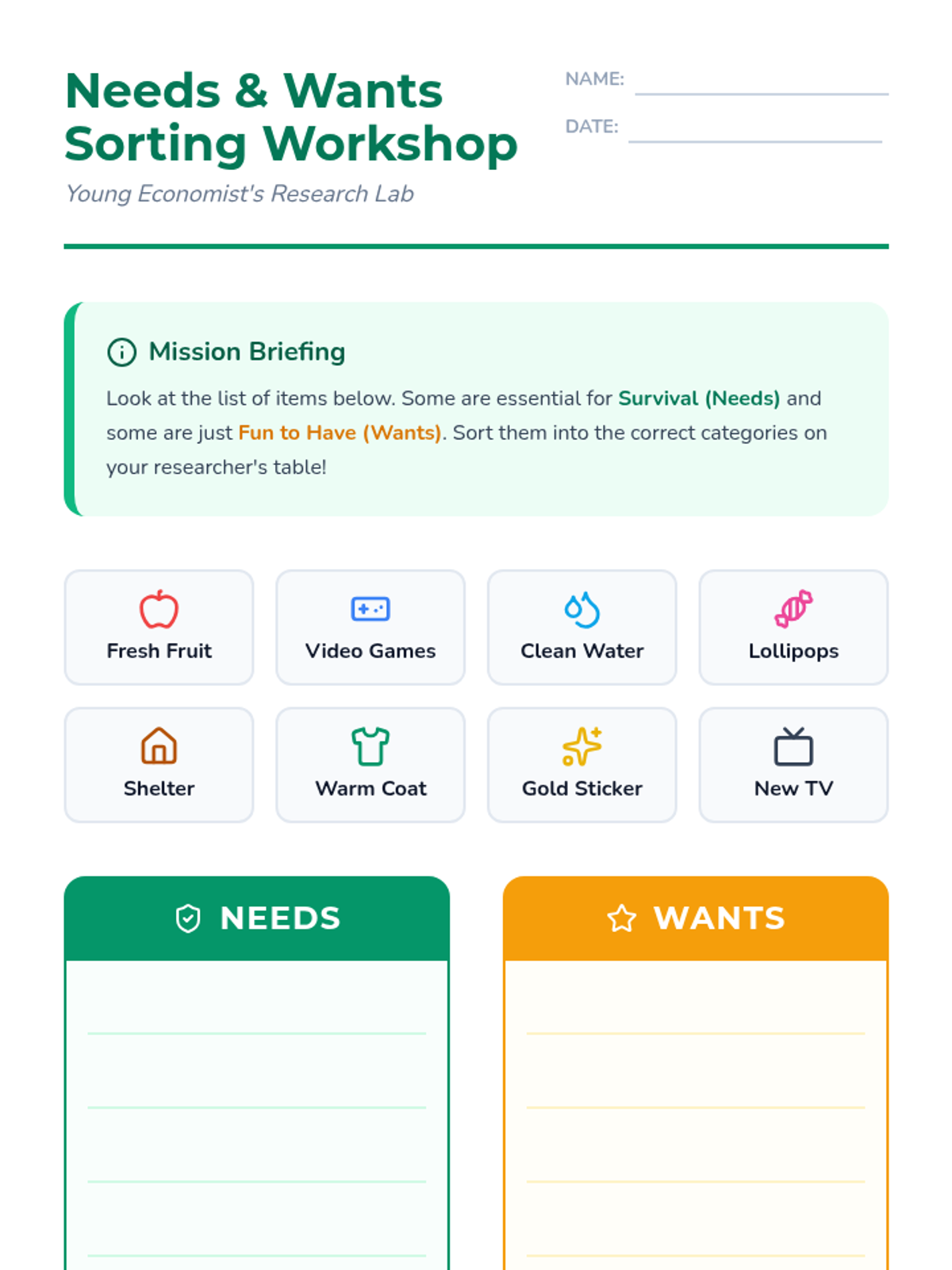 Students categorize items as essential survival needs or desirable wants to establish baseline economic vocabulary.