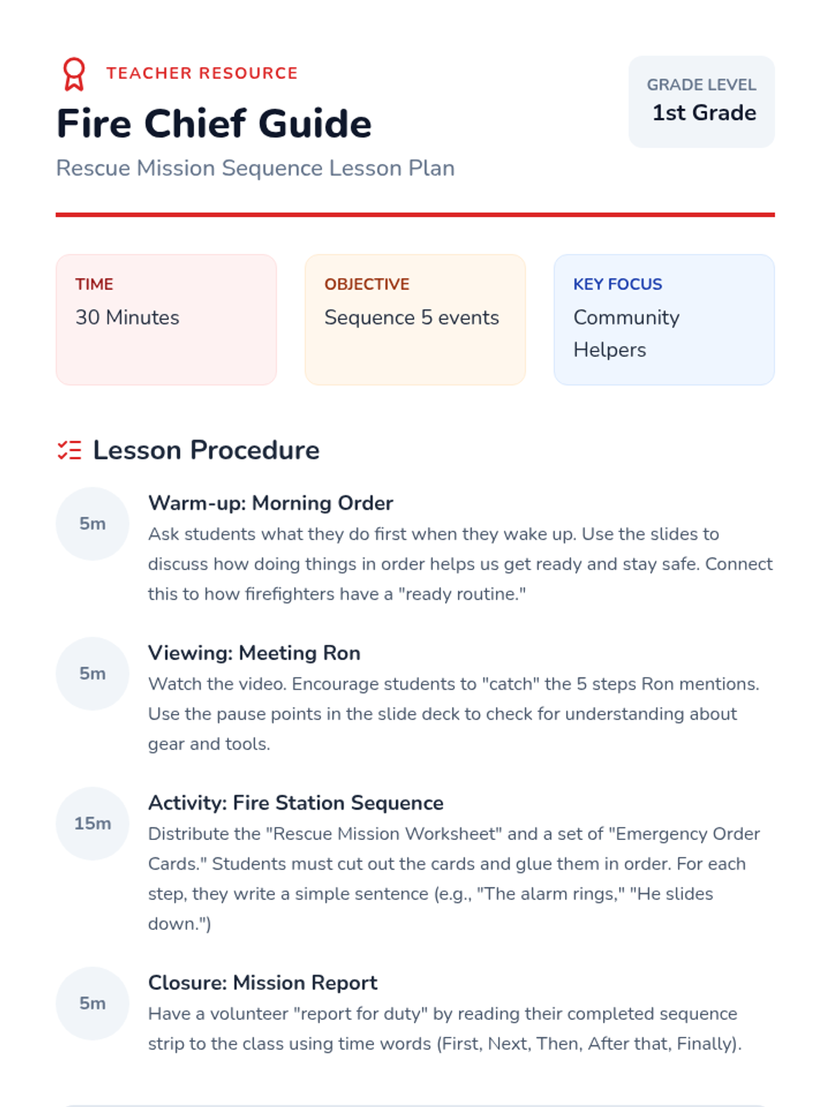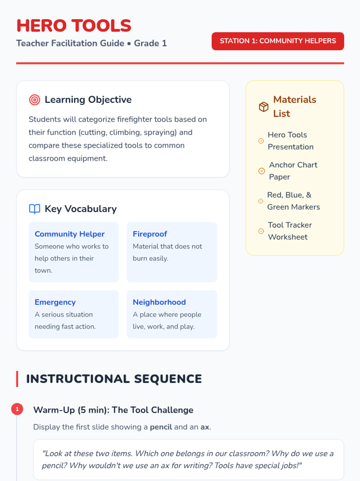 A 1st-grade lesson exploring community helpers, specifically firefighters, through their specialized tools and comparing them to classroom equipment.