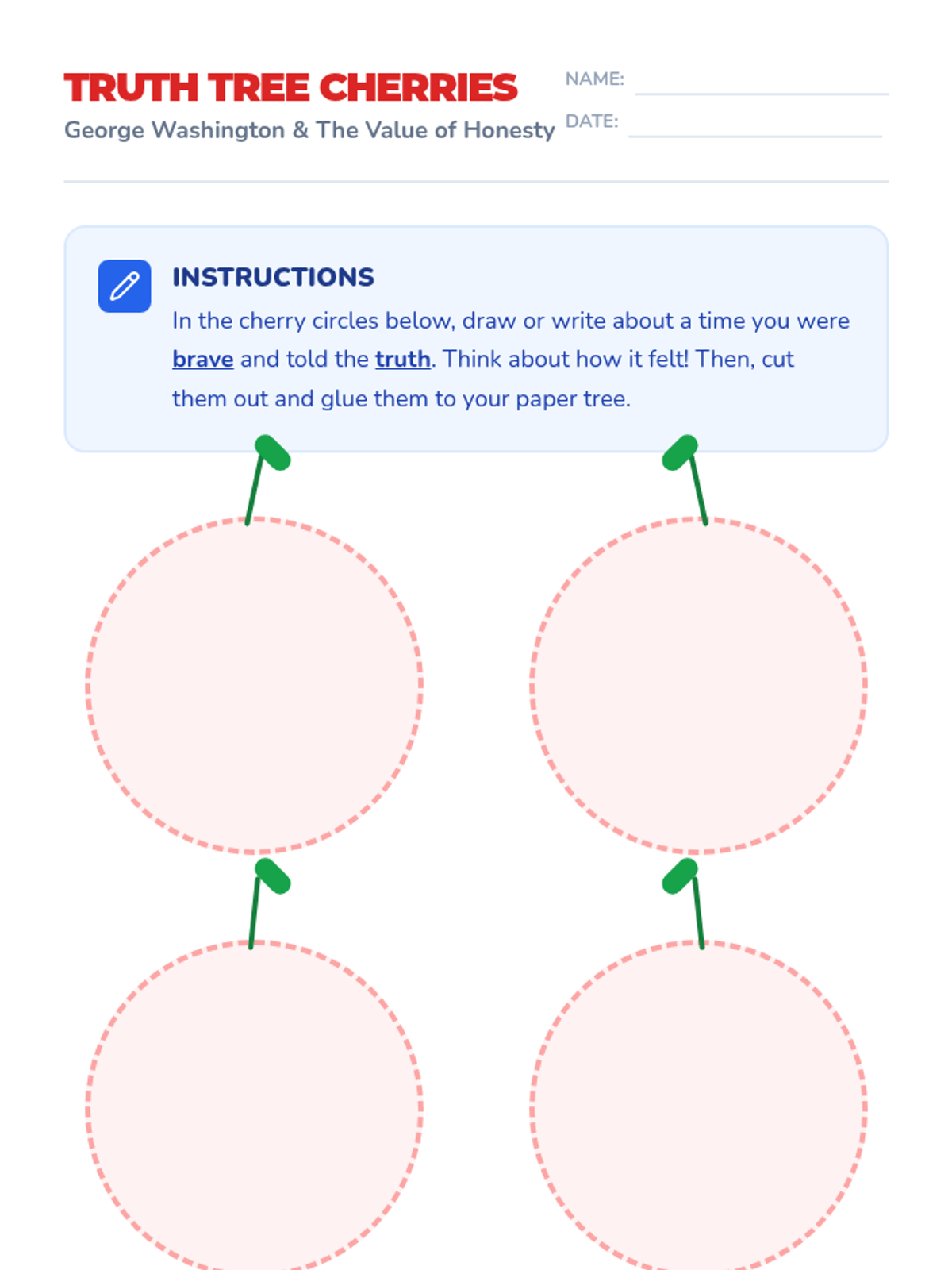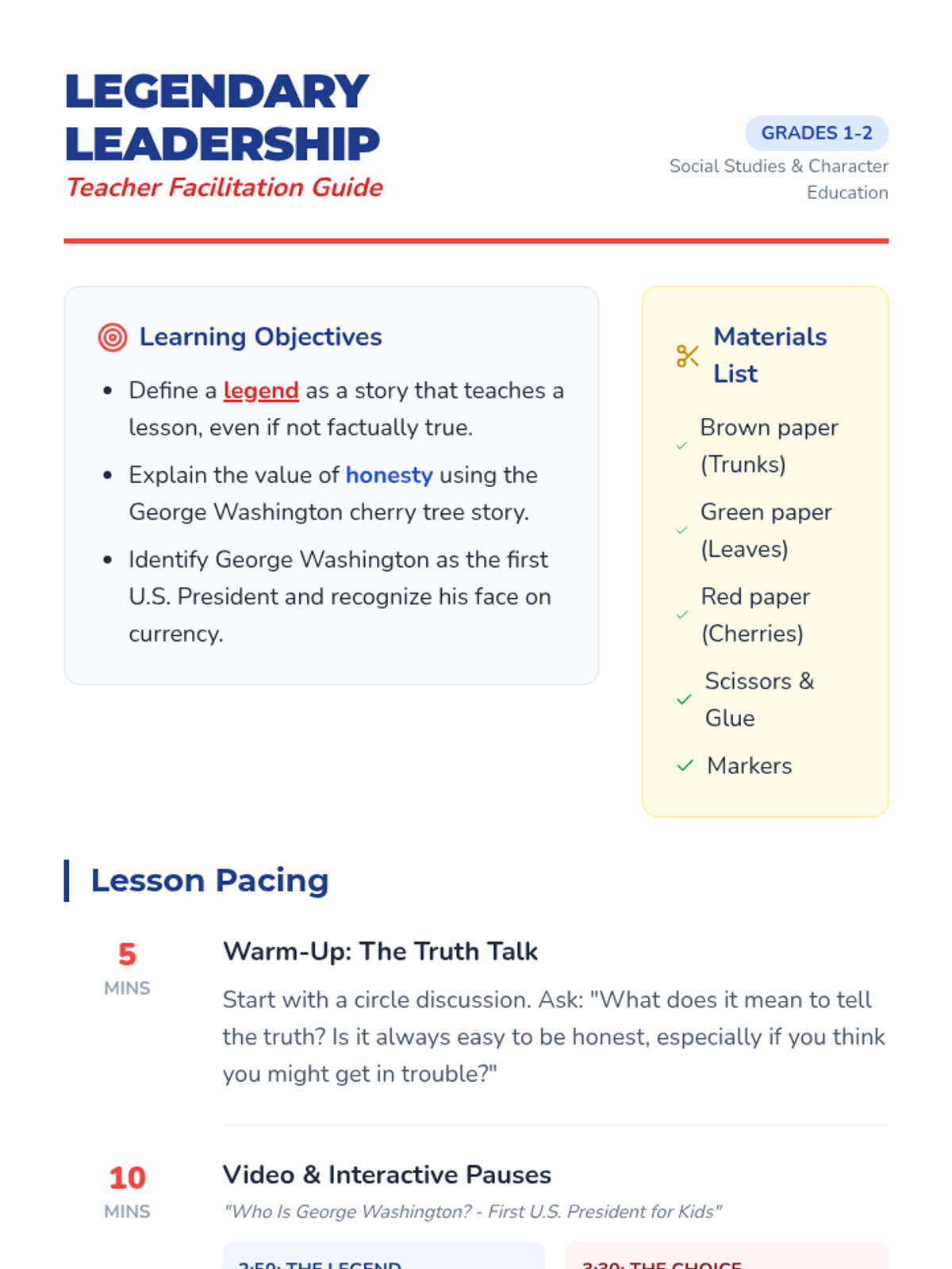 A lesson for 1st and 2nd graders exploring the life of George Washington, the definition of a 'legend', and the importance of honesty through the famous cherry tree story and a hands-on 'Truth Tree' craft.