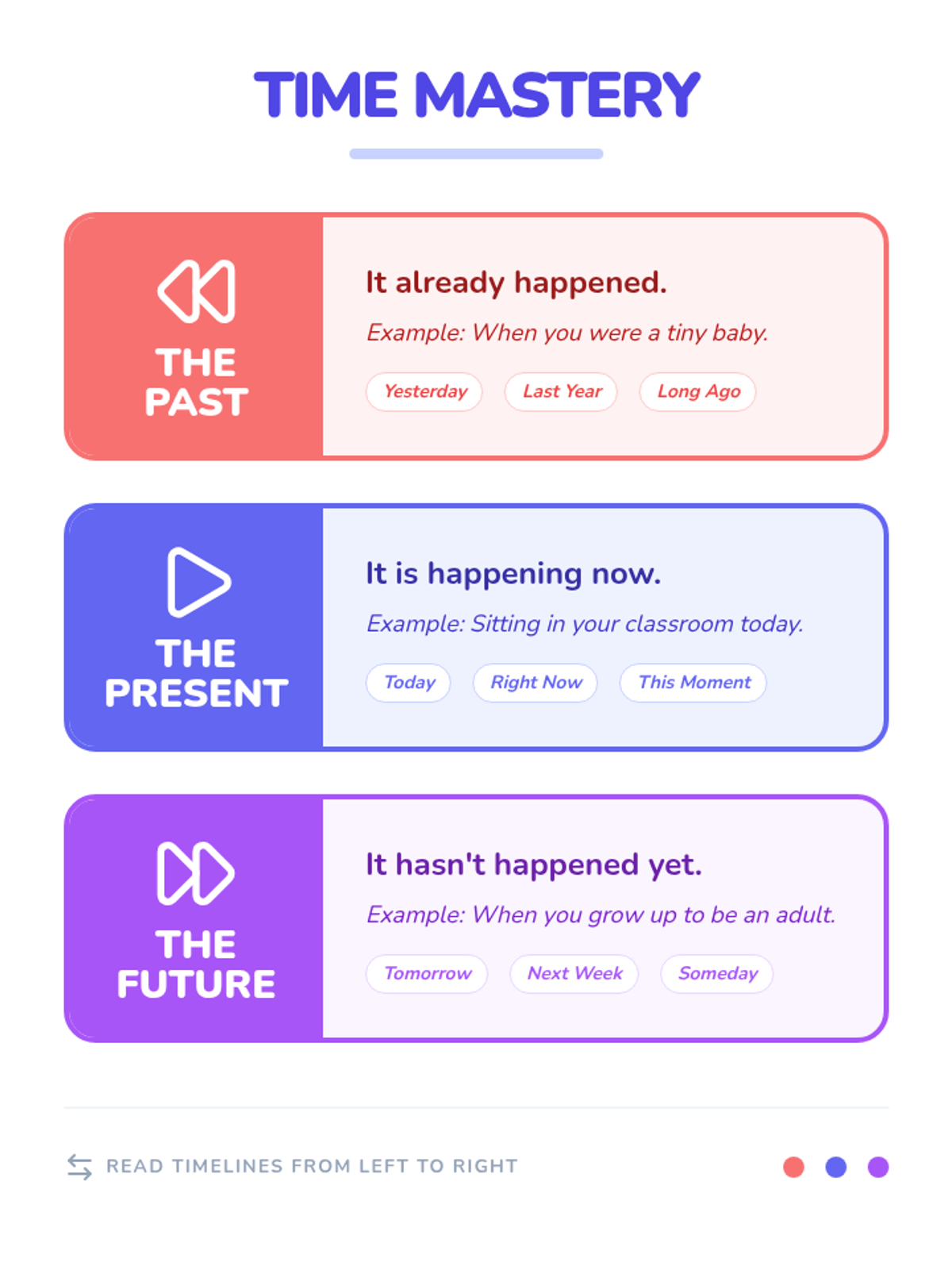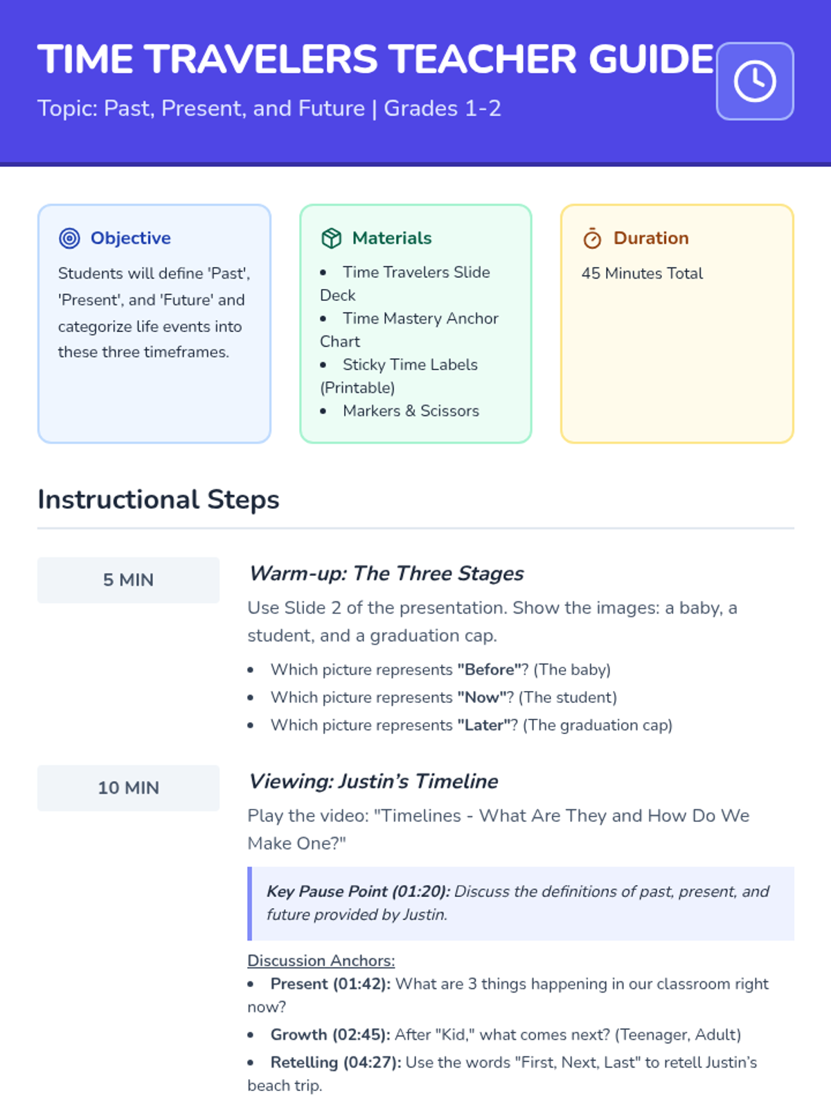 Students learn to distinguish between the past, present, and future by analyzing growth, sequencing events on a timeline, and categorizing their own life experiences through a hands-on sorting activity.