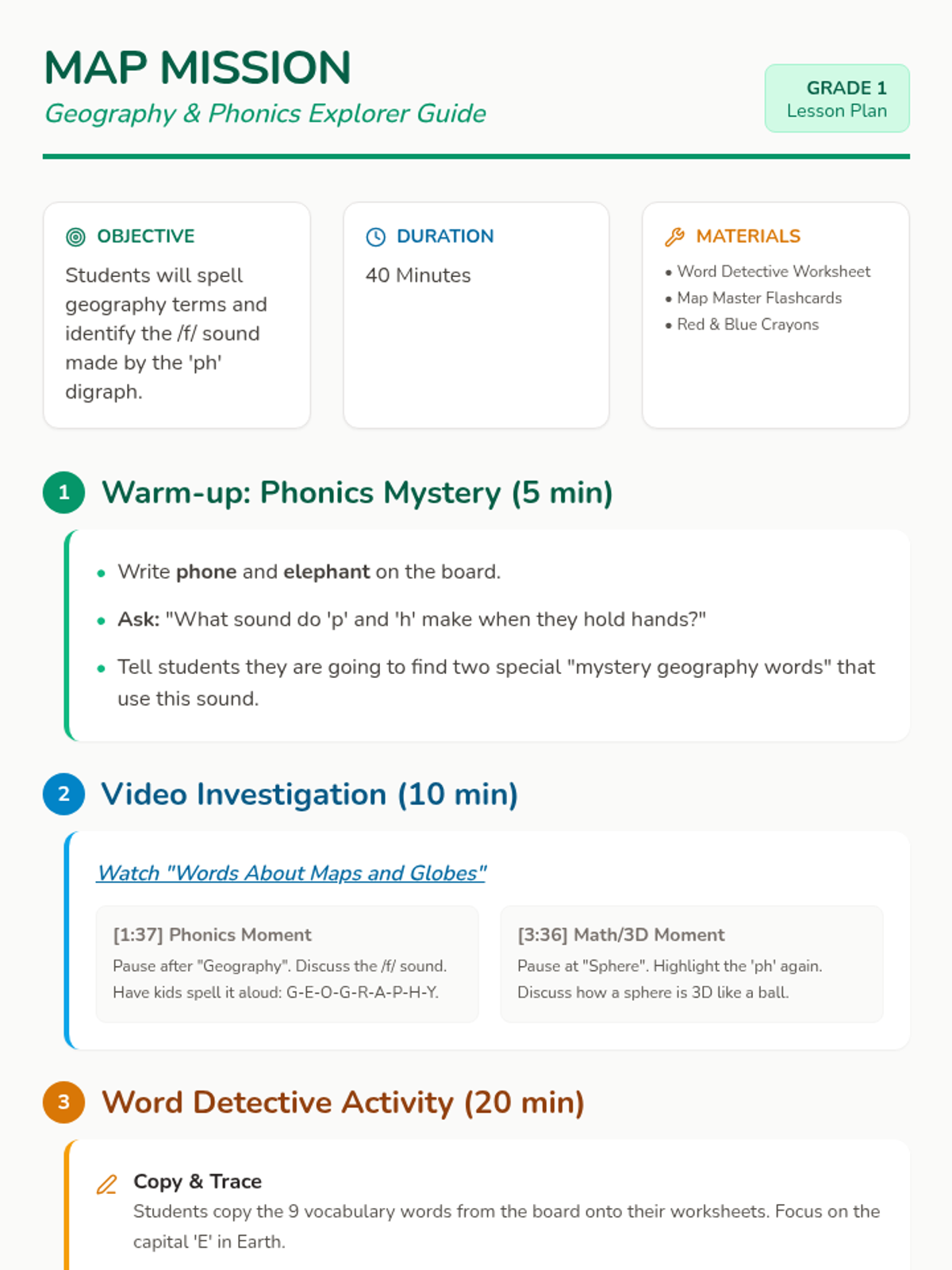 A geography-focused phonics lesson where 1st graders explore map vocabulary and the 'ph' digraph through video analysis and hands-on word detective work.