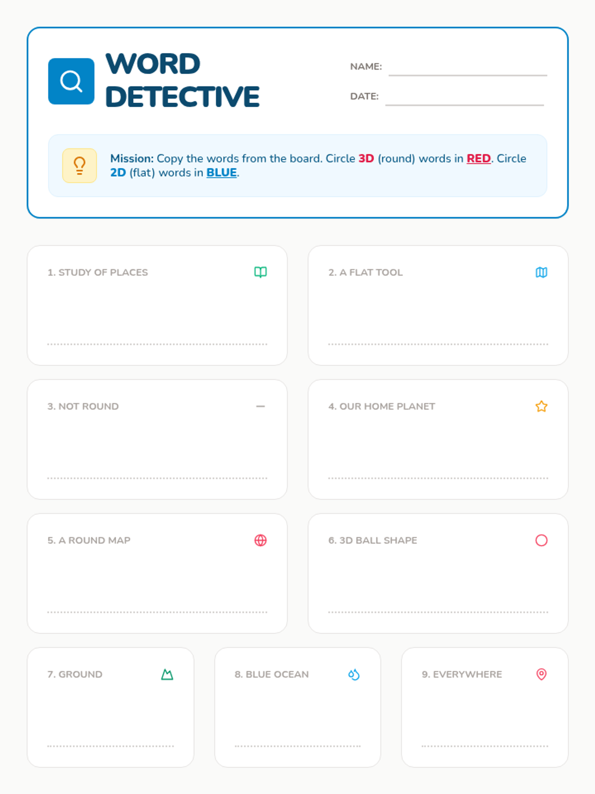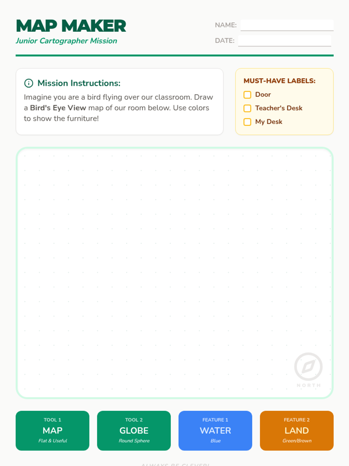 A 1st-grade introduction to geography where students explore the difference between maps and globes, learn key vocabulary, and create a bird's-eye view map of their own classroom.