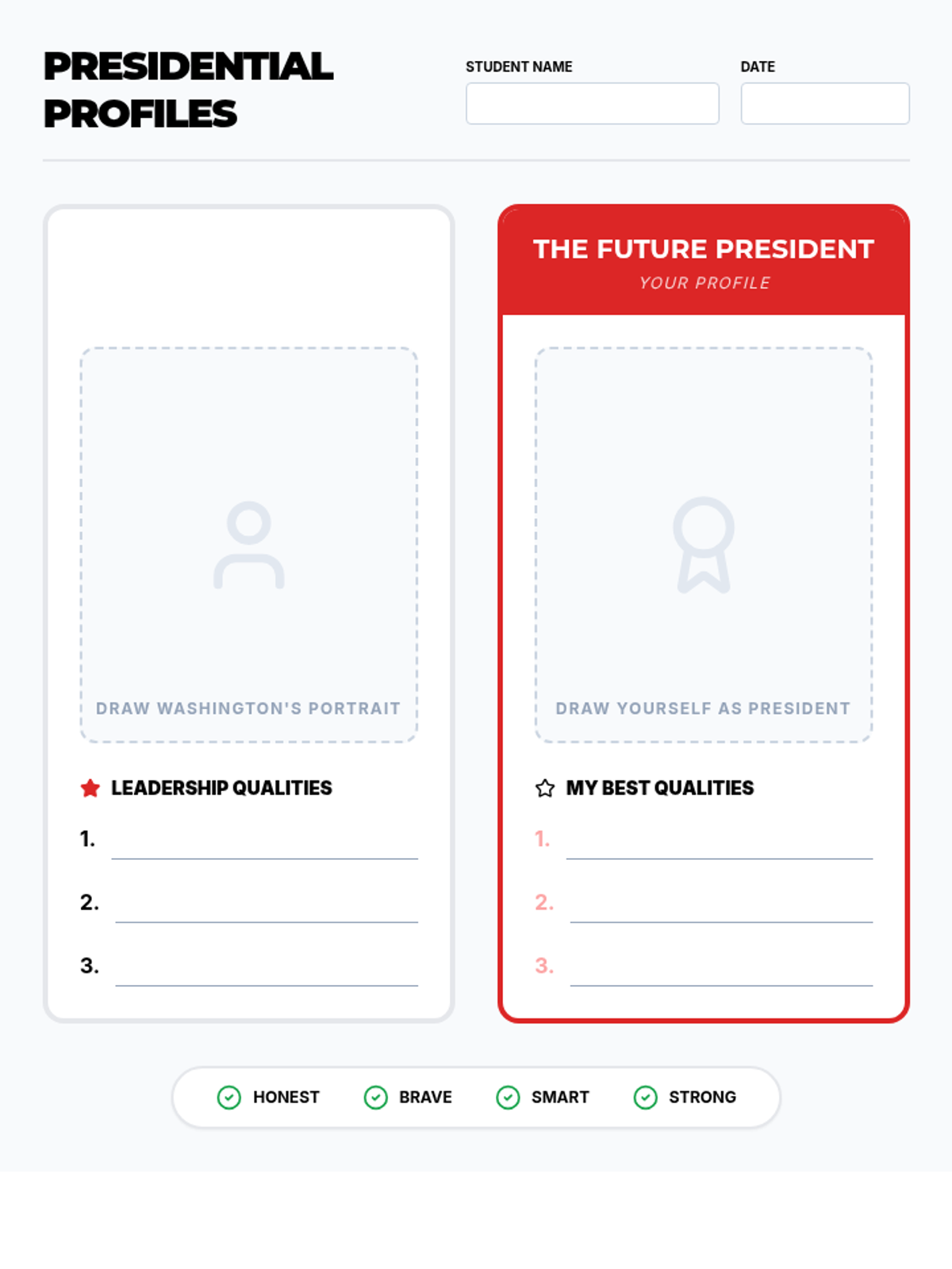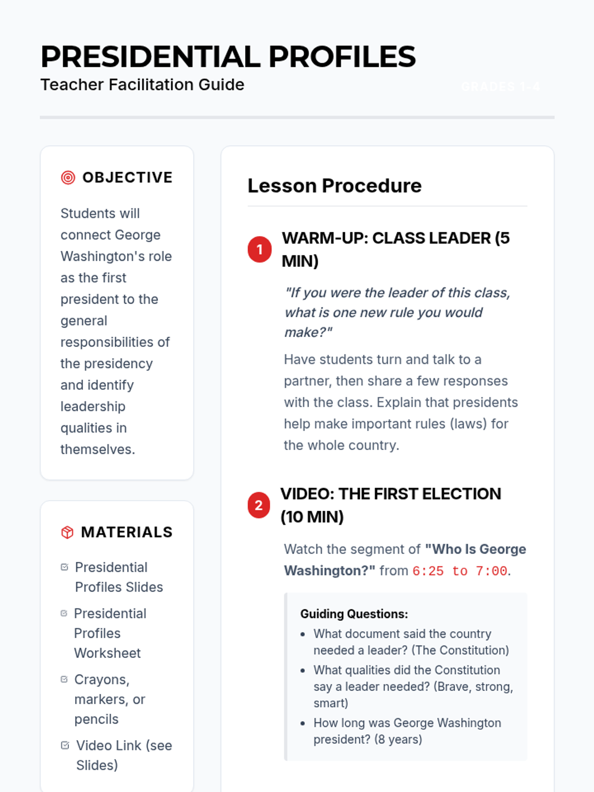 Students explore George Washington's role as the first U.S. President and connect his leadership qualities to the general responsibilities of the presidency through profile creation and role-play.