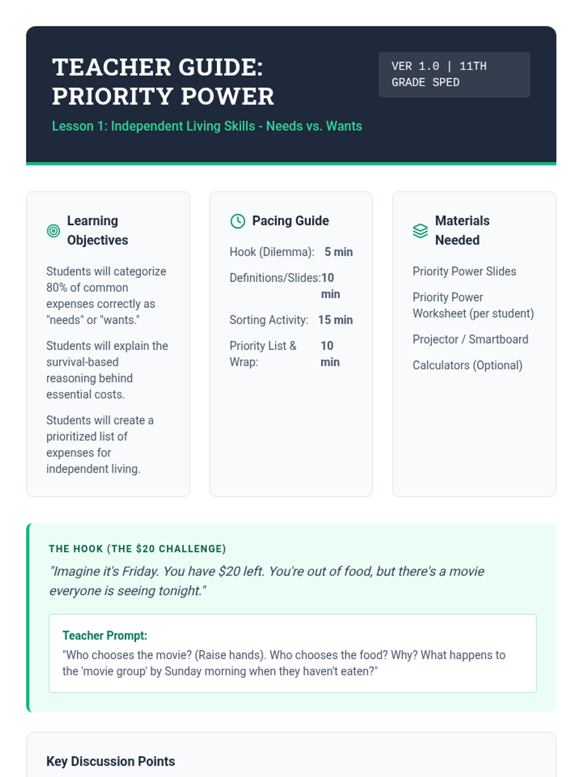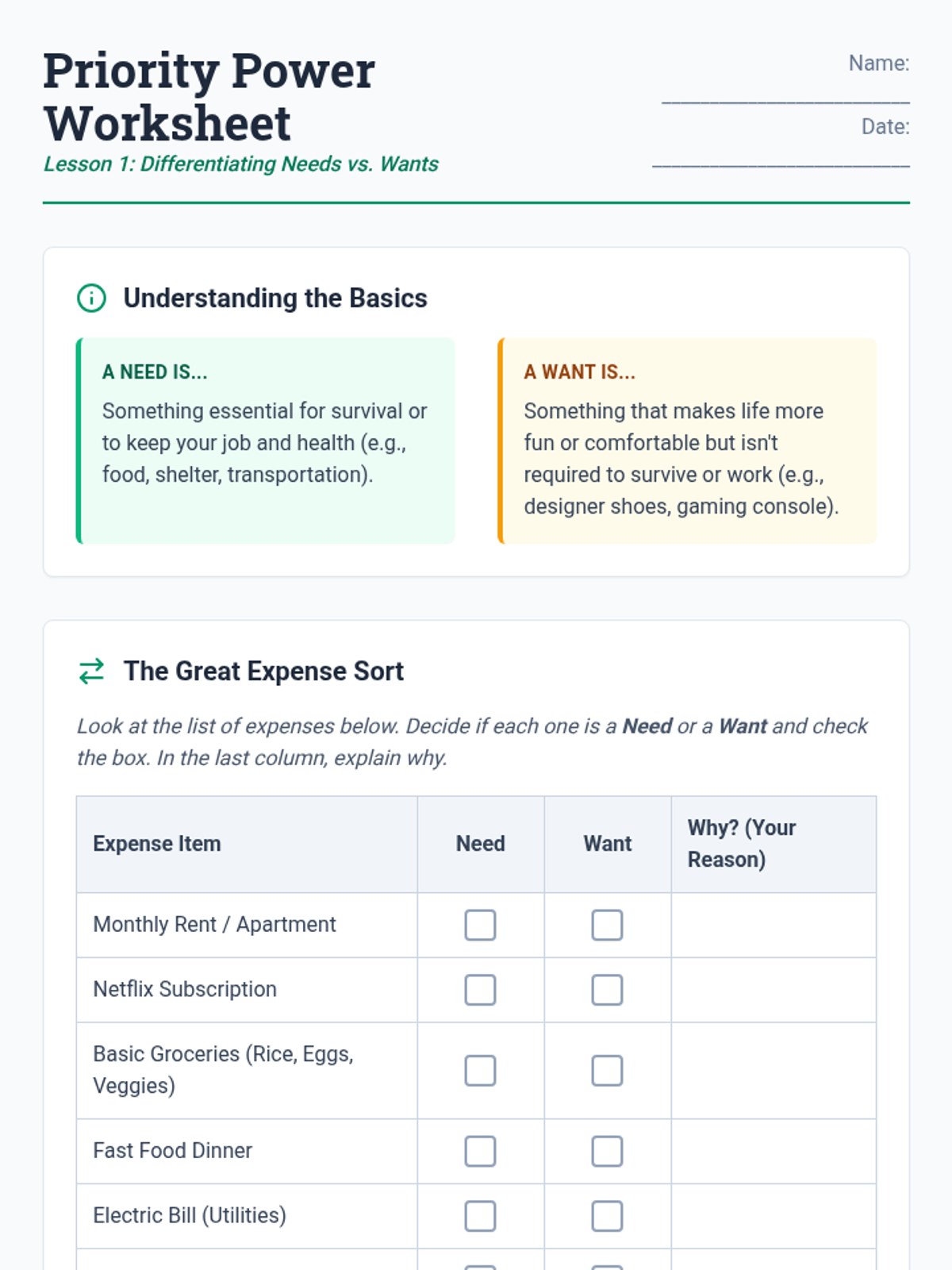Students explore the foundational difference between essential living expenses and discretionary spending. They will categorize various costs and discuss the long-term impact of financial prioritization on independent living.