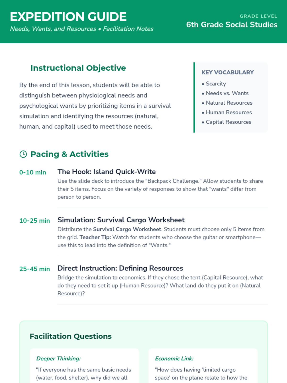 Students distinguish between physiological needs and psychological wants using a desert island survival simulation. They learn to identify natural, human, and capital resources required to meet these needs and wants.