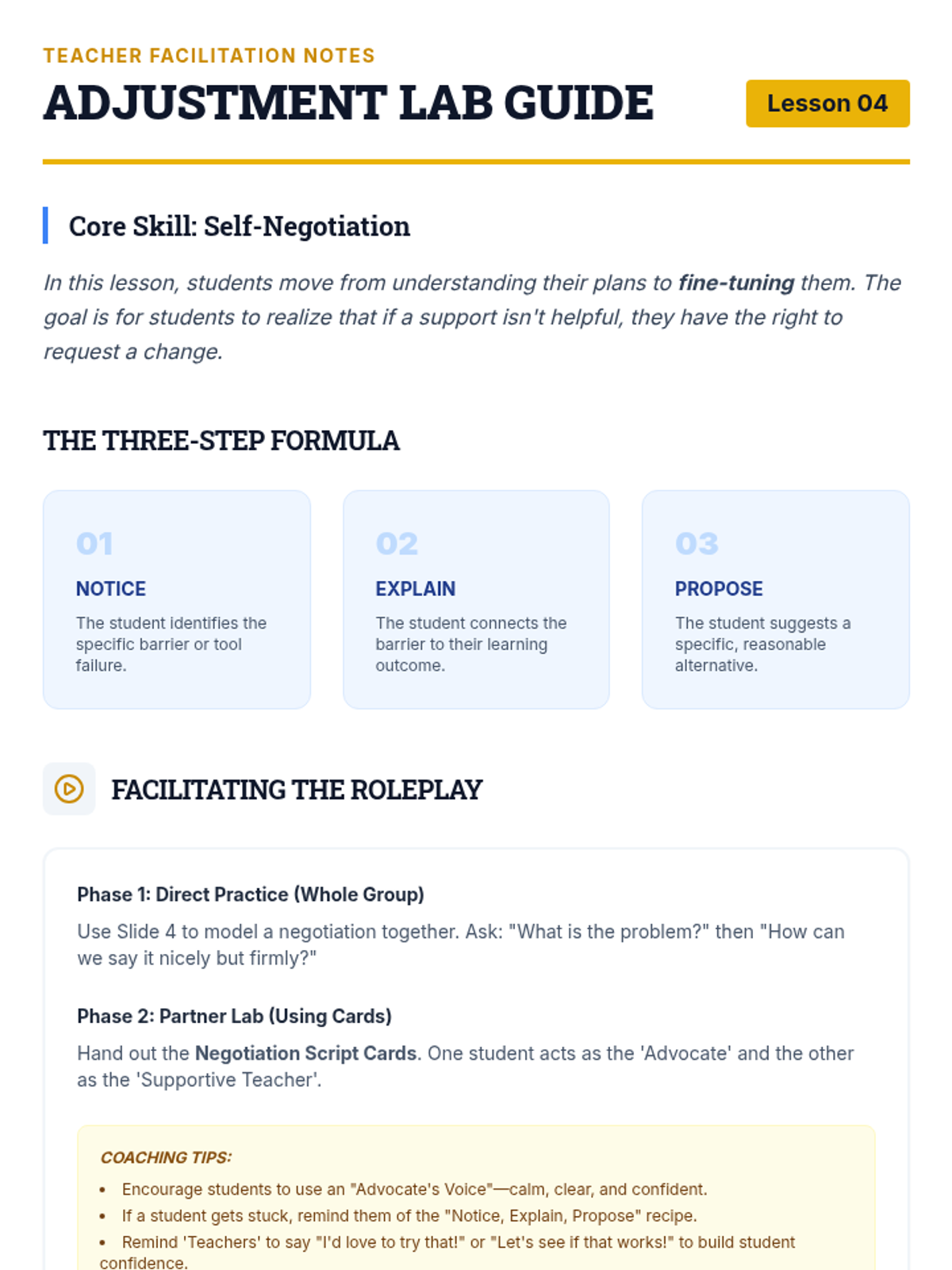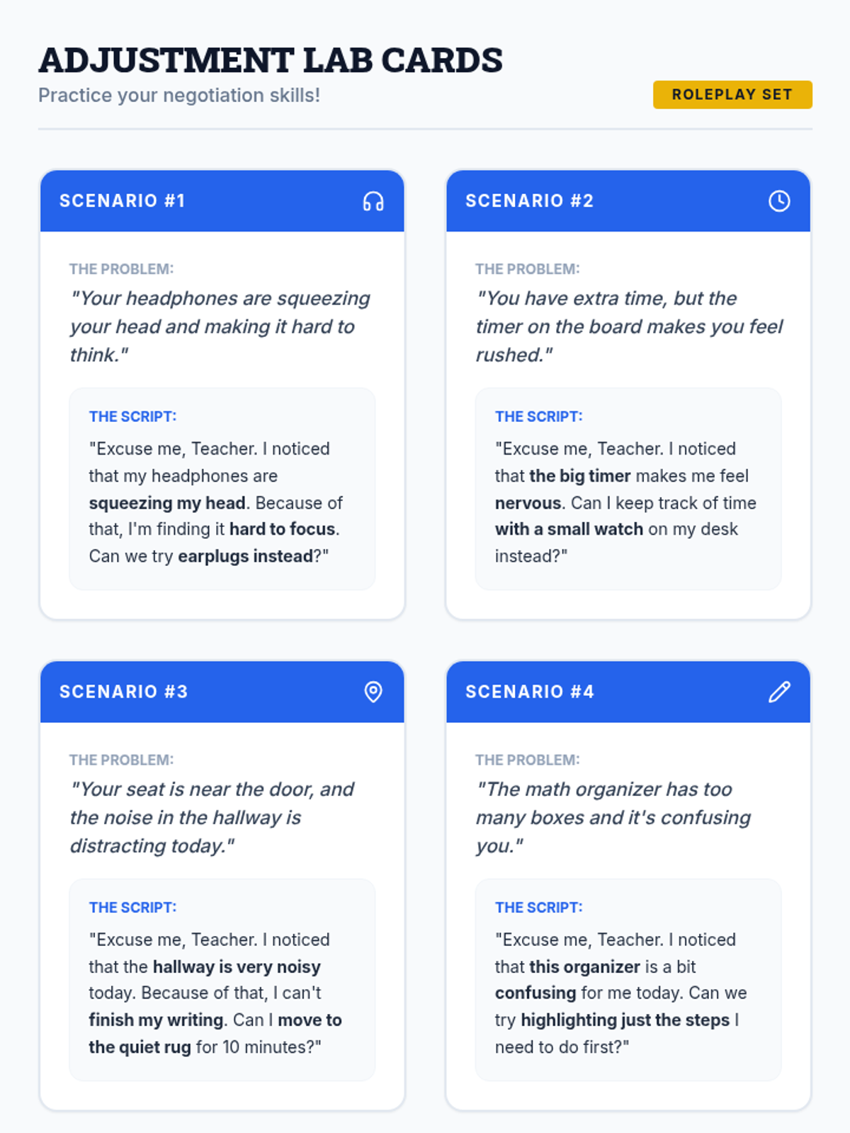 Students practice negotiating adjustments to their supports, learning that it is okay to speak up when an accommodation isn't working as intended.