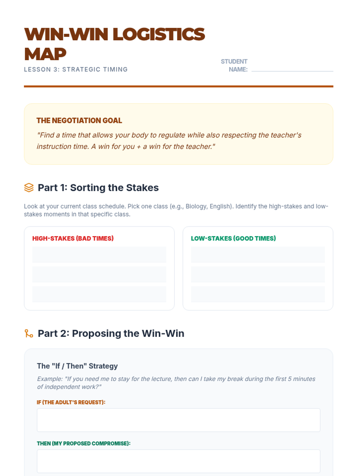 A lesson designed to empower students to understand their IEP goals and practice self-advocacy through scenario-based roleplay. Students will learn the 'Blueprinting' method for communicating their needs effectively to teachers and staff.