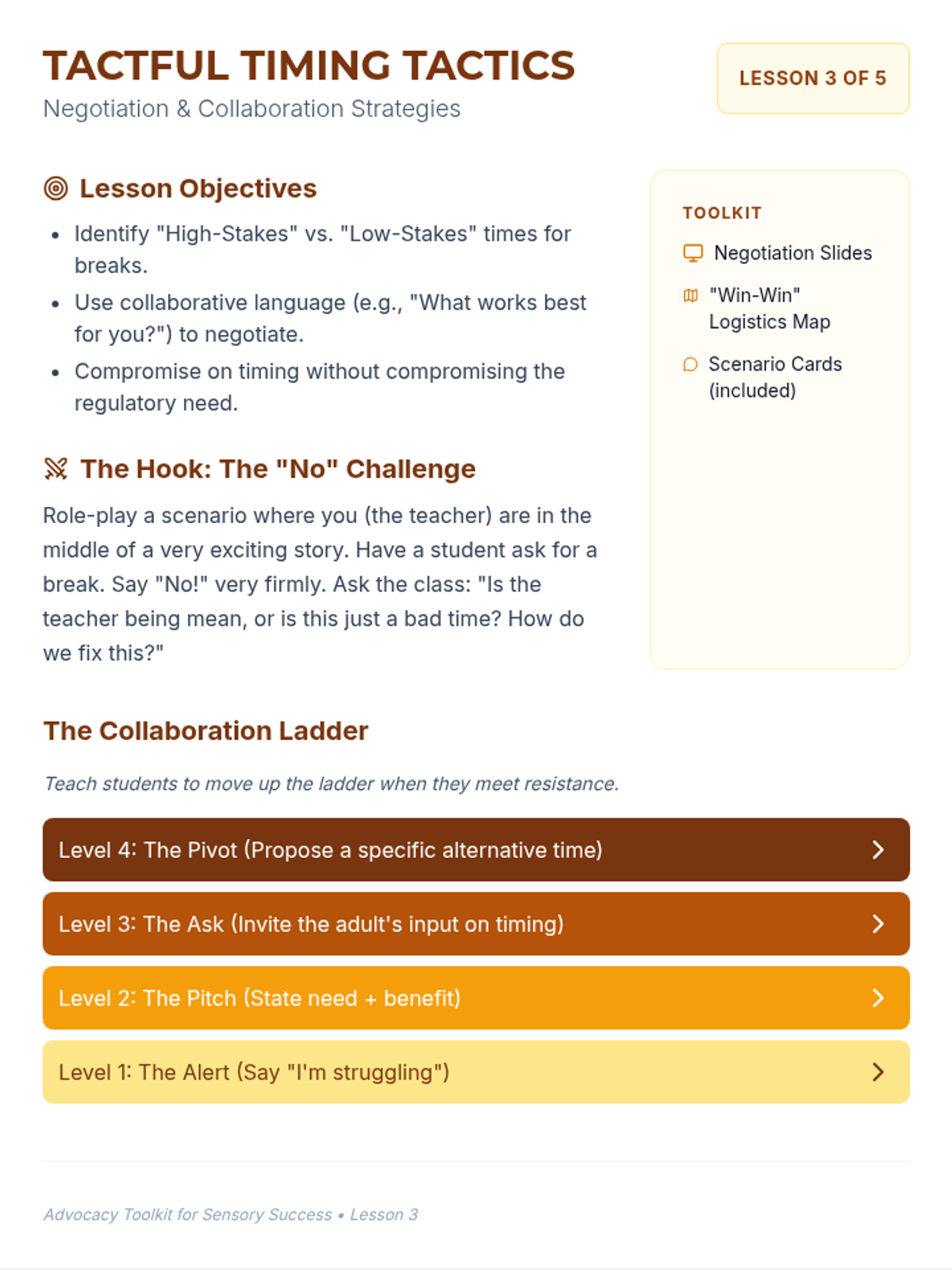 A focused session on postsecondary self-advocacy, teaching students with learning differences how to communicate their needs to professors and employers. The lesson emphasizes the transition from high school's automatic support to the self-initiated systems of college and the workplace.