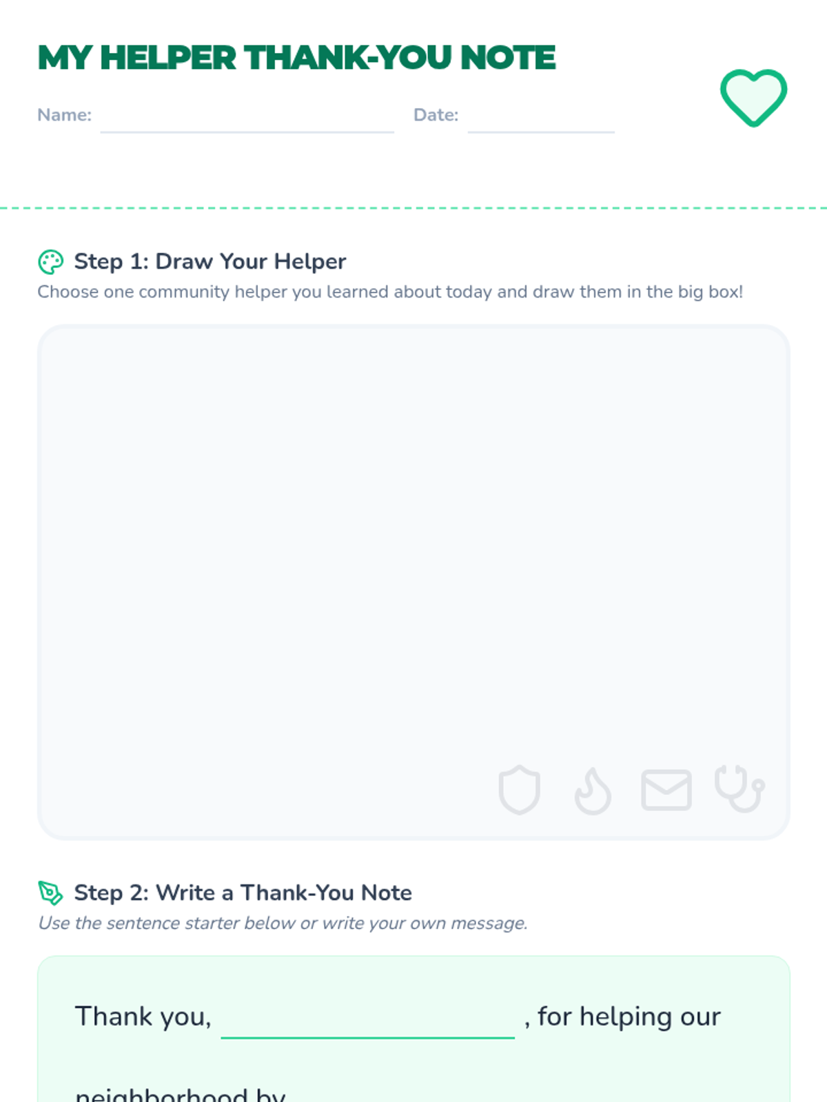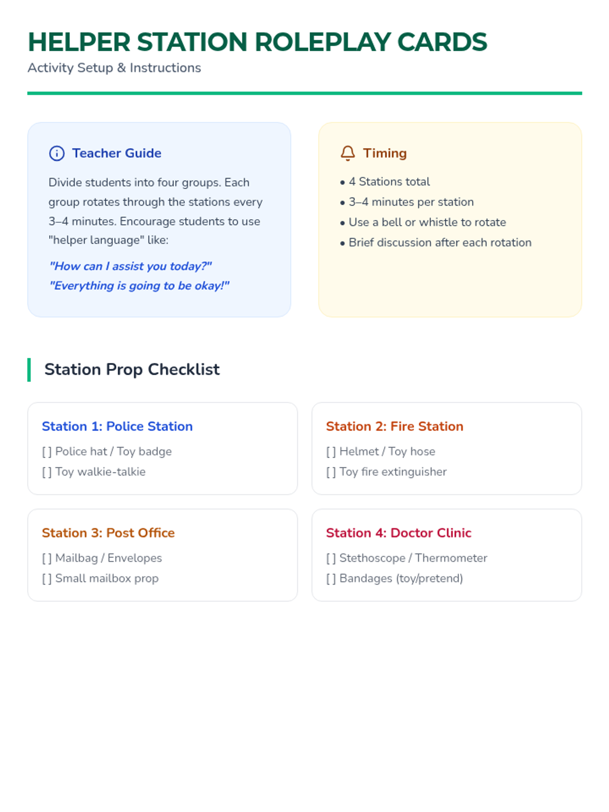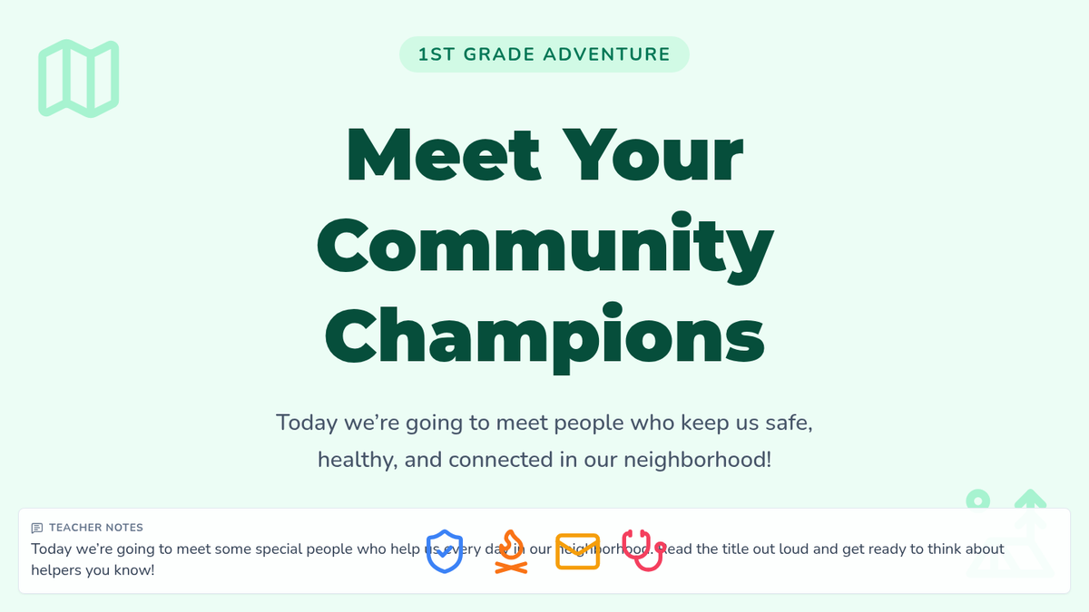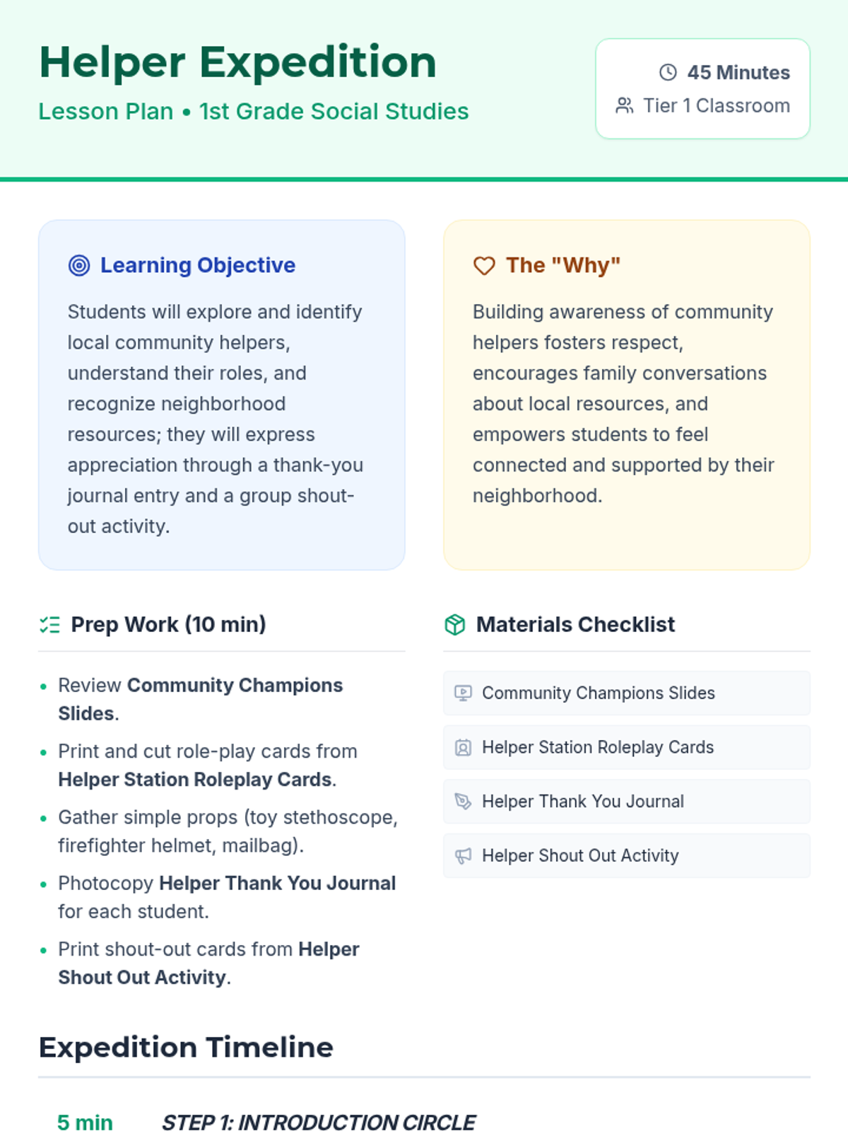 A 45-minute interactive lesson for 1st graders to explore community helpers, their roles, and tools through role-play and creative expression.