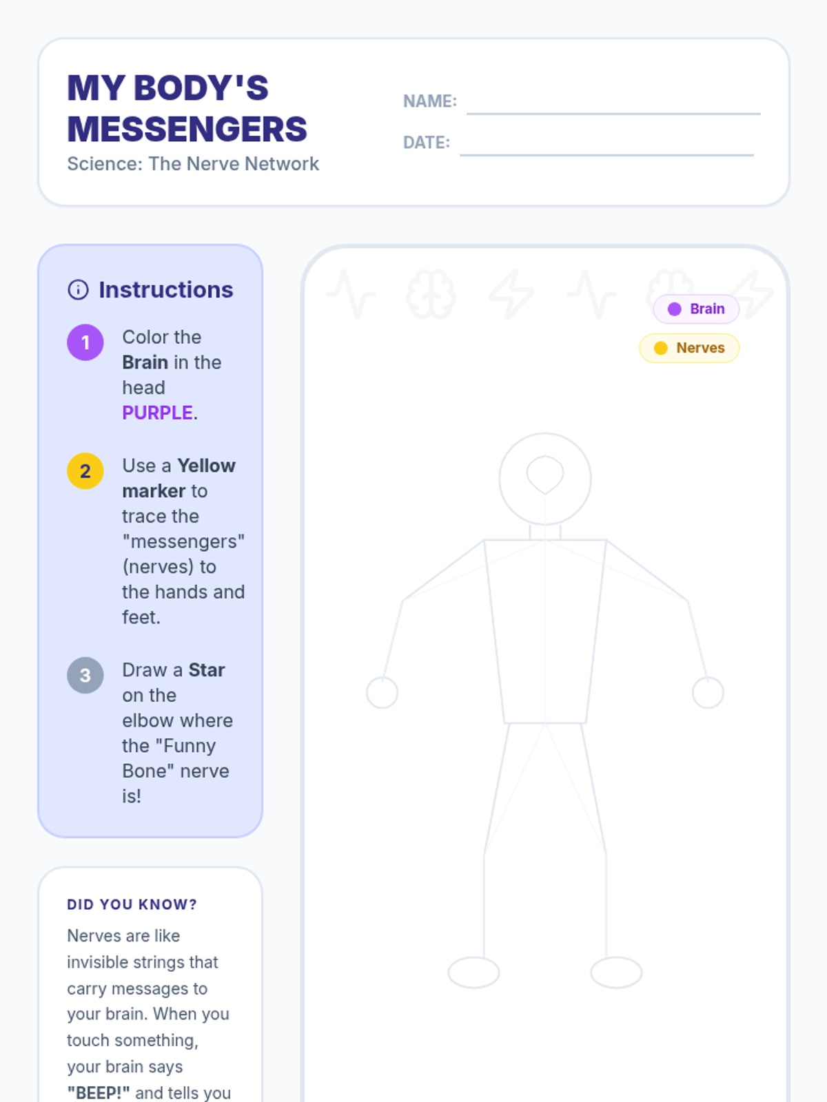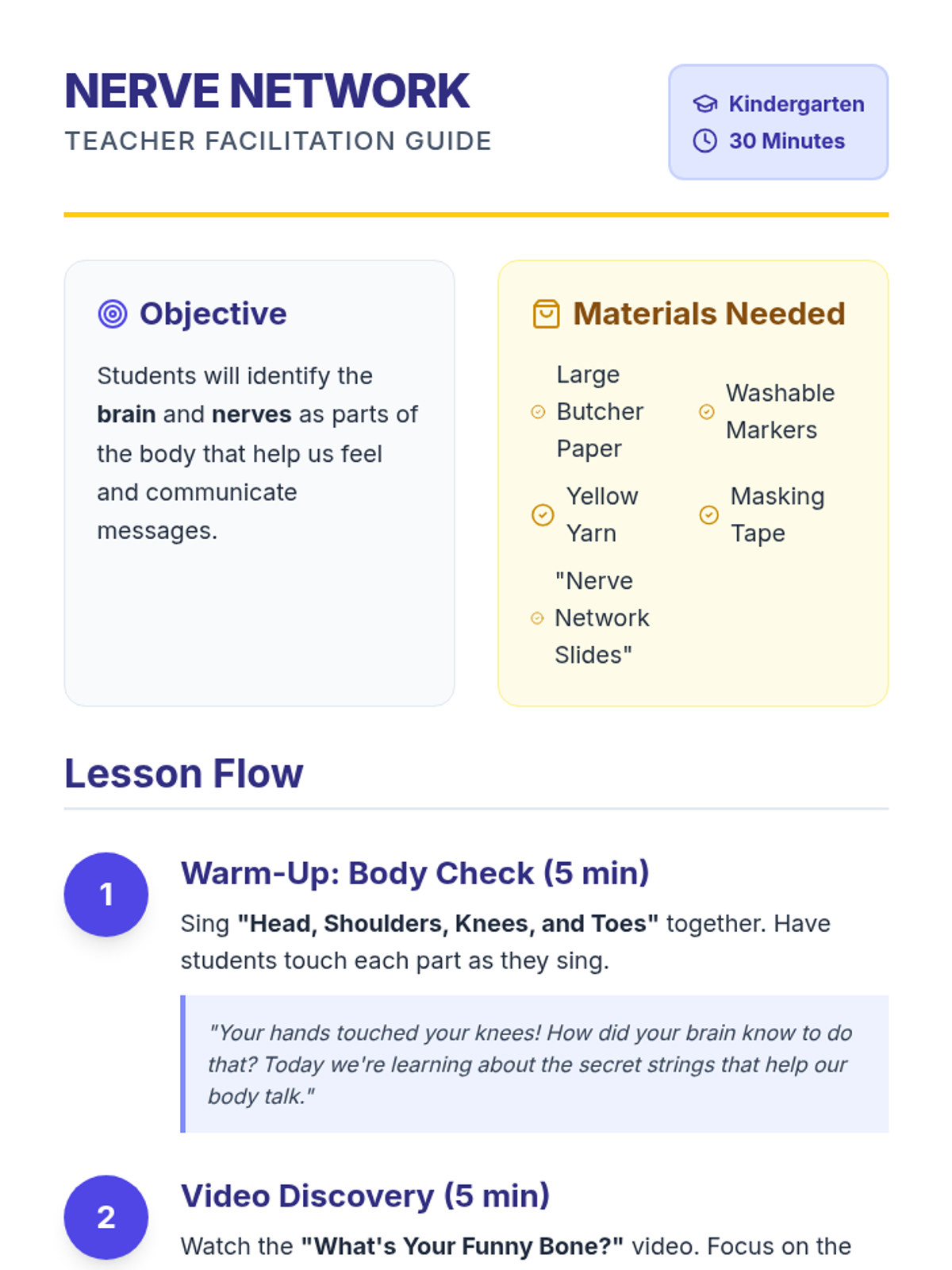A Kindergarten science lesson exploring how the brain and nerves work together to help us feel, featuring a body-tracing activity with 'yarn nerves'.