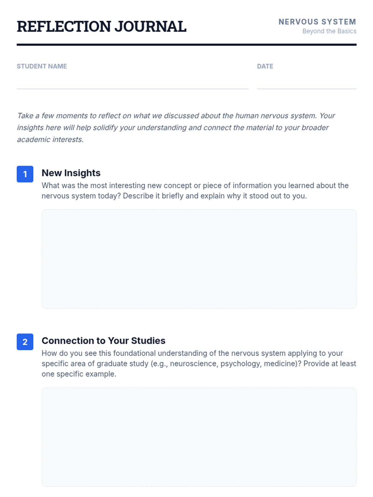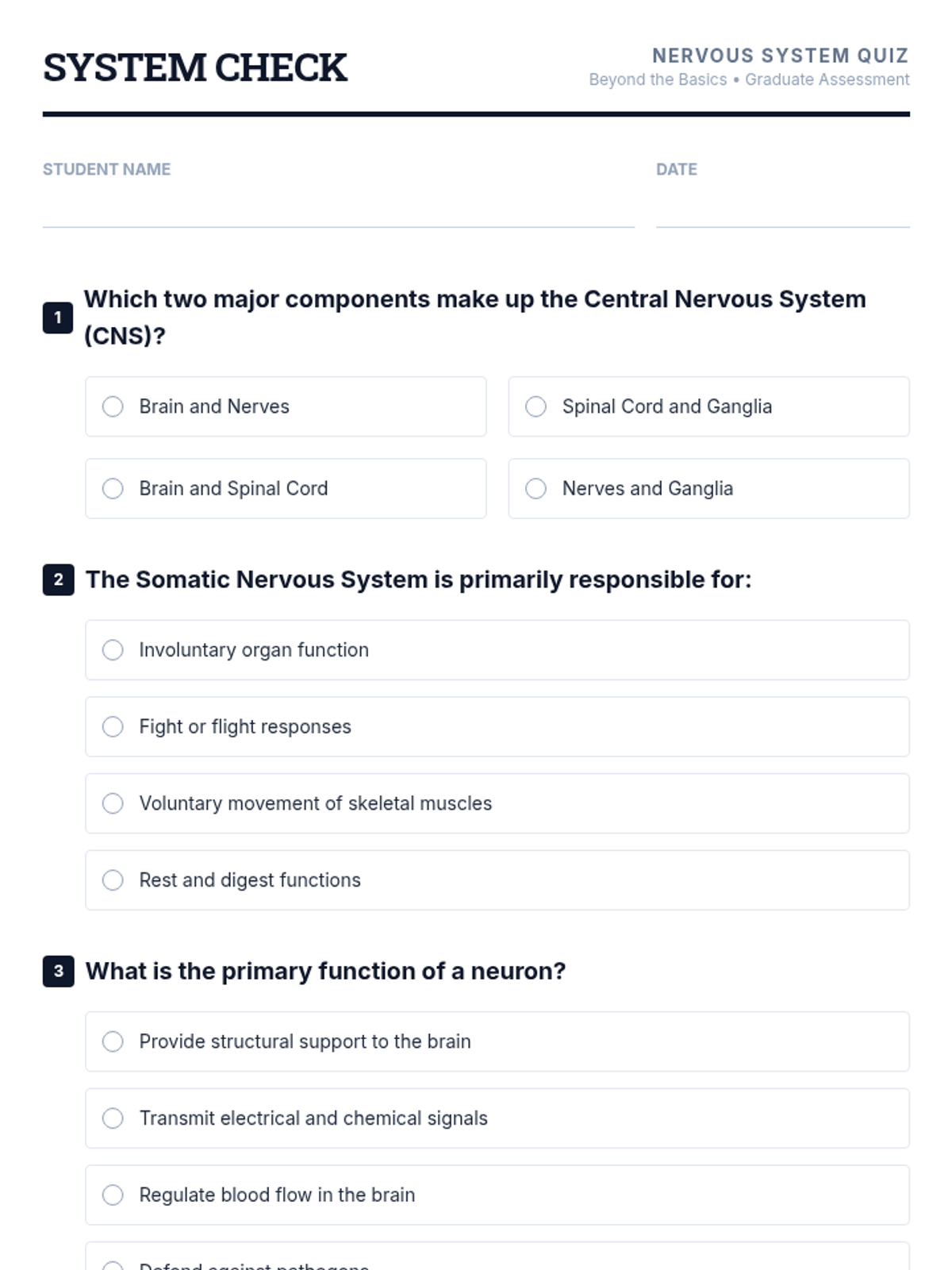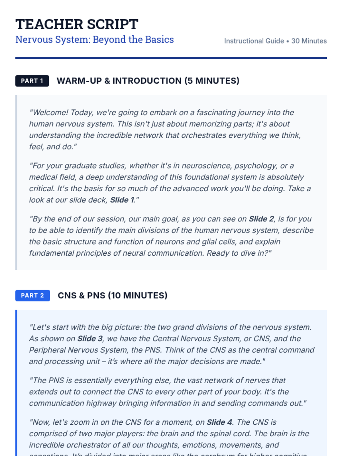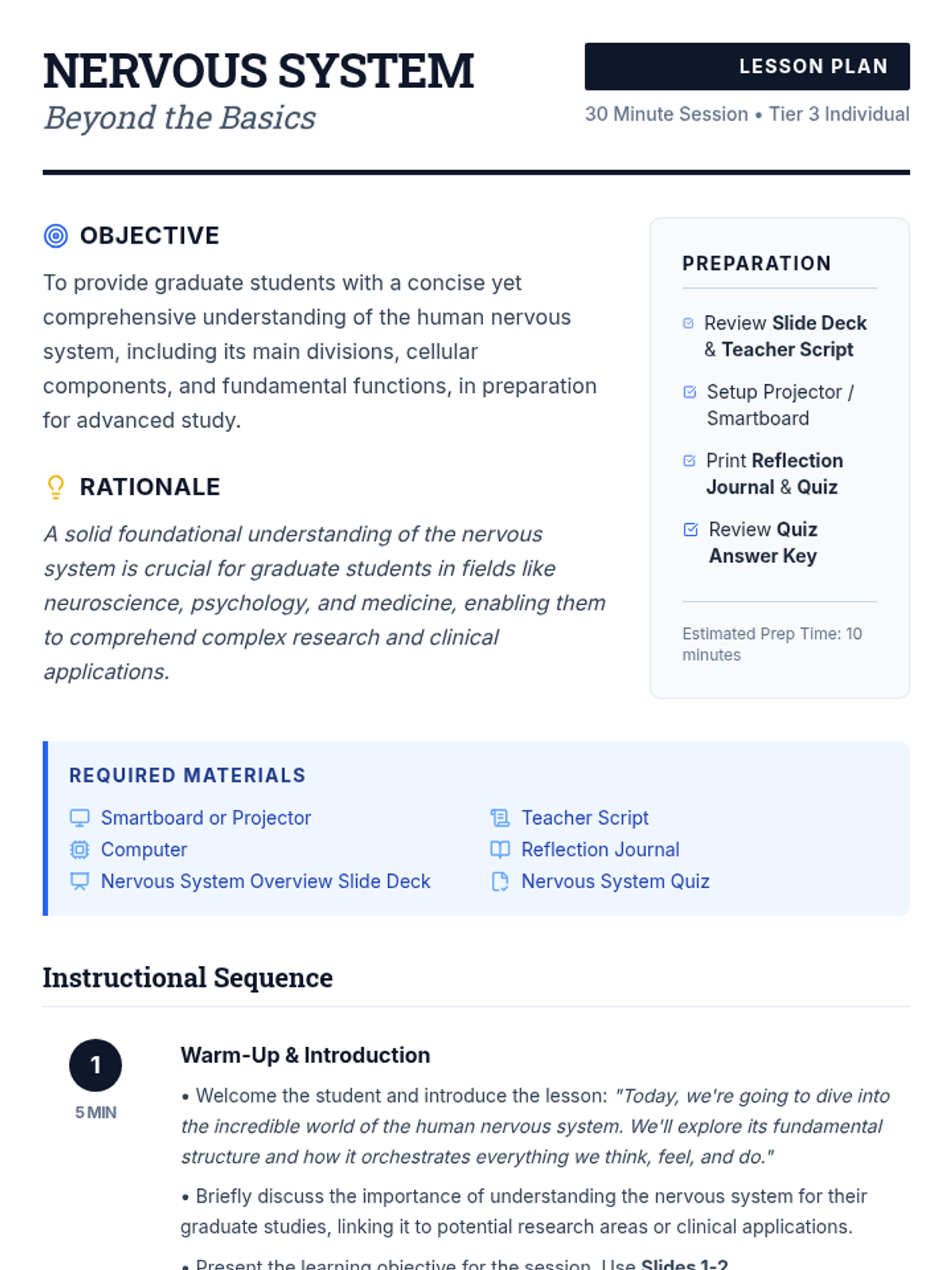 A targeted overview of the human nervous system for graduate-level students, focusing on the Central and Peripheral divisions, neural structure, glial support, and synaptic communication.