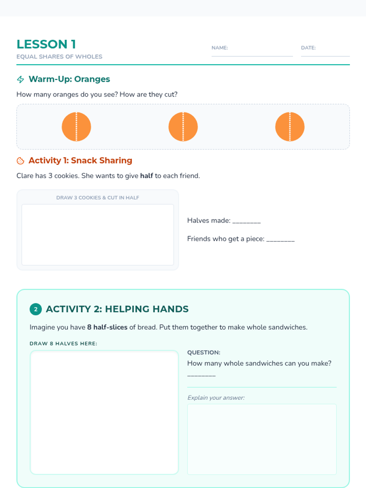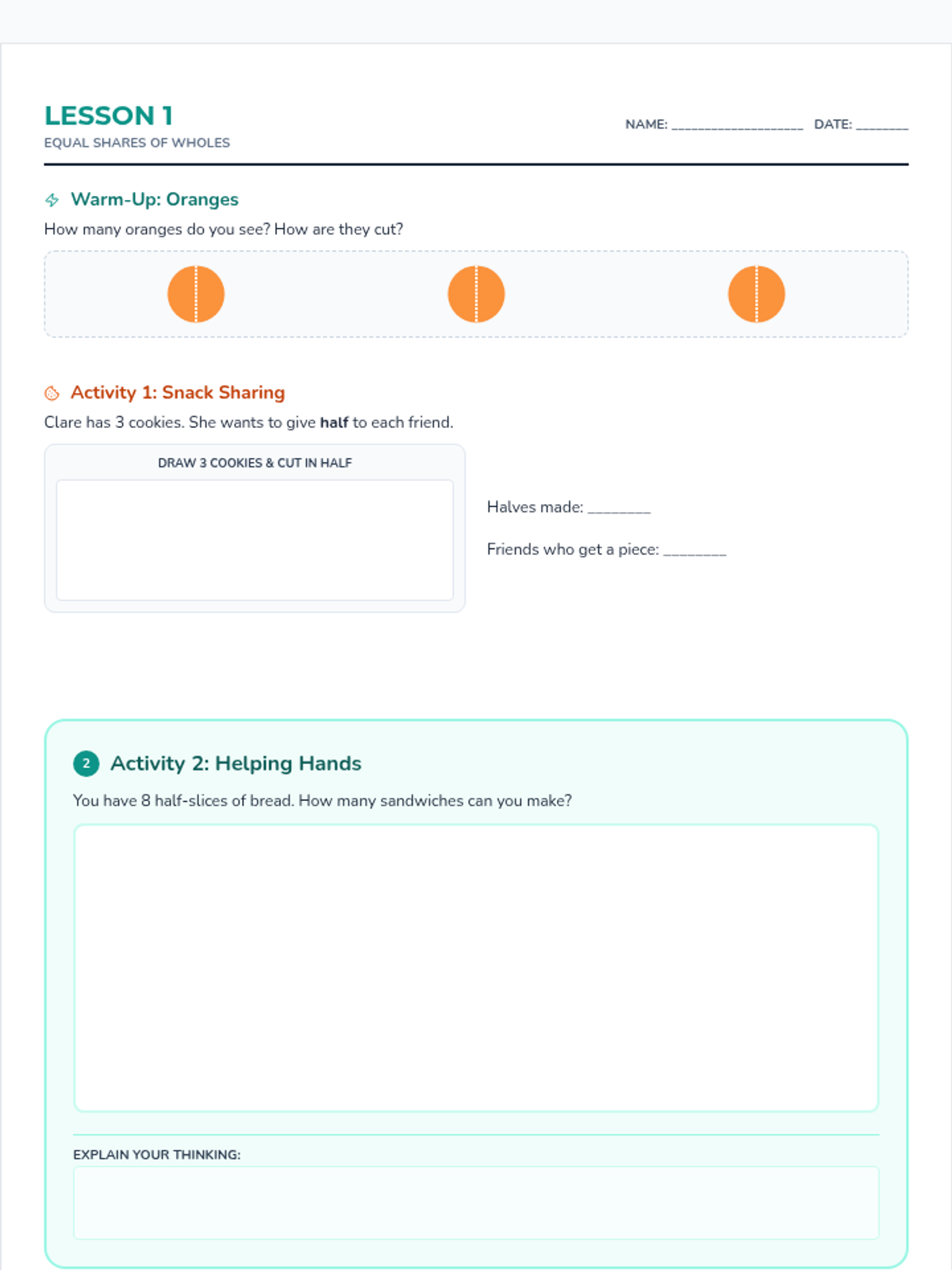 This lesson sequence introduces students to the concept of equal shares and partitioning shapes into halves, thirds, and fourths, using repeated addition to bridge the gap between parts and wholes. Students explore these concepts through hands-on activities with food-themed visuals and classroom objects.