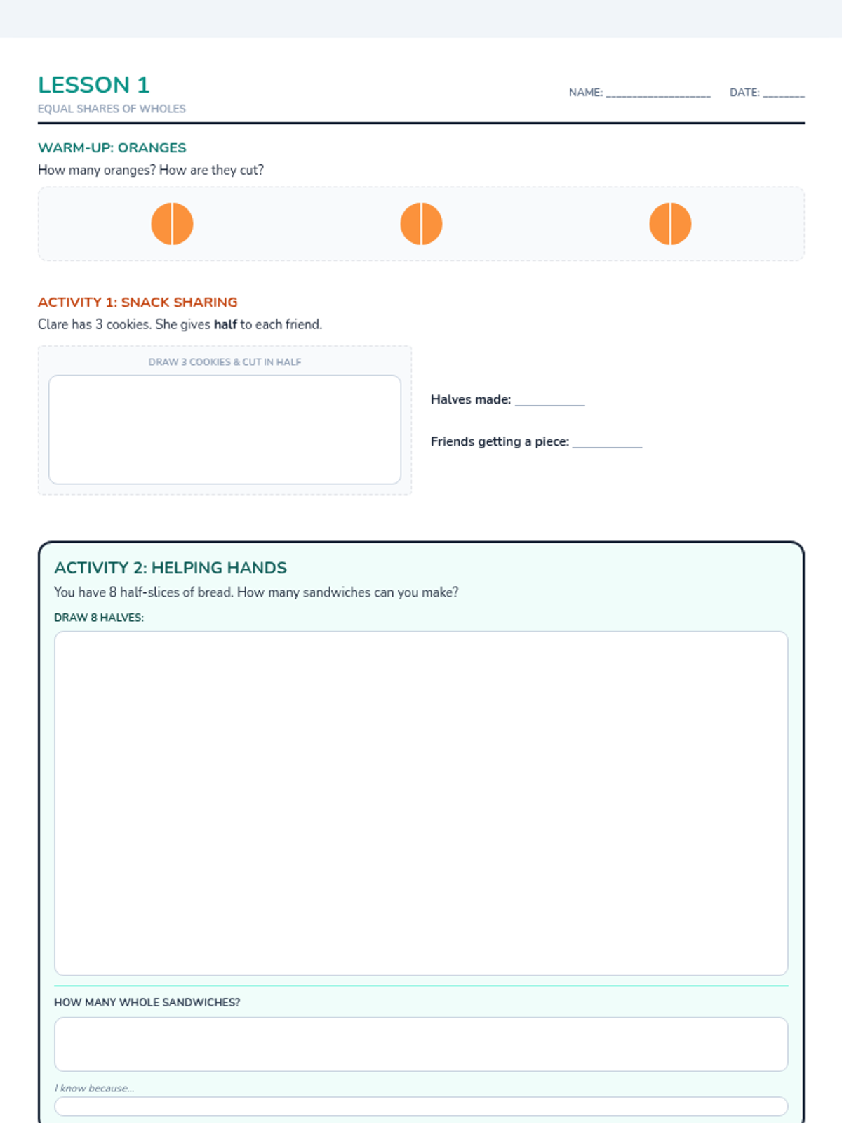 A series of activities focusing on 2nd-grade partitioning and skip counting concepts, adapted from Imagine IM Grade 4 materials. Students explore halves, thirds, and fourths through visual models and real-world snack scenarios.