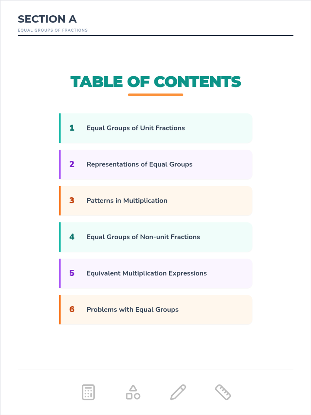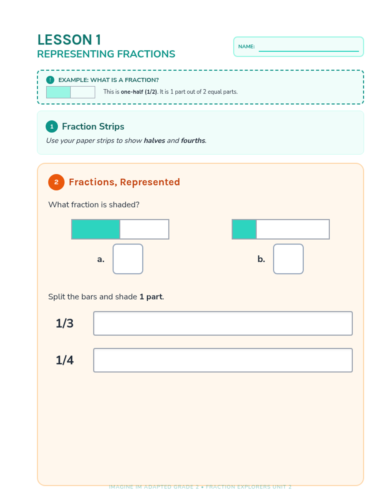 A series of activities for Section B, adapted for 2nd-grade students. This lesson focuses on combining and taking away equal shares (halves, thirds, and fourths) through visual models and simple number lines, emphasizing partitioning and skip counting.