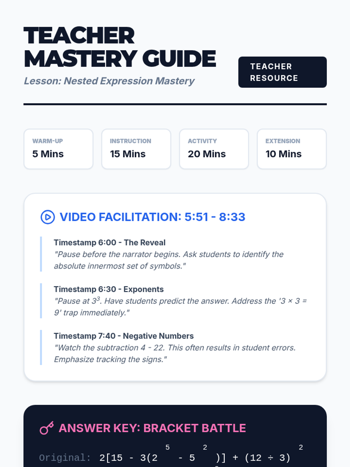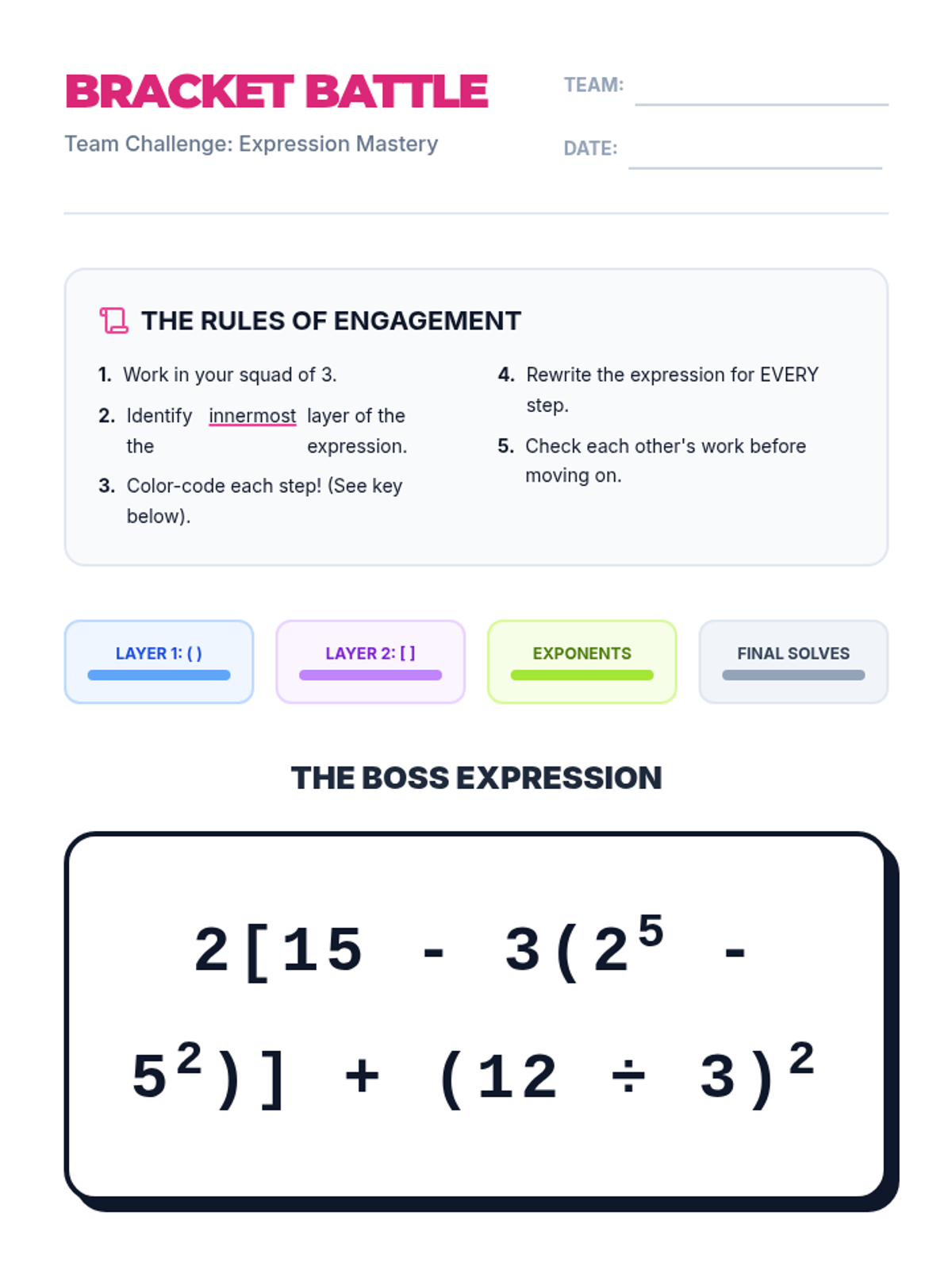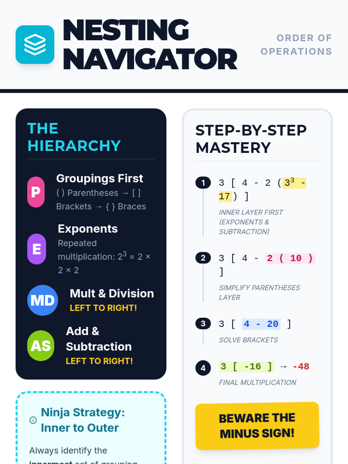 Students will master the art of evaluating complex, nested mathematical expressions by identifying innermost grouping symbols and applying order of operations with precision.