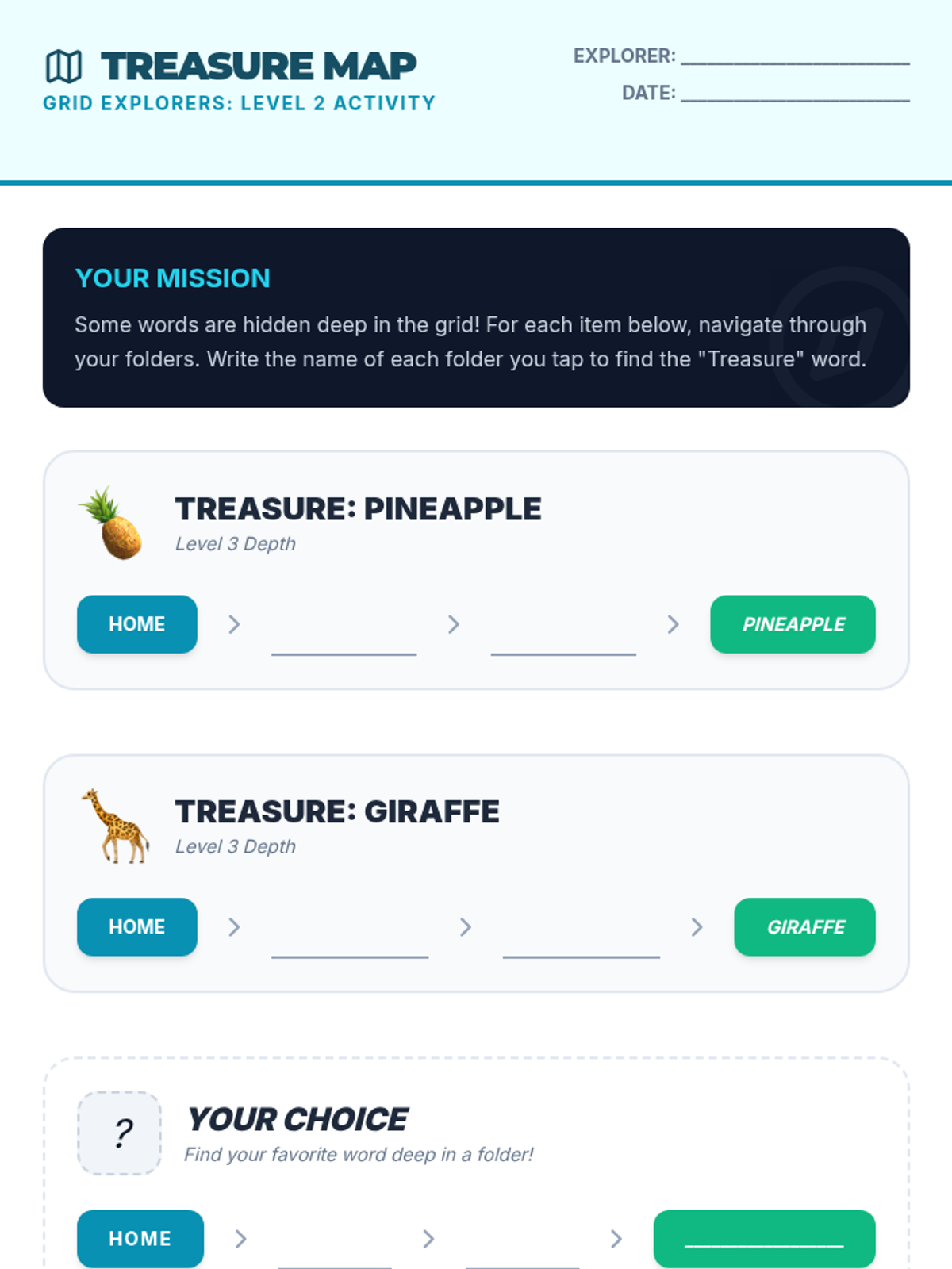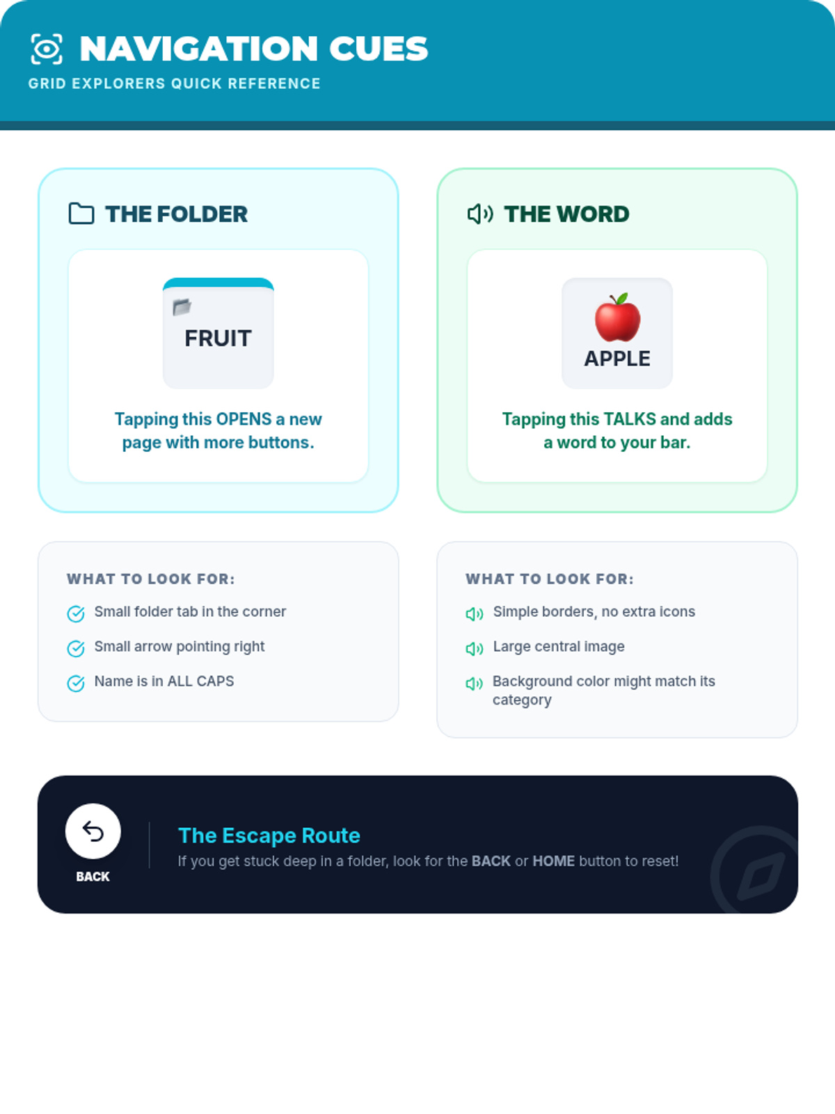 Focuses on navigating through deep folder hierarchies (e.g., Food > Fruit > Apple) and understanding visual cues that distinguish folders from word buttons.