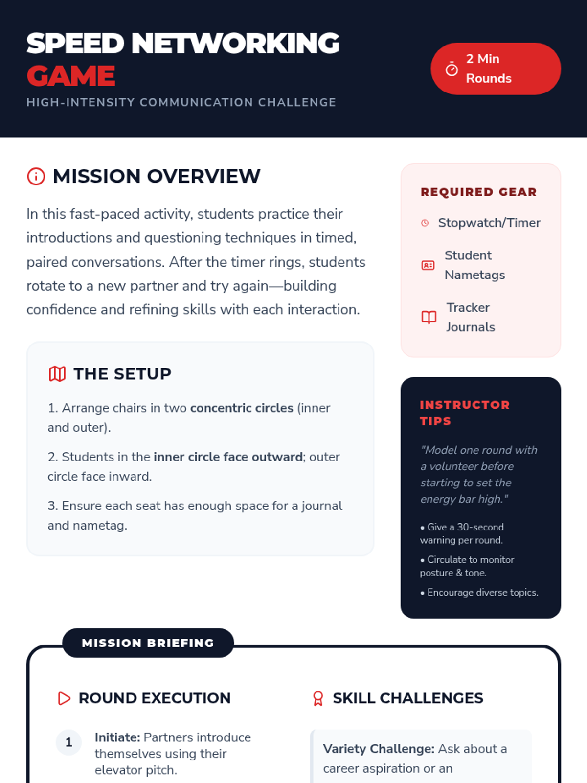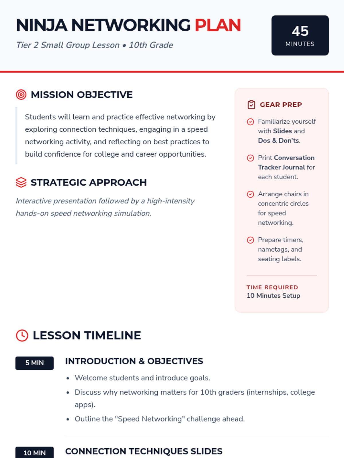 A 10th-grade small-group lesson designed to build confident communication and networking skills. Students practice introductions, active listening, and professional etiquette through a fast-paced speed networking game.