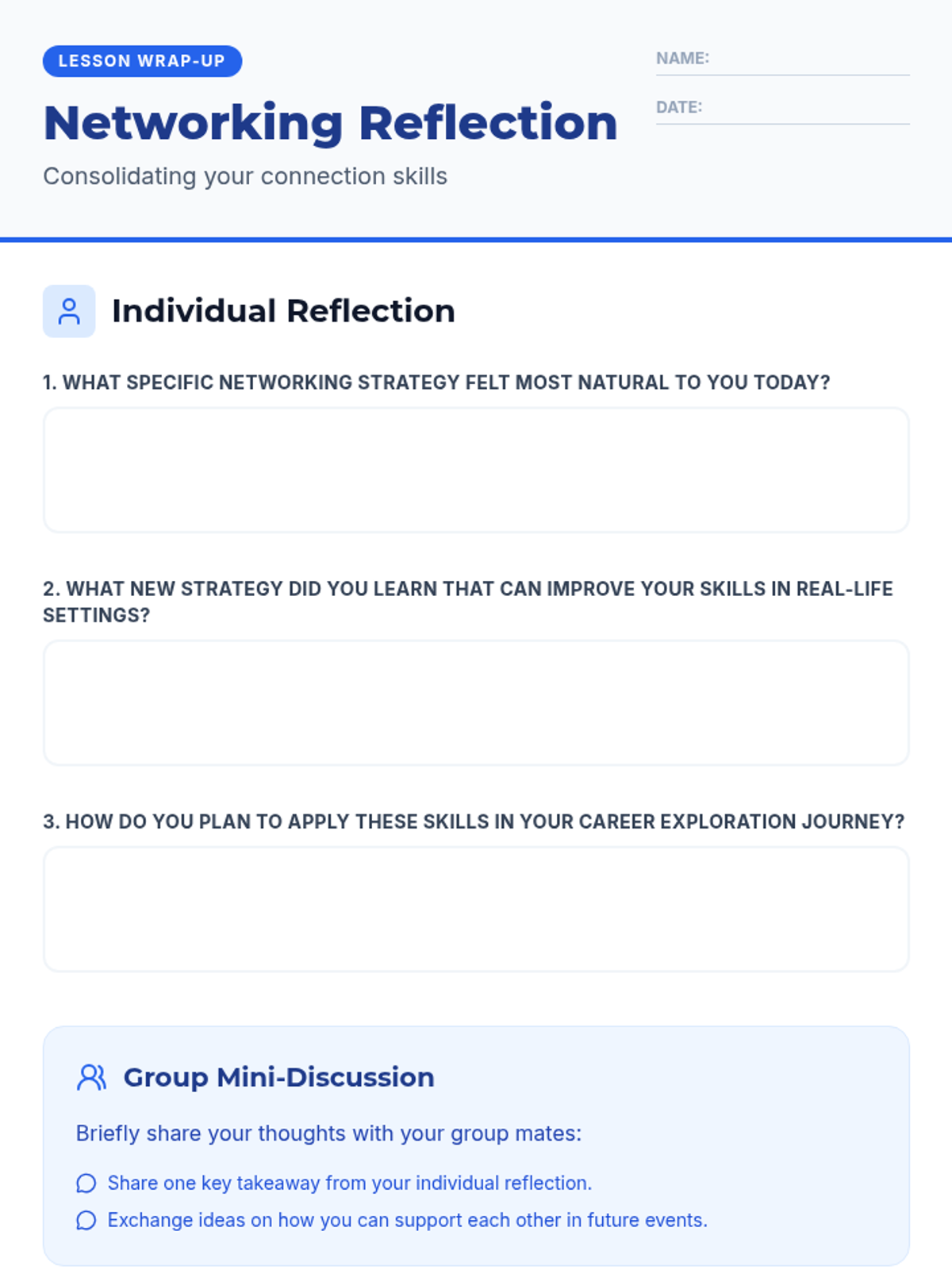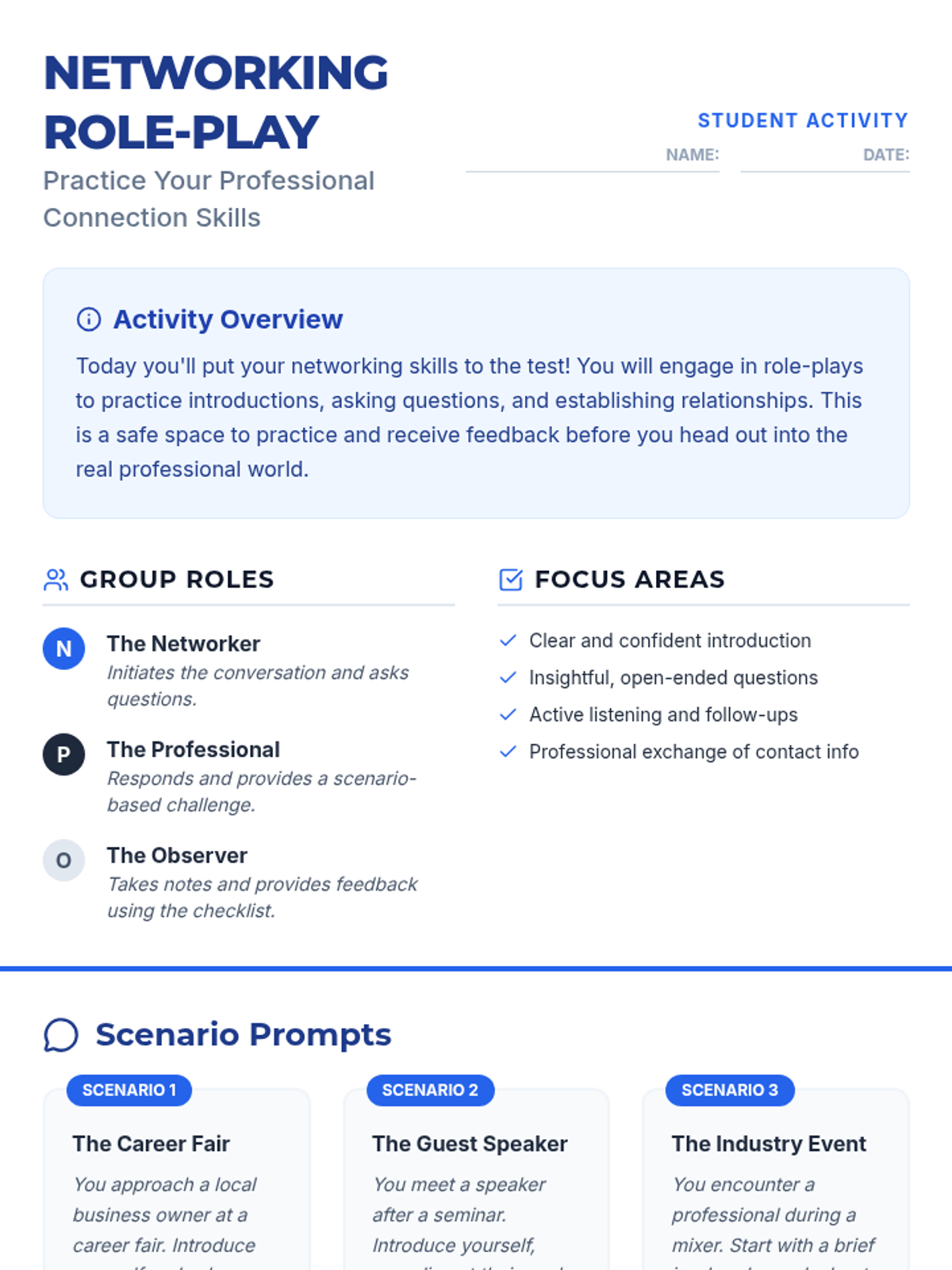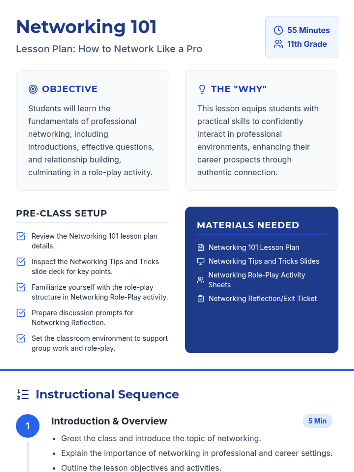 A comprehensive 55-minute lesson for 11th graders on the fundamentals of professional networking, featuring interactive role-plays and practical communication strategies.