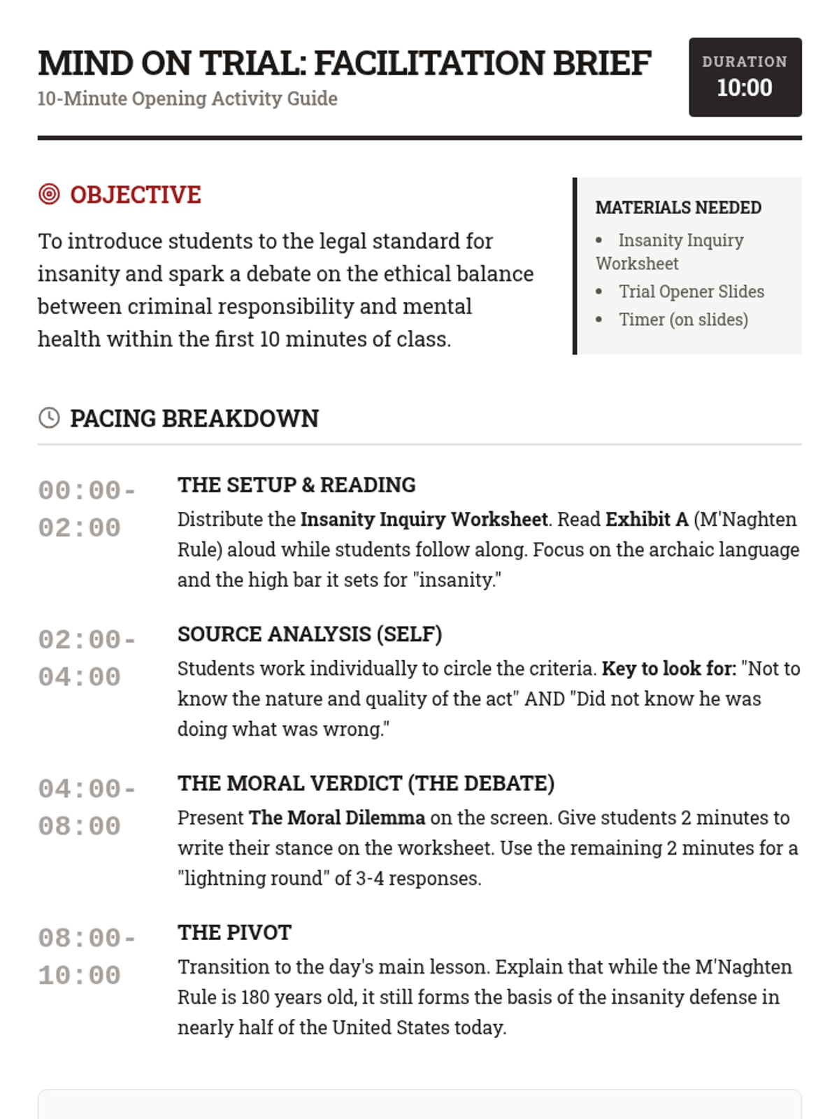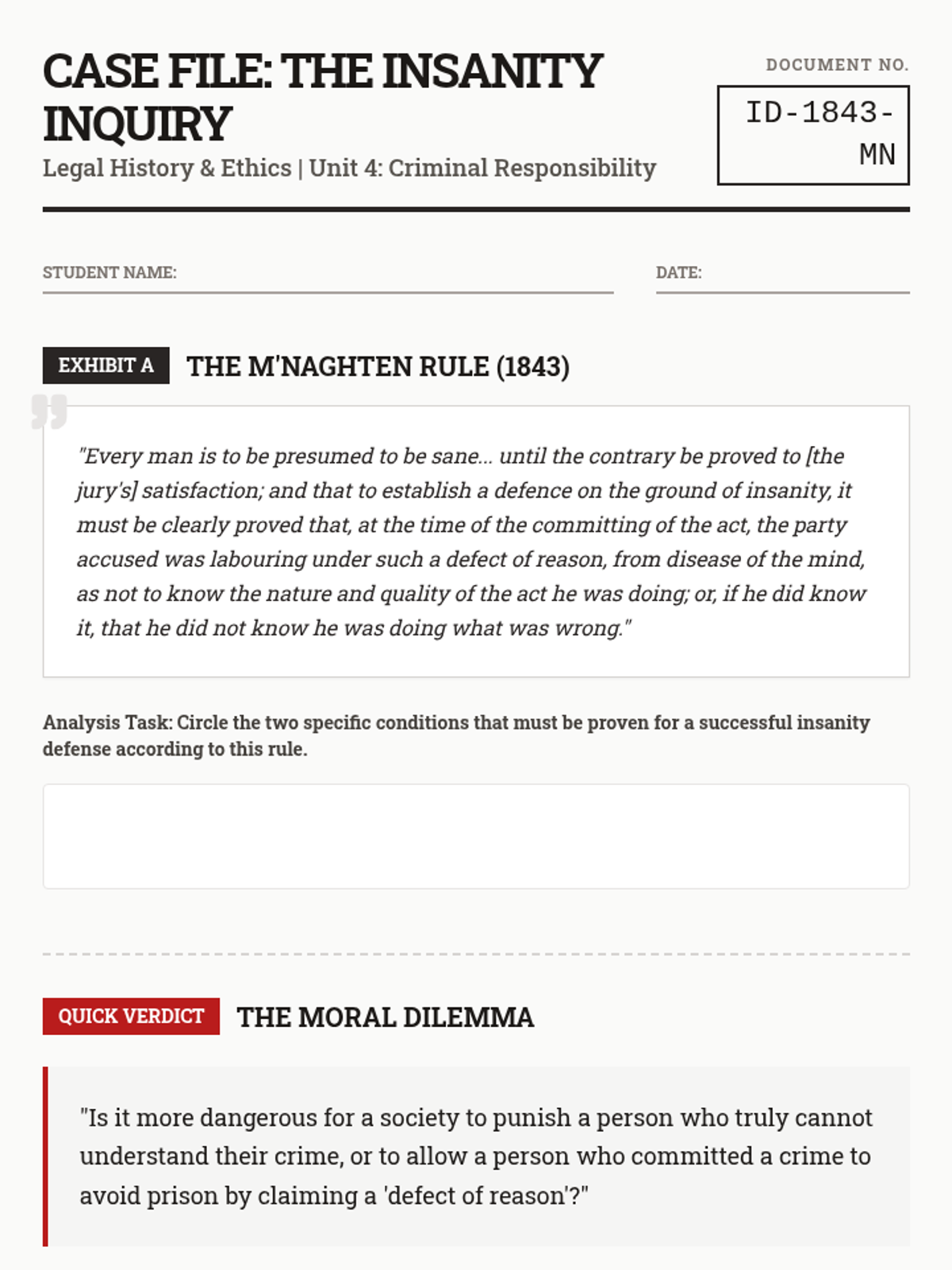 A fast-paced opening activity designed to spark debate and critical thinking about the insanity defense through primary source analysis. Students examine historical legal standards and grapple with the moral complexities of criminal responsibility.