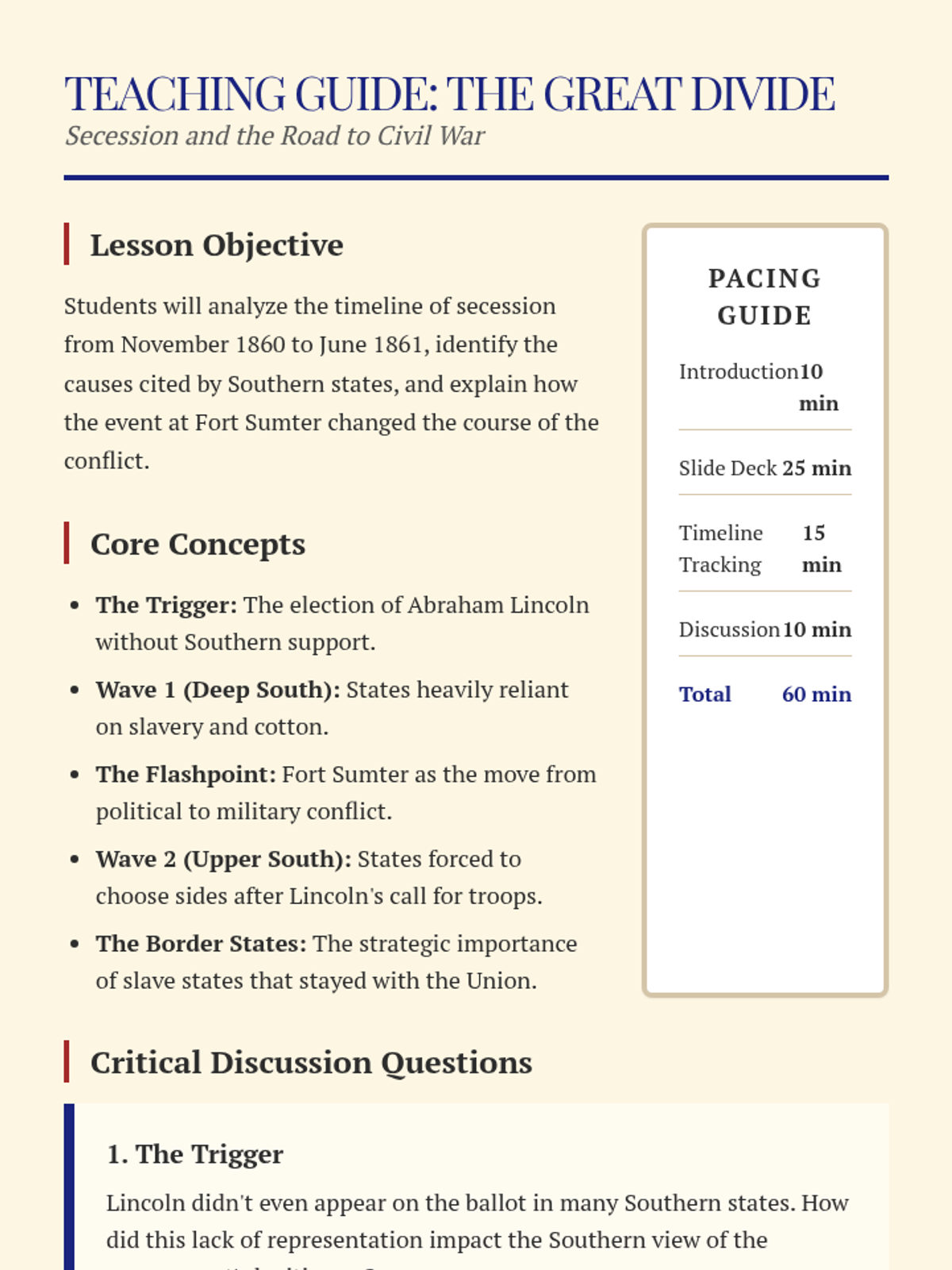 This lesson explores the timeline and motivations behind the secession of Southern states leading up to the US Civil War, focusing on the two distinct waves of departure.