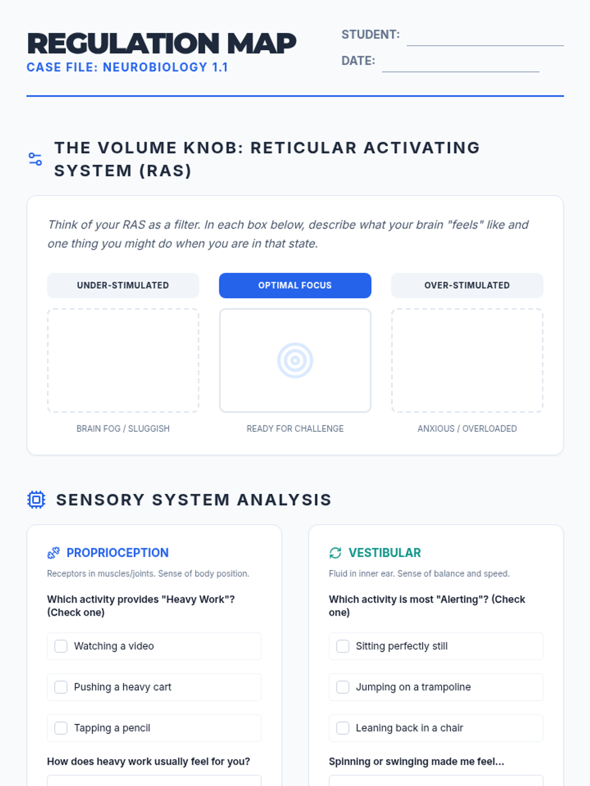 Mapping the brain's response to sensory input through the vestibular and proprioceptive systems, focusing on the Reticular Activating System (RAS).