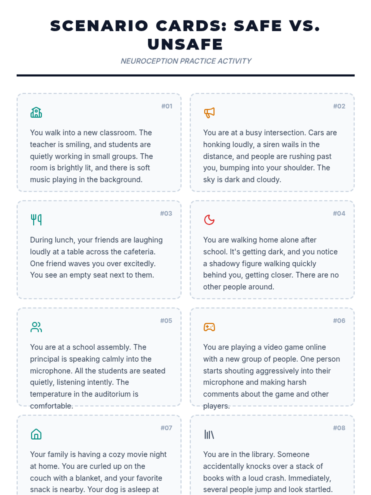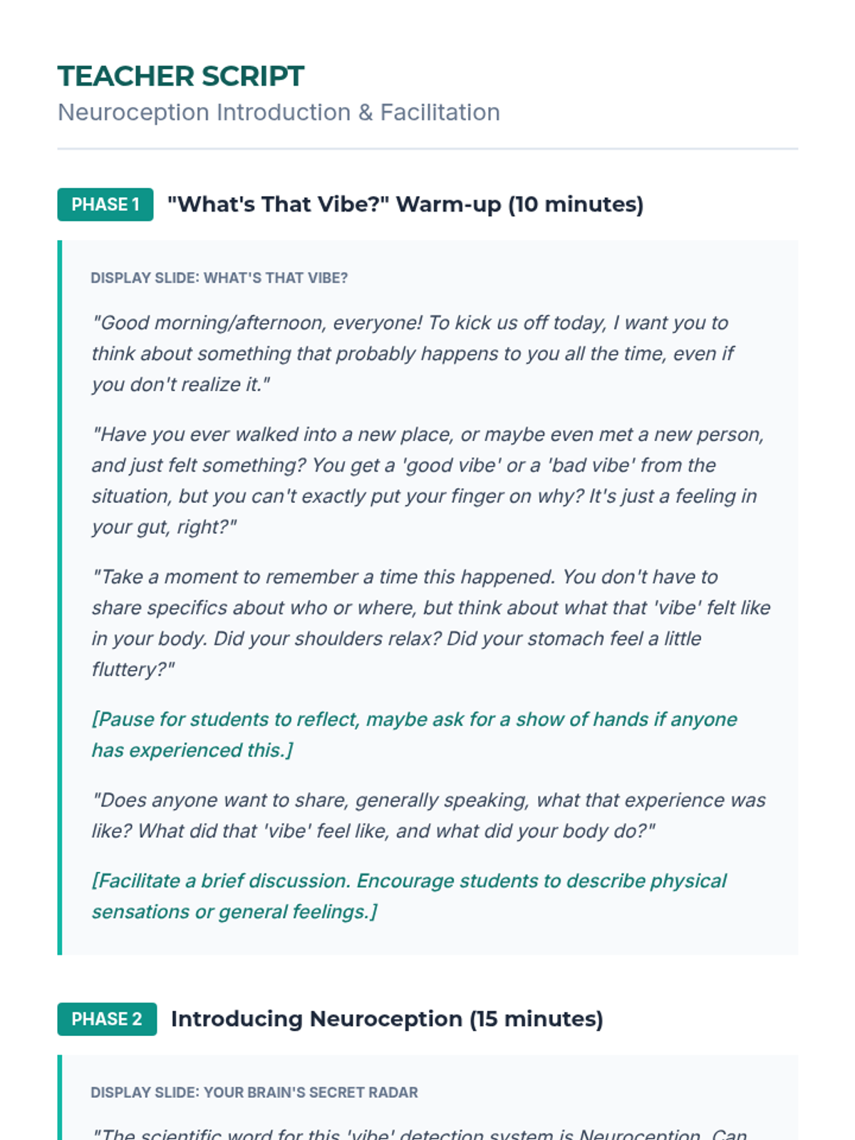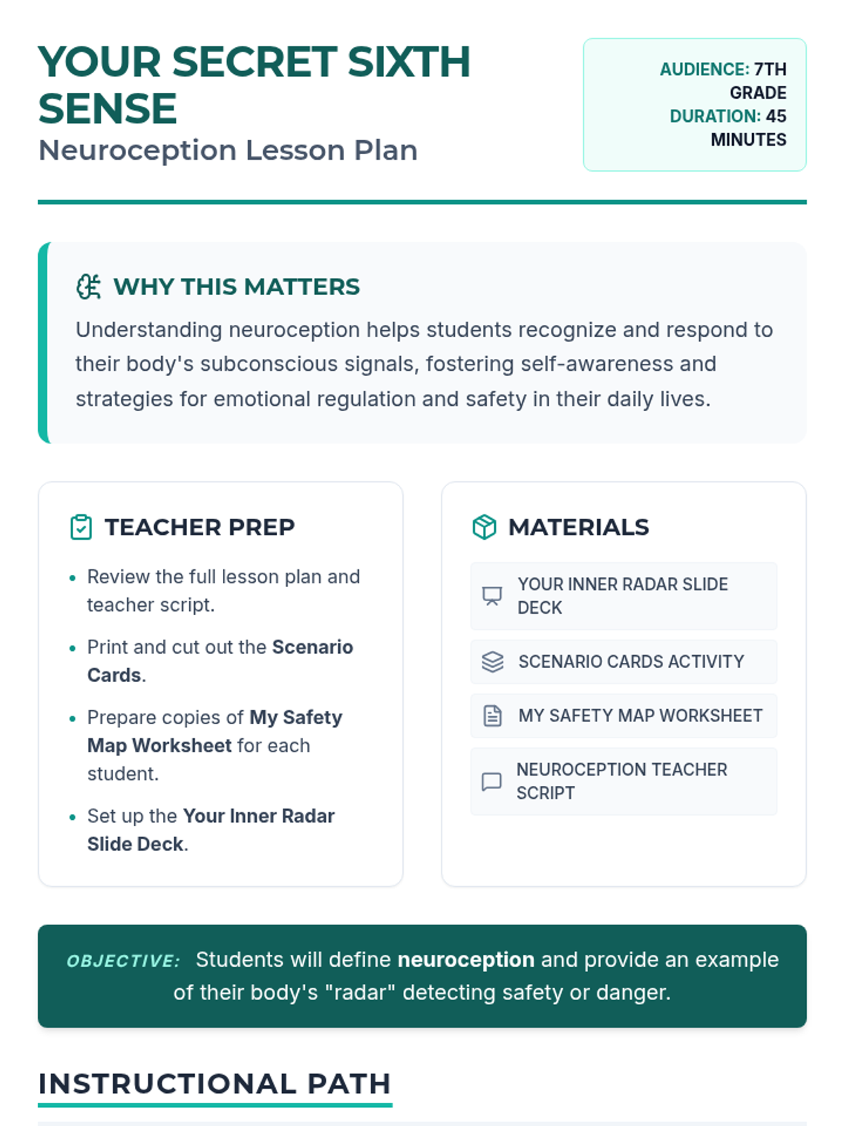 This lesson introduces 7th-grade students to neuroception, their body's subconscious 'radar' for safety and danger, empowering them to recognize and manage their reactions to environmental cues.