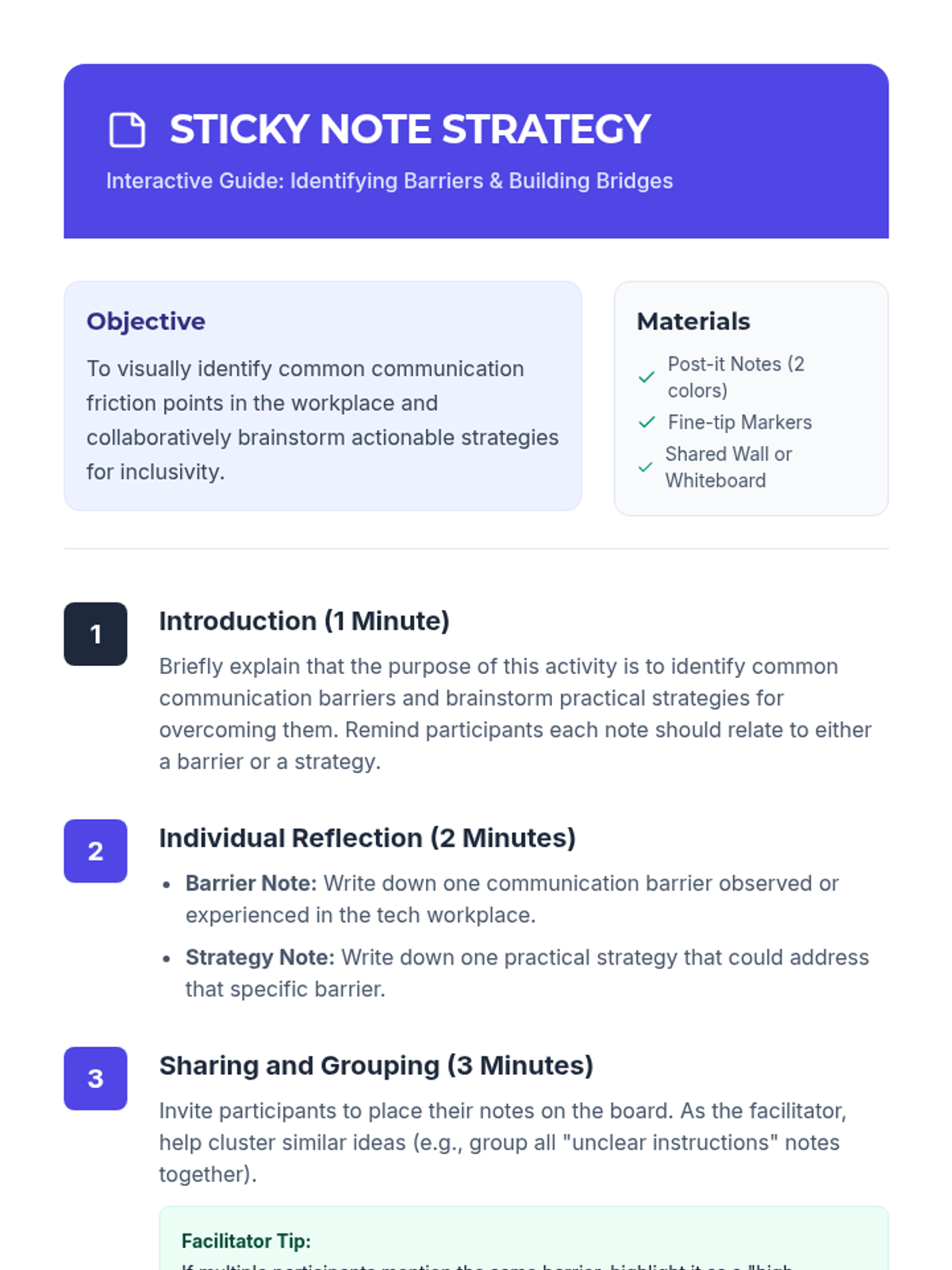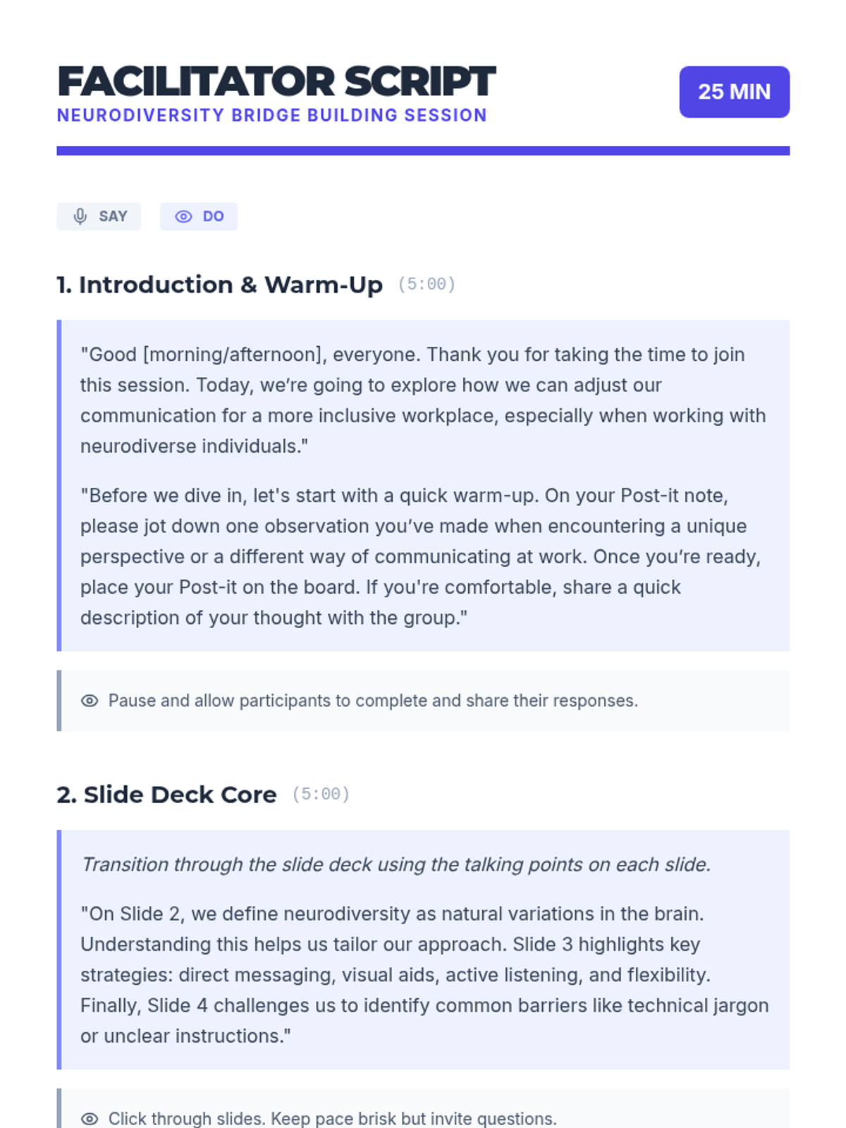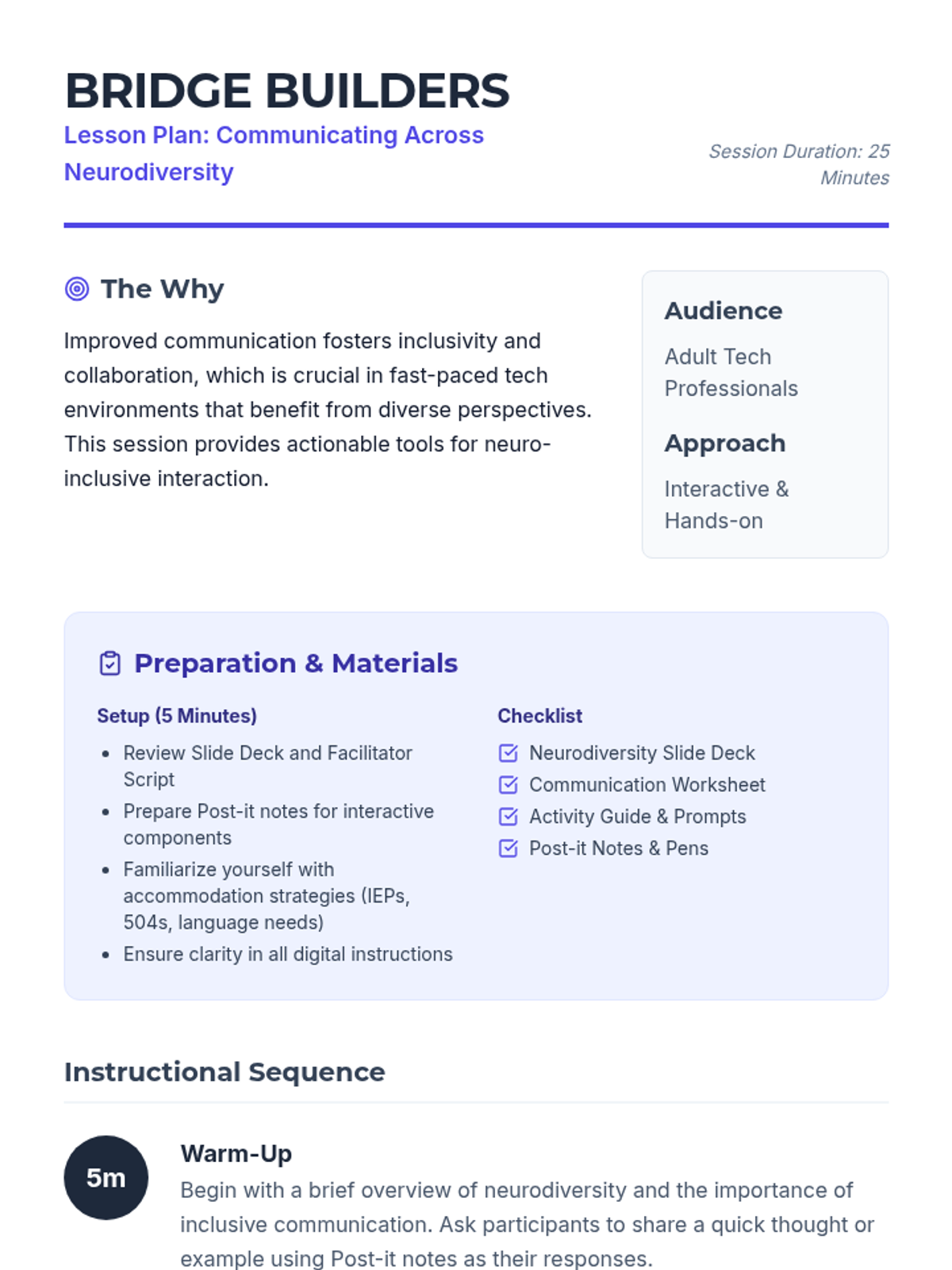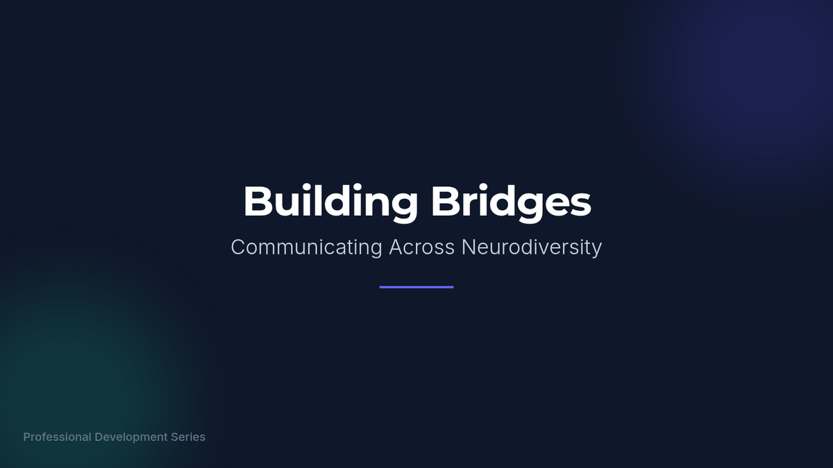 A 25-minute professional development session for tech professionals focused on practical communication strategies for neurodiverse workplaces. Participants engage in interactive activities to identify barriers and build inclusive bridges.