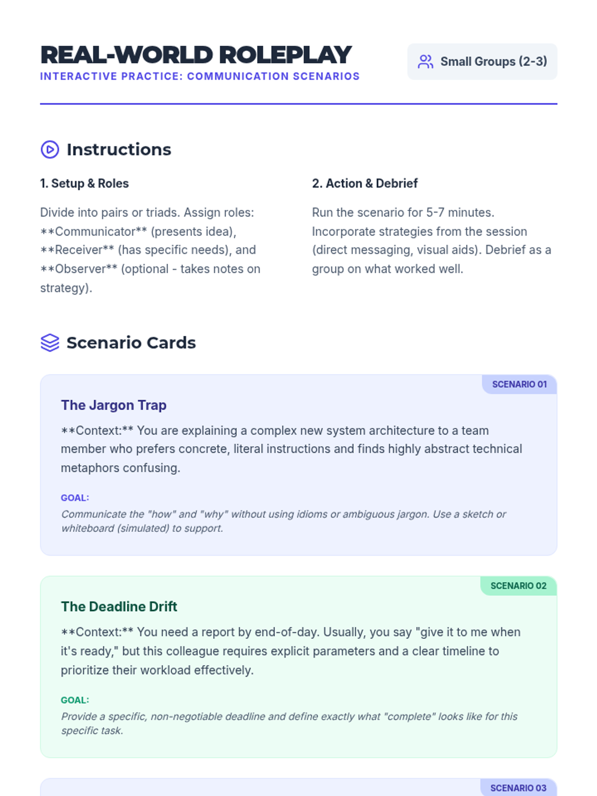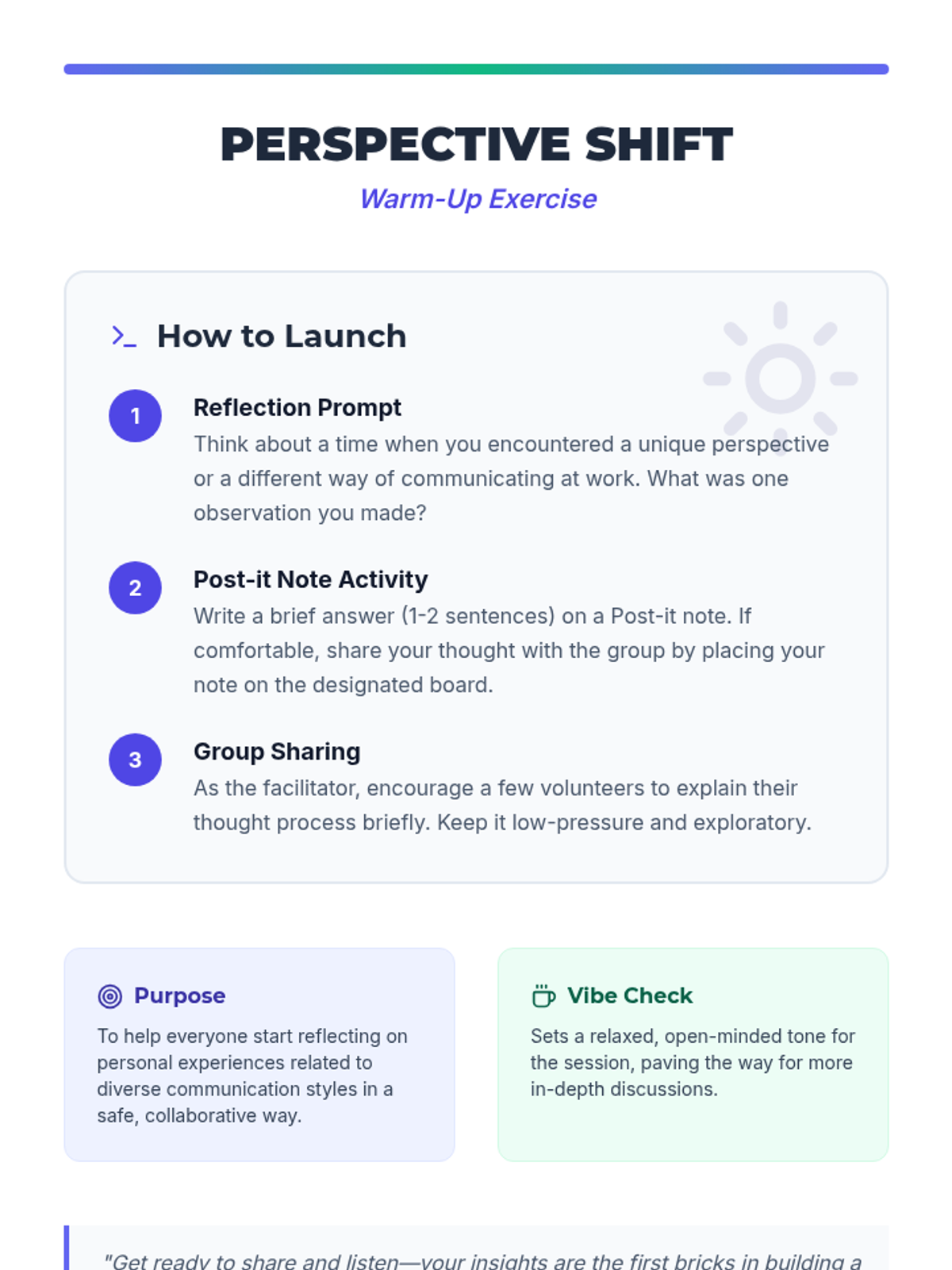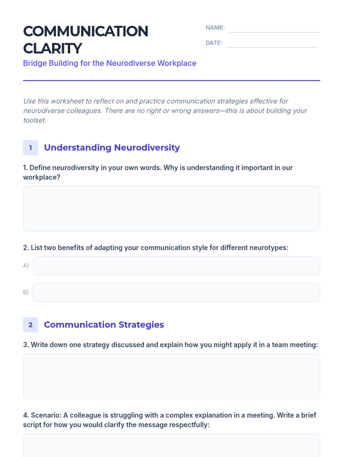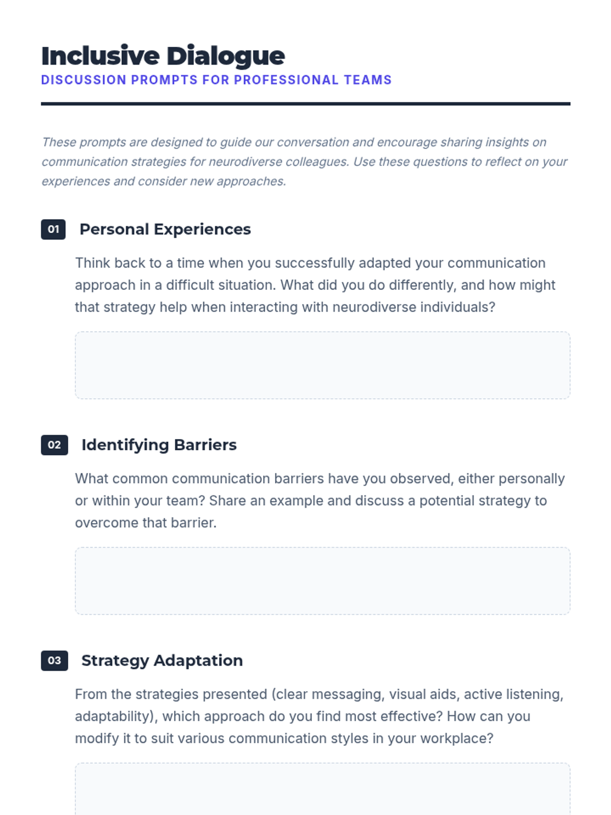 A 25-minute professional development session for tech professionals focused on practical communication strategies for neurodiverse workplaces. Participants engage in interactive activities to identify barriers and build inclusive bridges.