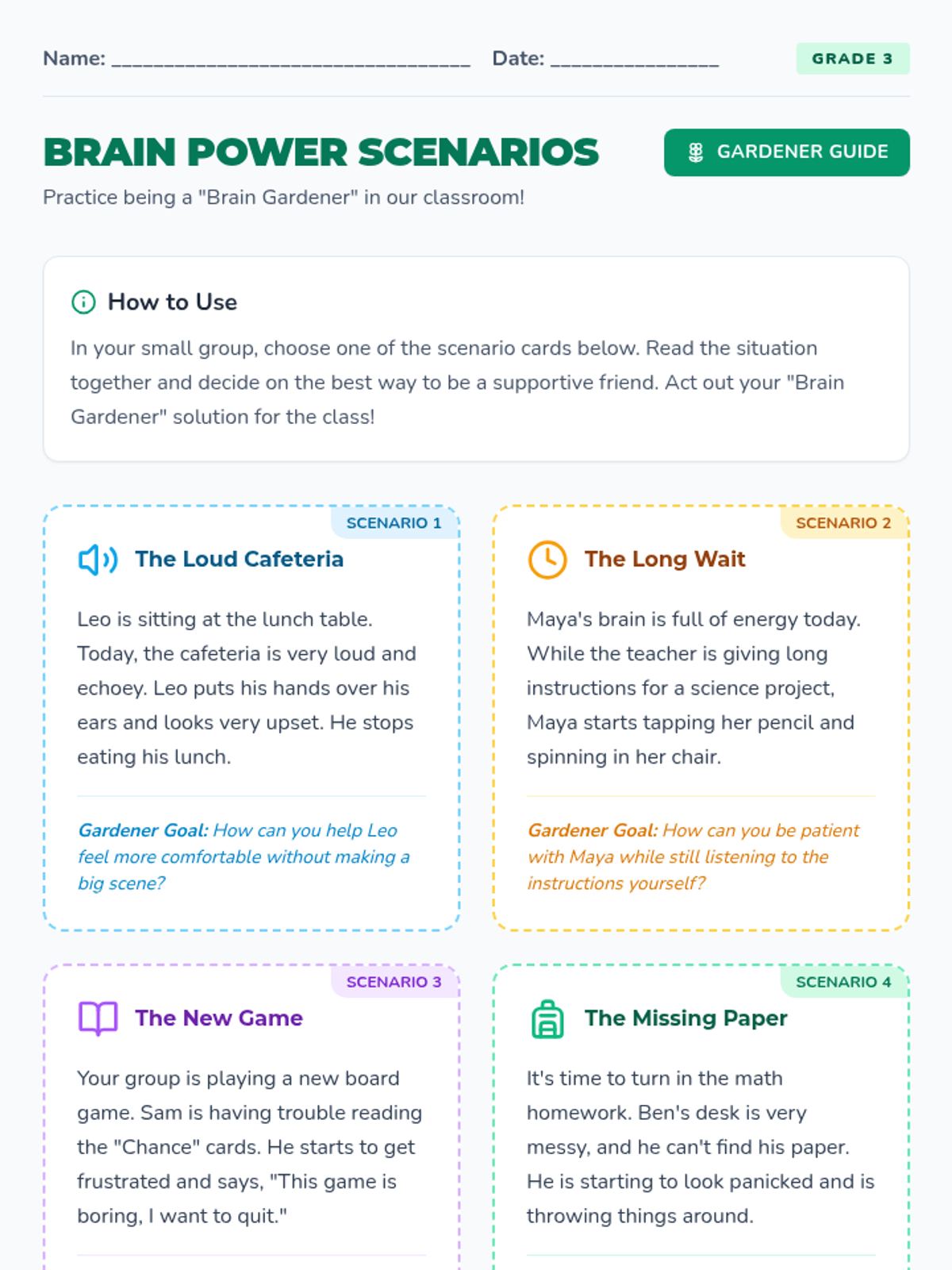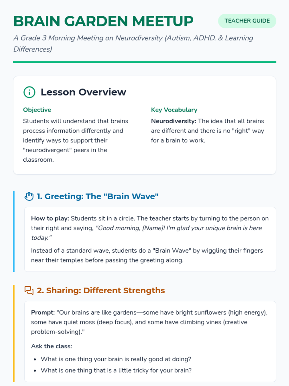 A 20-minute morning meeting lesson for 3rd grade focused on understanding and celebrating neurodiversity through the metaphor of a 'Brain Garden'. It includes visual discussion aids and empathy-building role-play scenarios.