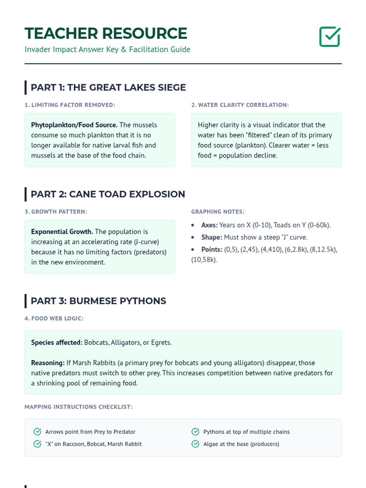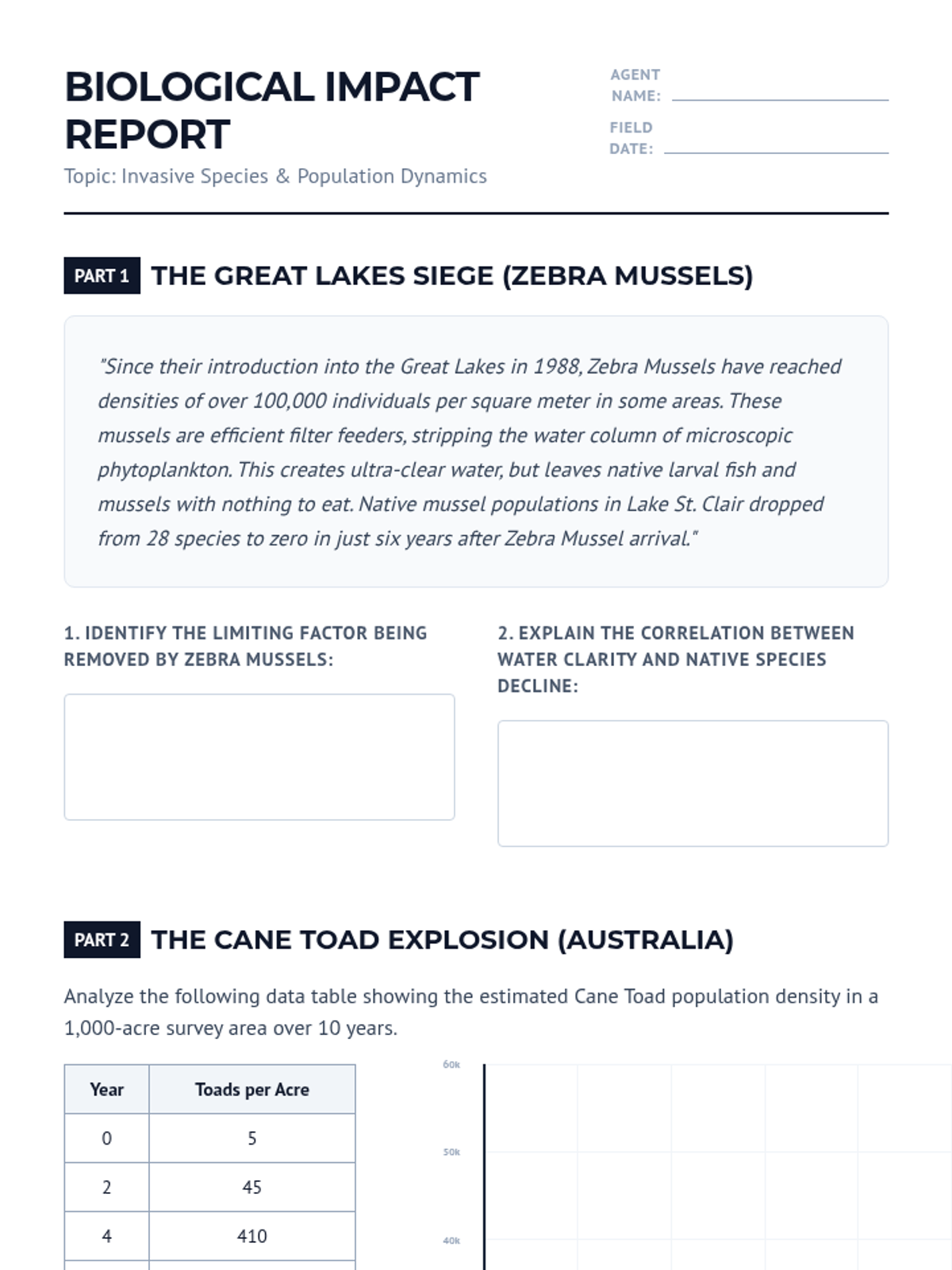 A comprehensive lesson on invasive species focusing on their dramatic impact on local populations and ecosystems through data analysis and food web mapping.