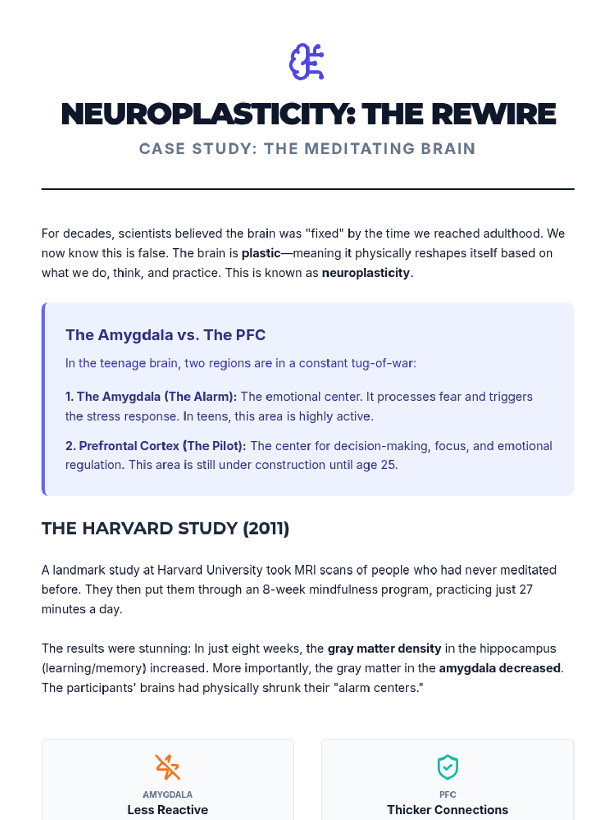 Students examine how meditation physically changes brain structure, focusing on the relationship between the amygdala and the prefrontal cortex in the teenage brain.