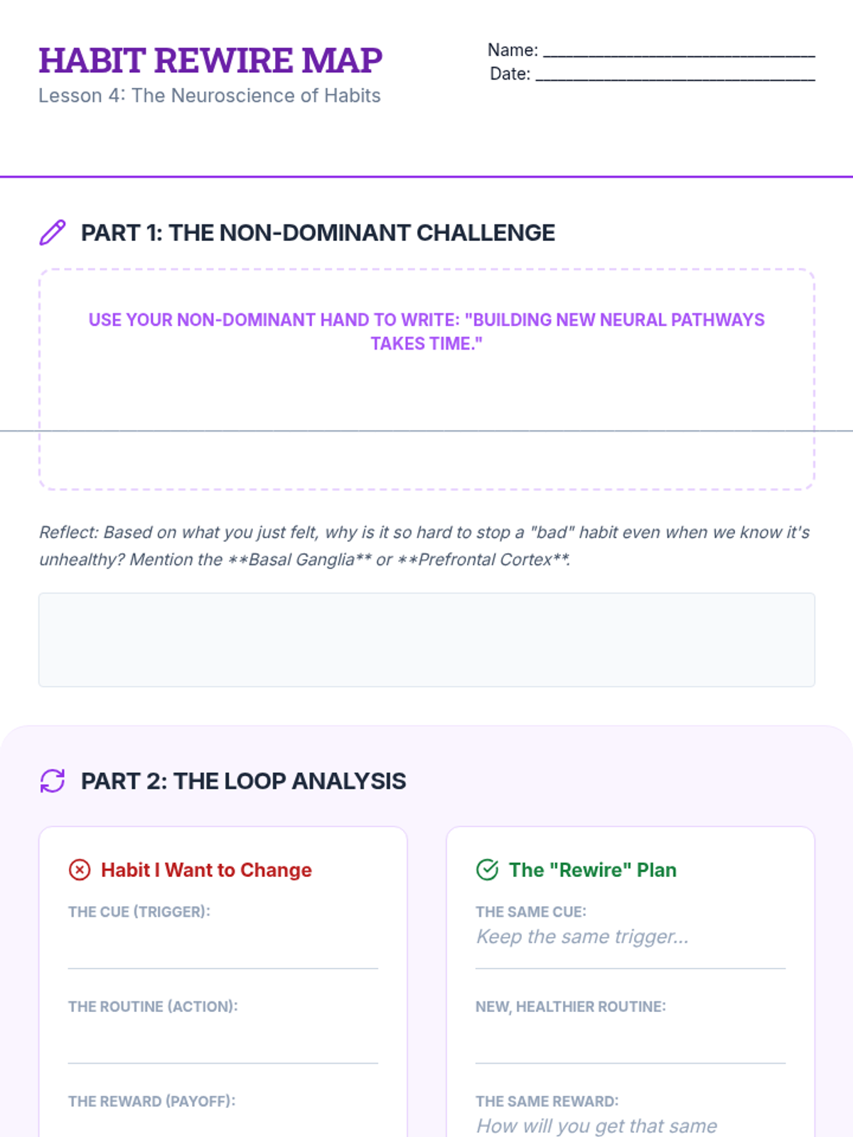An introduction to the neurology of habits, teaching students how to use the 'Habit Loop' to create sustainable health changes.