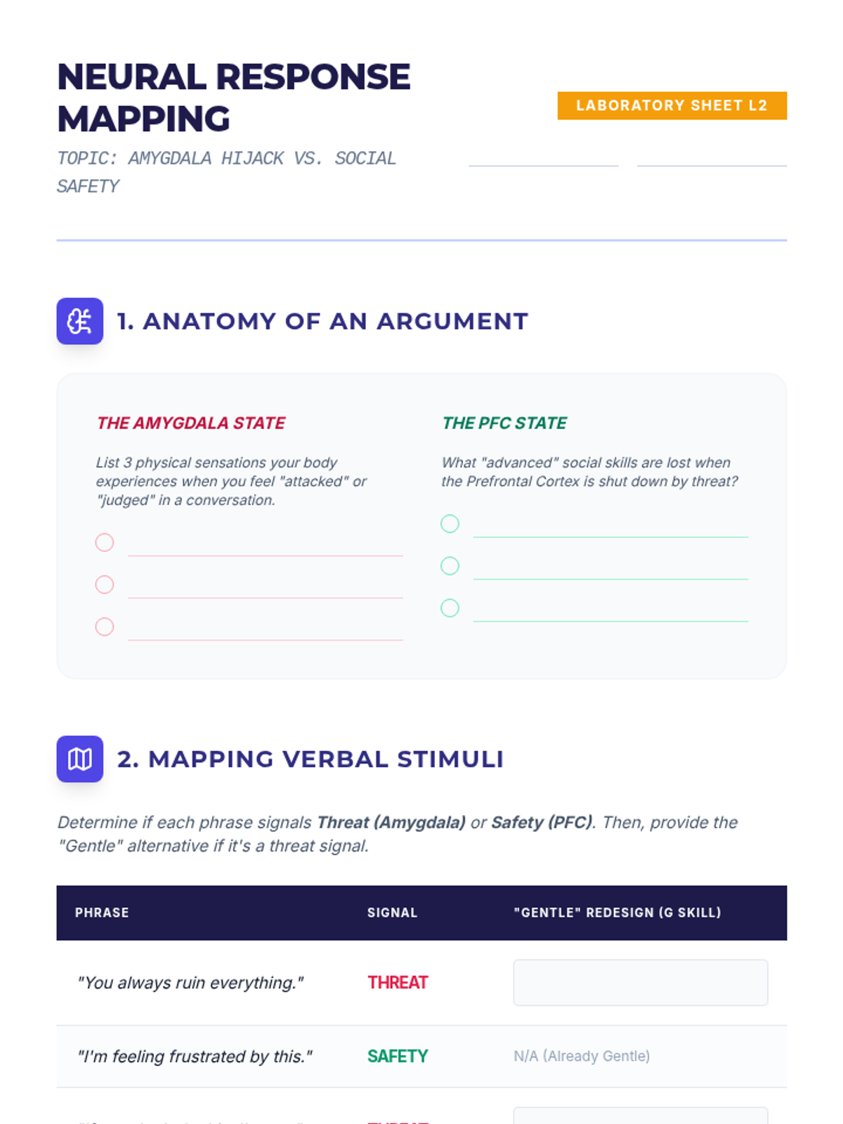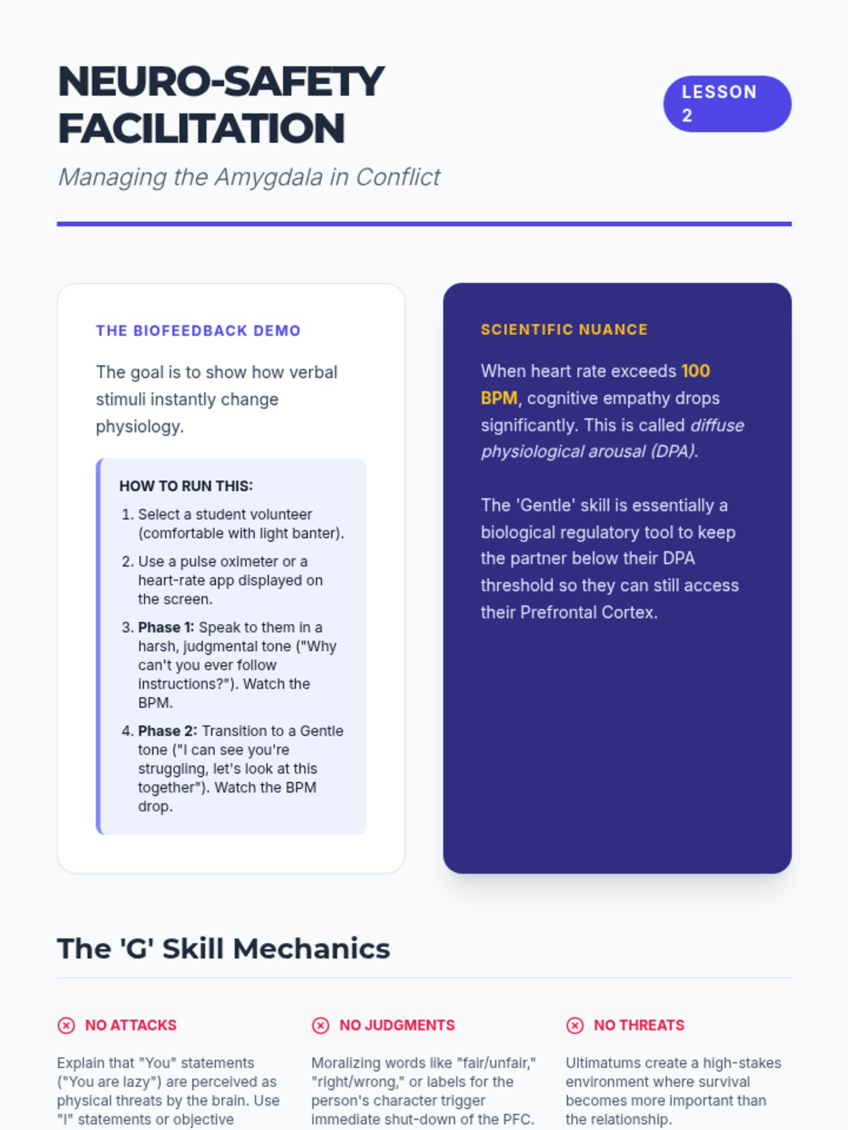 Investigate the neuroscience of the amygdala's fight-or-flight response to verbal conflict. Students learn how 'Gentle' communication signals safety to the nervous system, maintaining prefrontal cortex engagement.