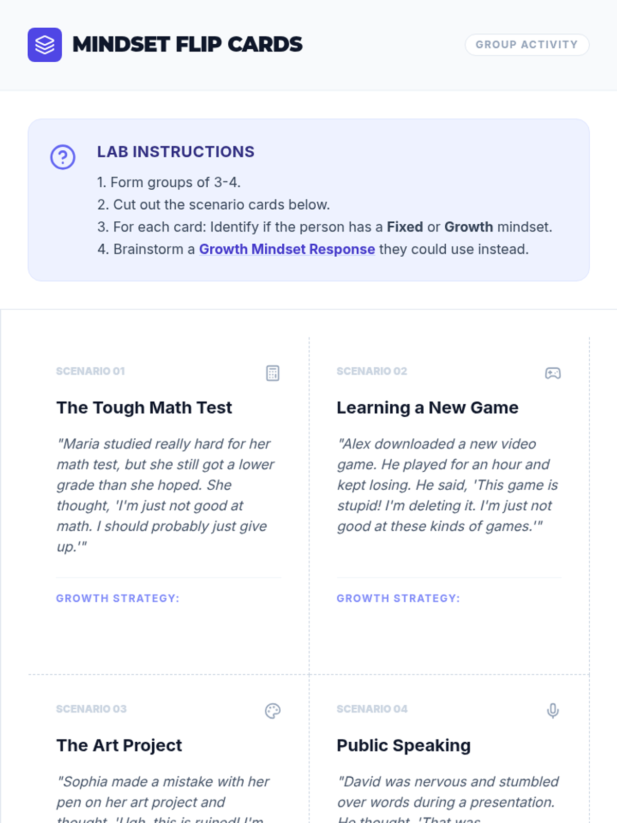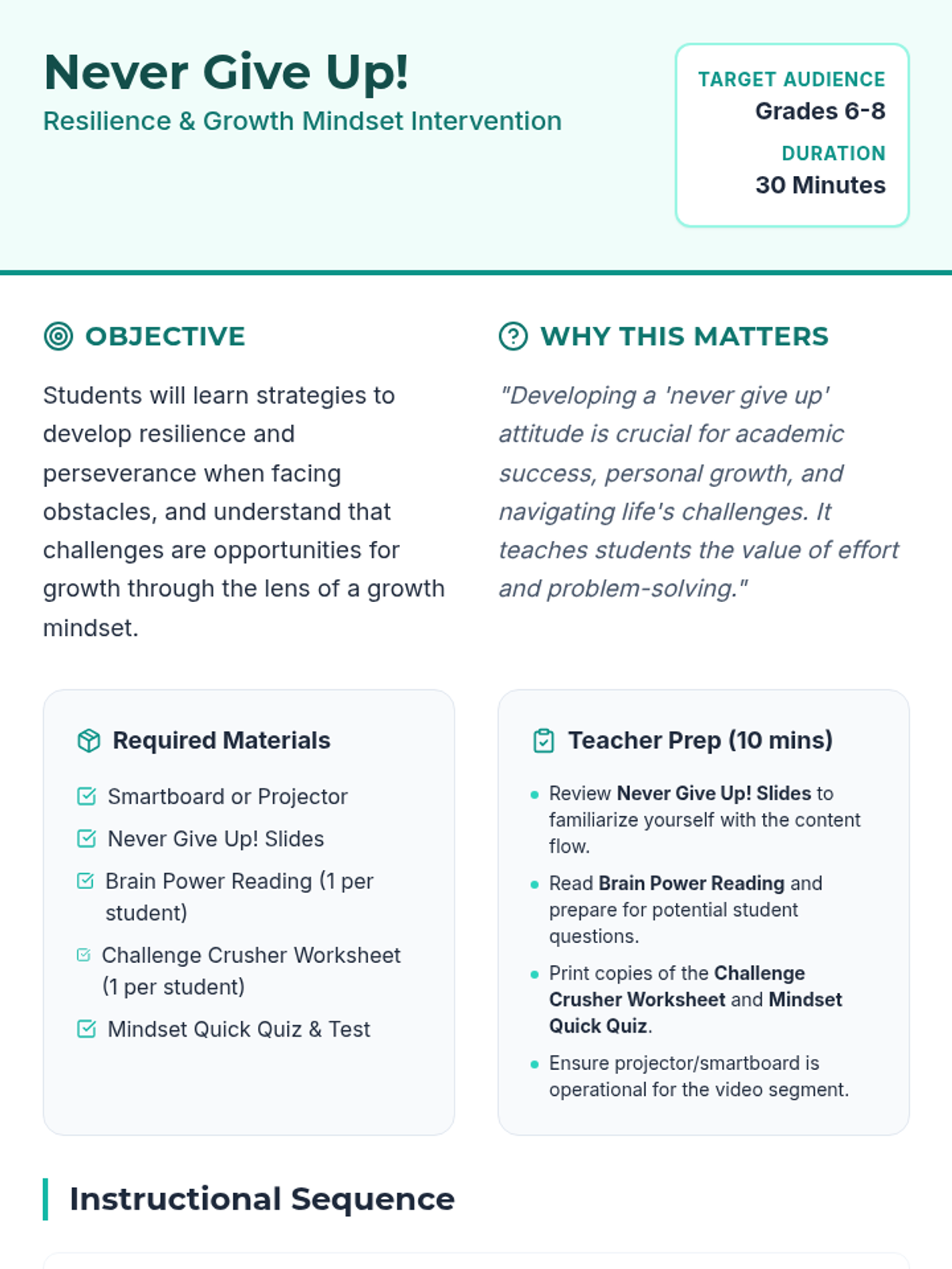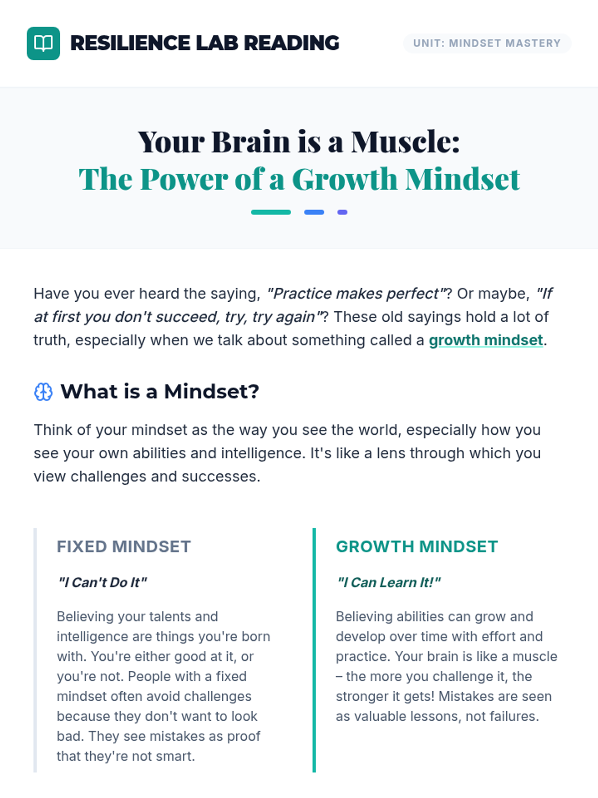 A middle school intervention lesson focused on developing resilience and a growth mindset. Students will explore the difference between fixed and growth mindsets through interactive slides, reading, and personal reflection.