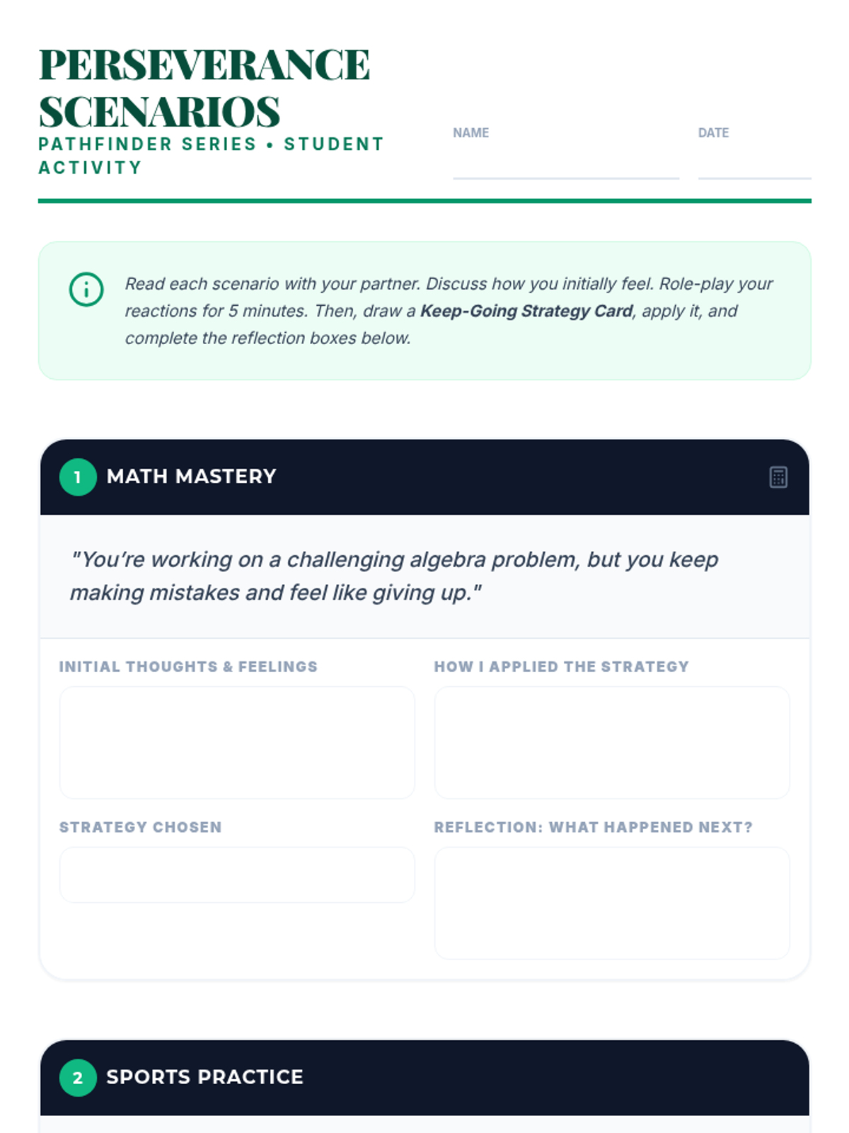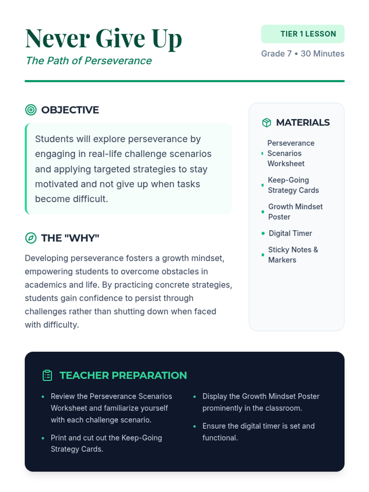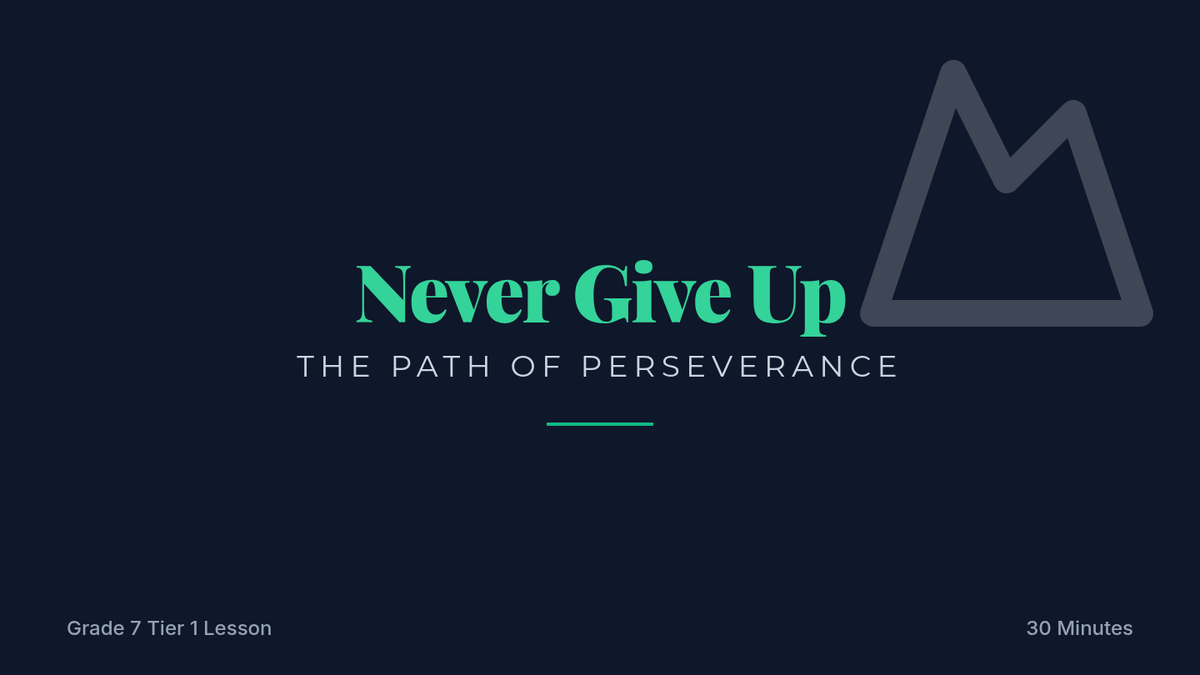 A 30-minute Tier 1 lesson for 7th graders to develop perseverance and a growth mindset through role-playing and strategy application. Students will learn to navigate challenges and stay motivated using concrete 'Keep-Going' strategies.