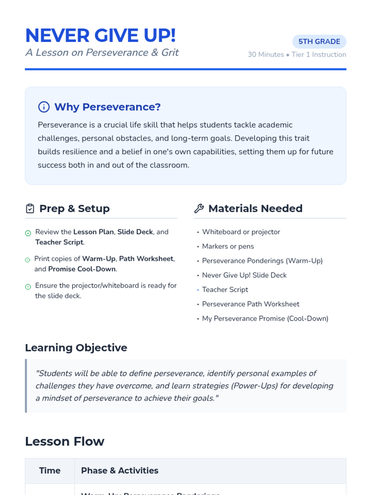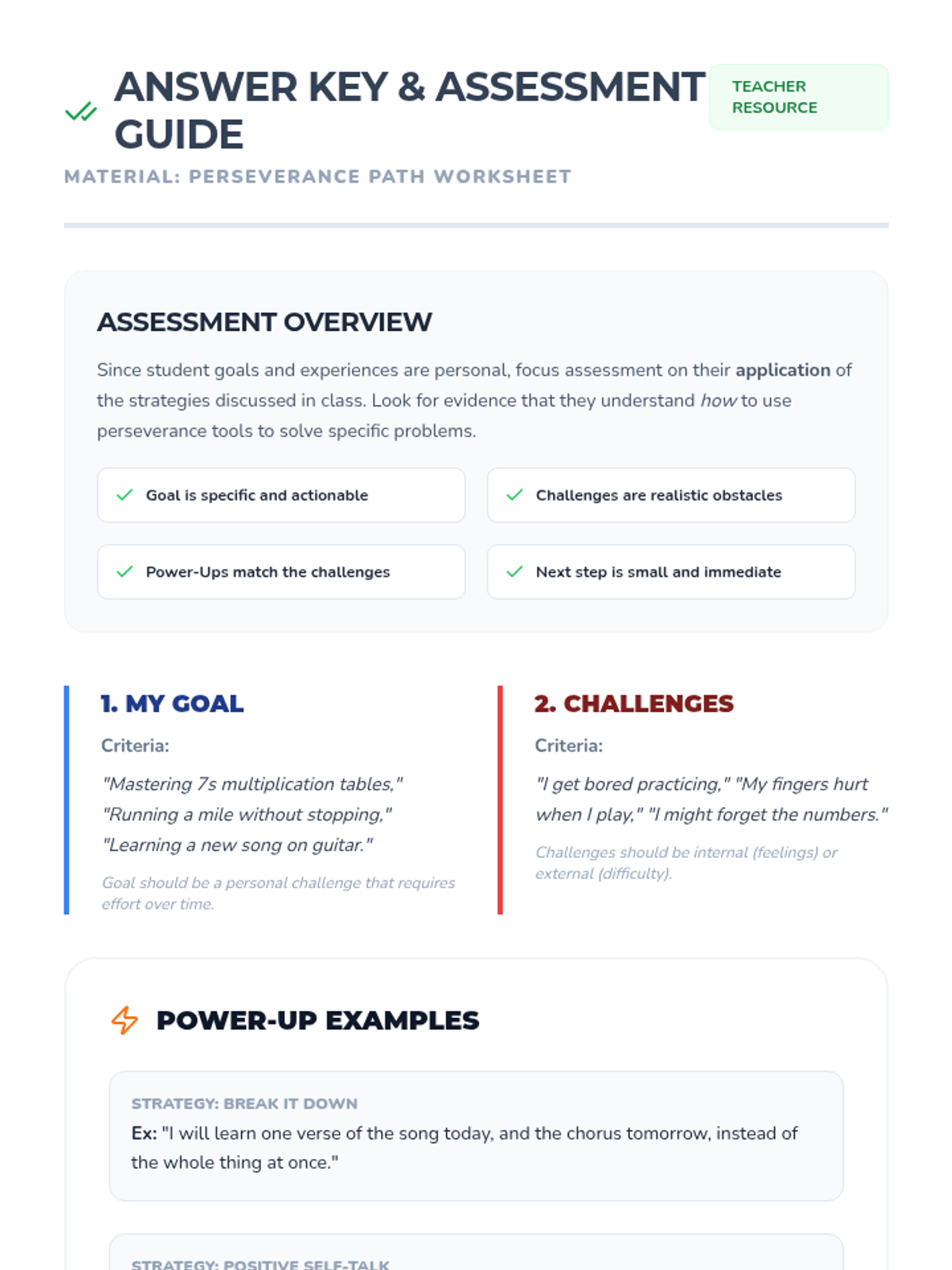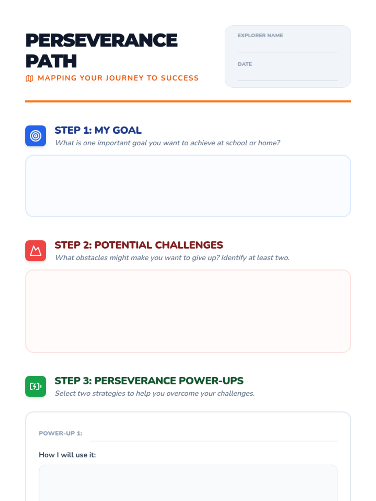 A 30-minute SEL lesson for 5th graders focused on defining perseverance and identifying strategies to overcome challenges. Students will reflect on personal experiences and create a plan for a future goal using 'Perseverance Power-Ups'.