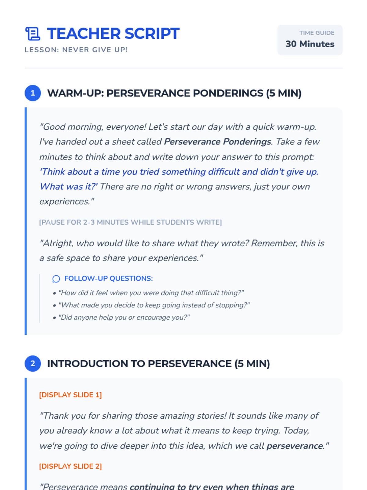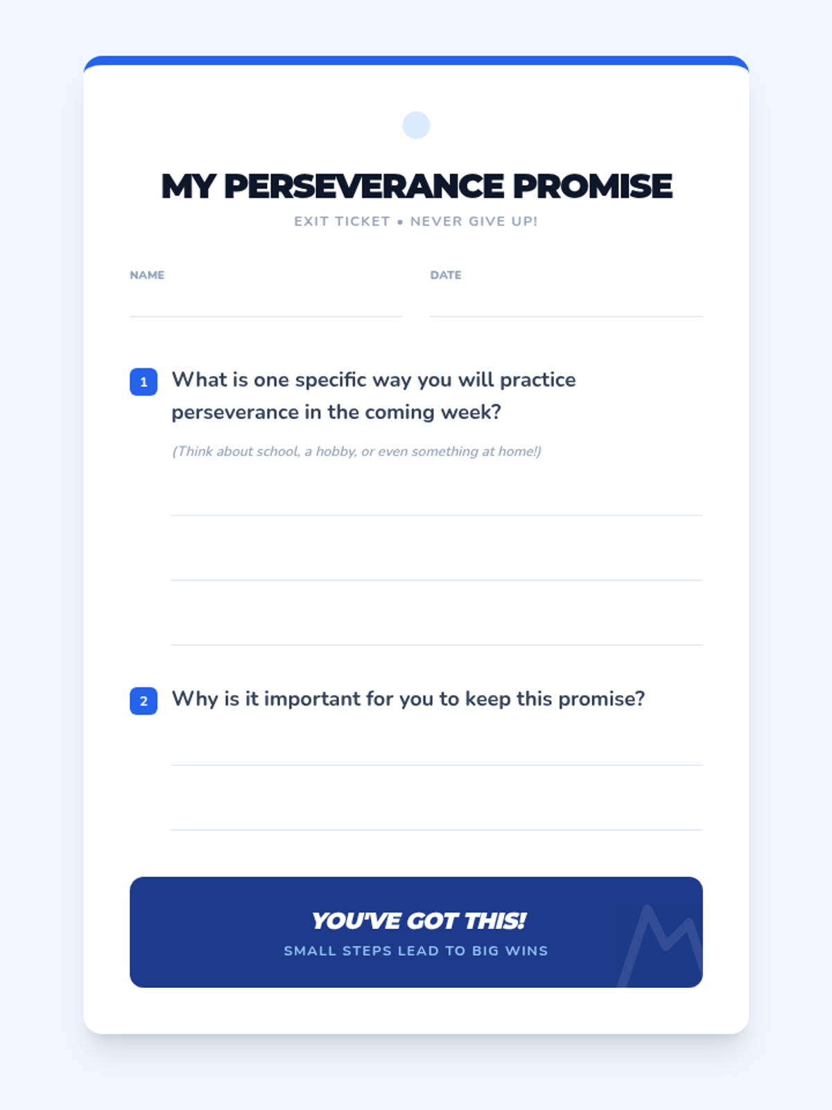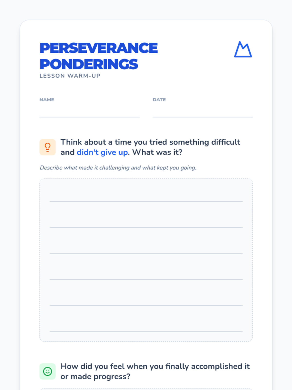 A 30-minute SEL lesson for 5th graders focused on defining perseverance and identifying strategies to overcome challenges. Students will reflect on personal experiences and create a plan for a future goal using 'Perseverance Power-Ups'.