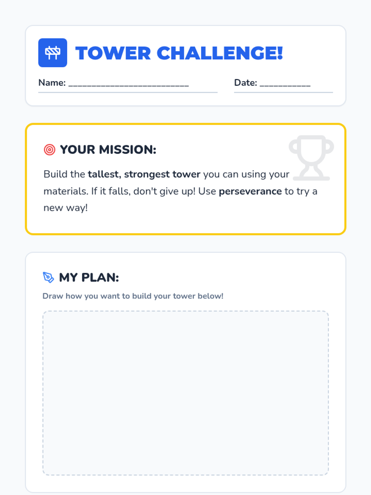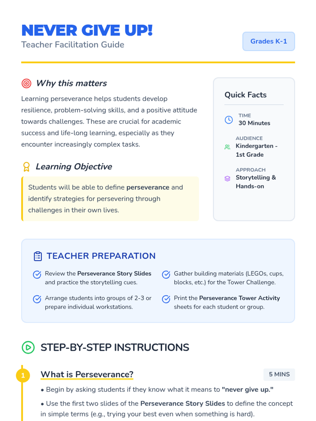 This lesson teaches Kindergarten and 1st-grade students about the importance of perseverance and trying their best through a story and a hands-on building challenge.