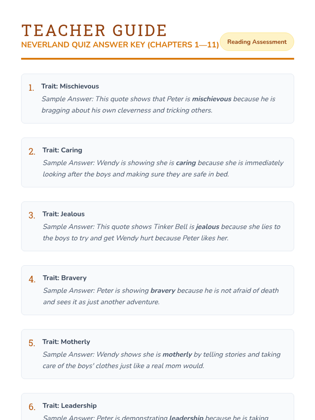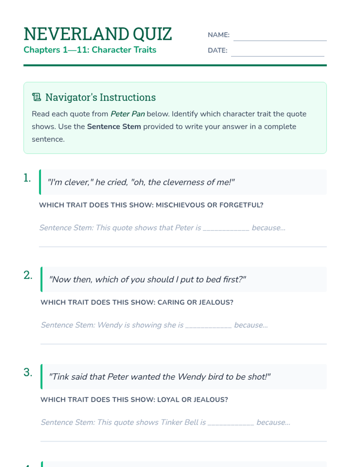 A focused assessment for the first half of Peter Pan, focusing on identifying character traits through text evidence and quotes. Students analyze Peter, Wendy, and Tinker Bell's actions to understand their complex personalities.