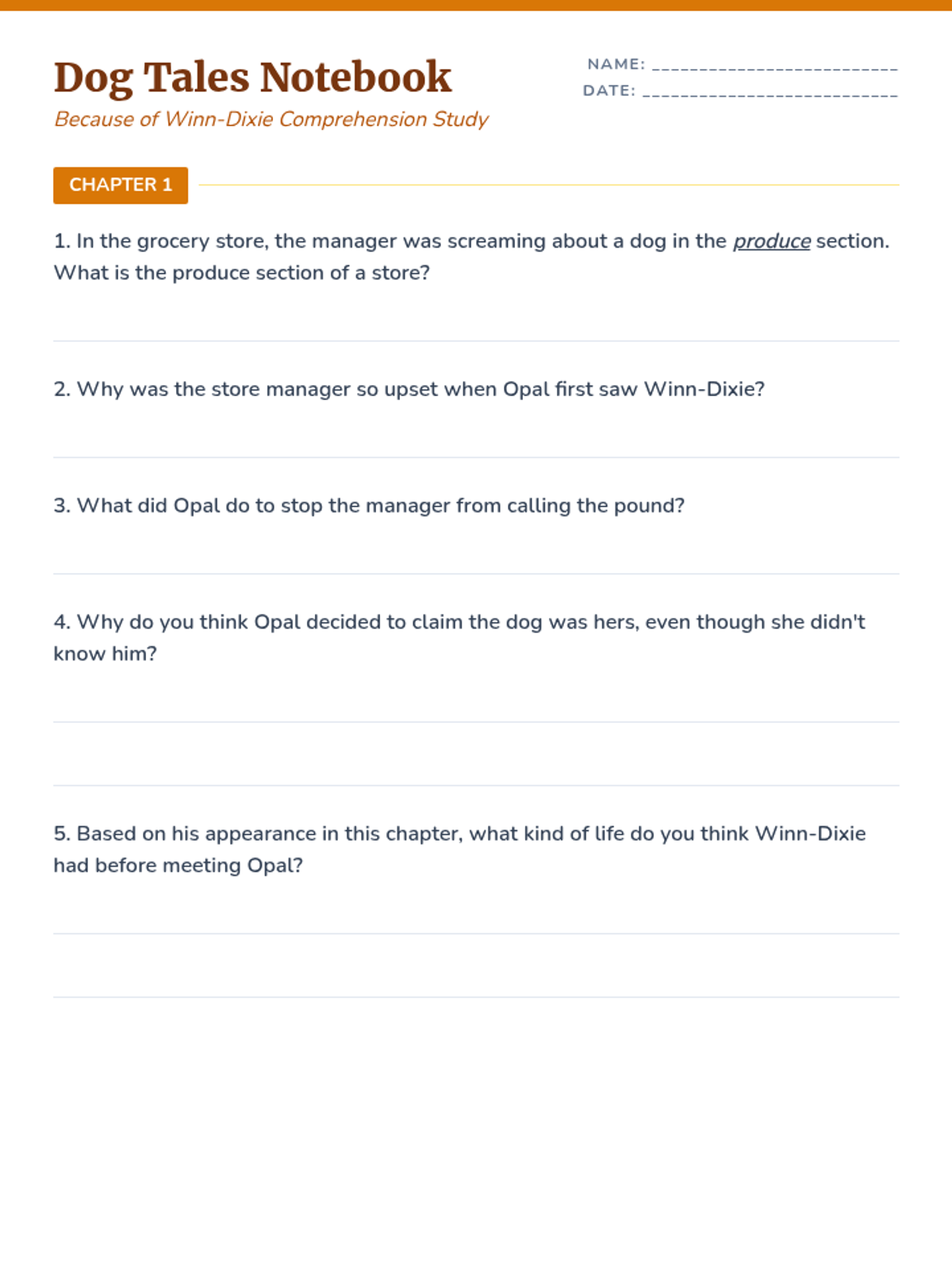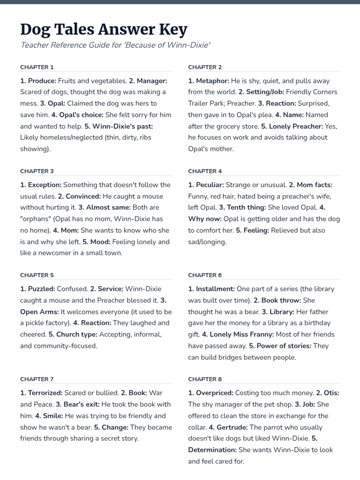 A comprehensive study of 'Because of Winn-Dixie' focusing on vocabulary, literal comprehension, and inferential thinking across all 26 chapters.