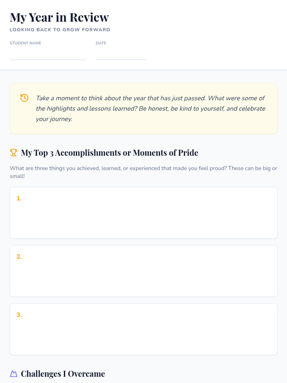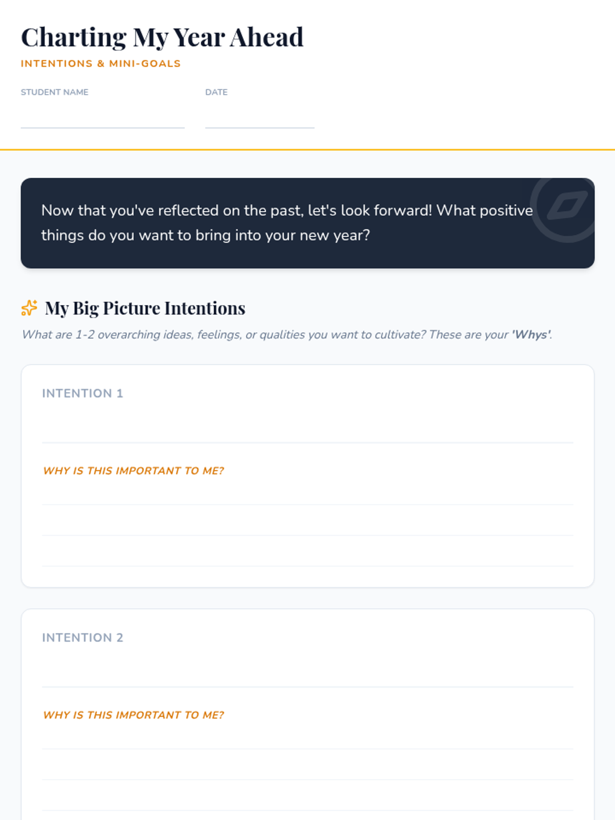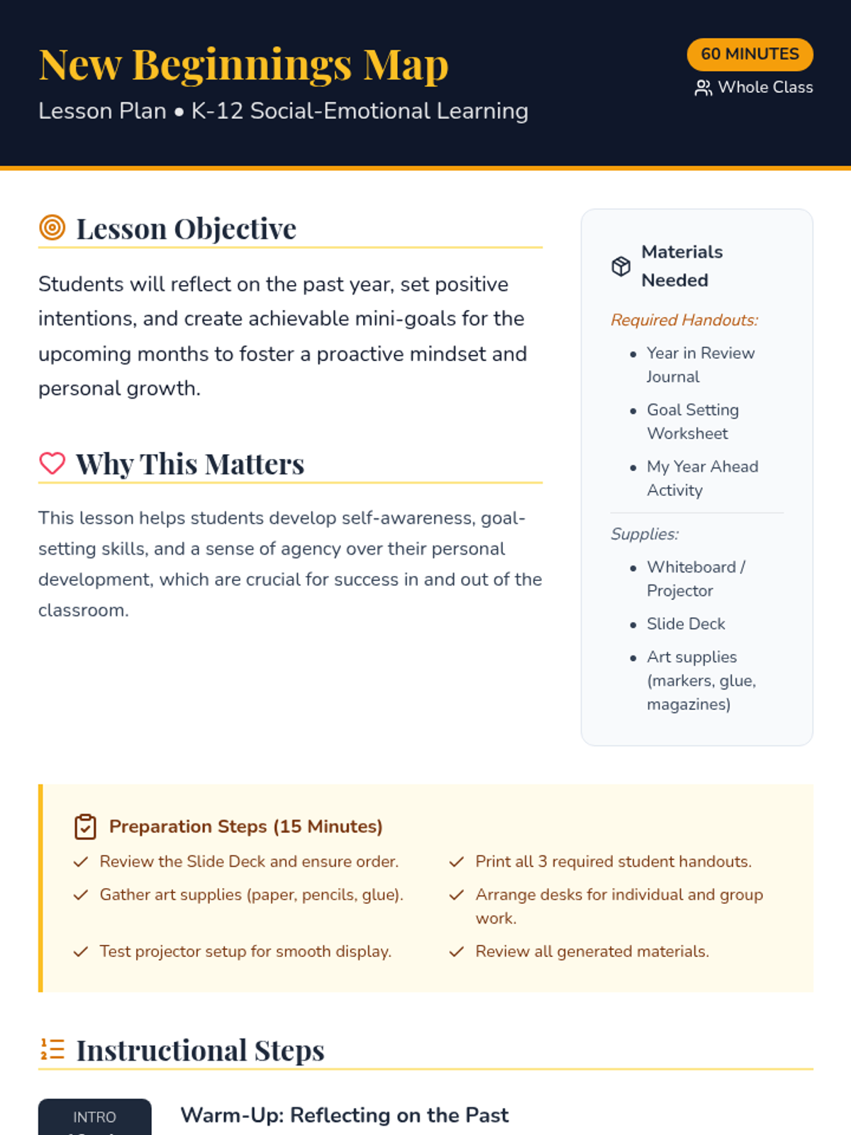 This lesson guides students through a reflective process of reviewing the past year and intentionally planning for the future. Through journaling, goal-setting, and creative mapping, students develop self-awareness and a proactive mindset for personal growth.