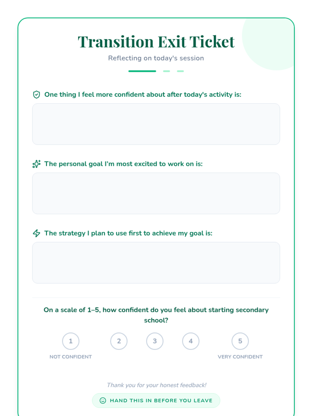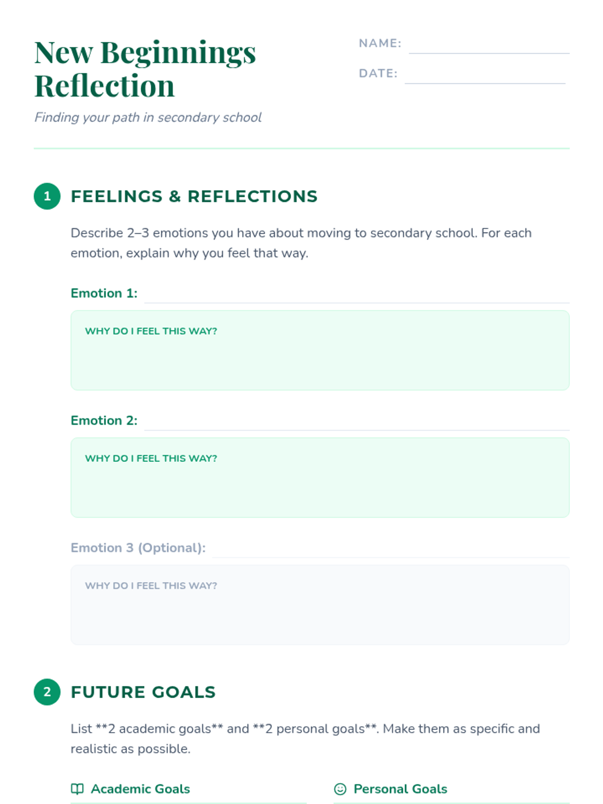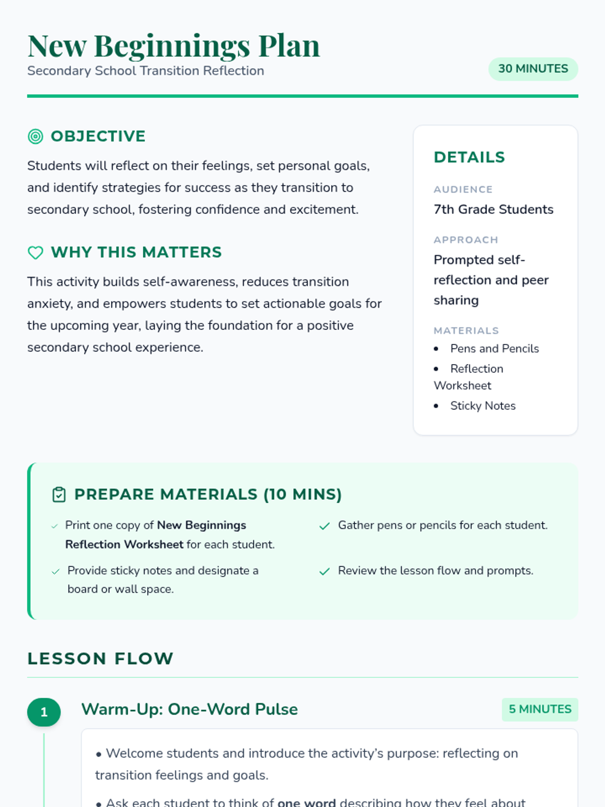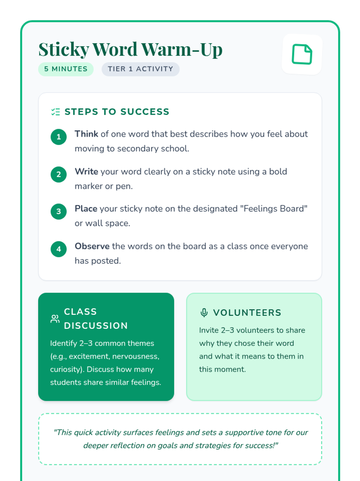 A 30-minute Tier 1 reflection activity for 7th graders transitioning to secondary school, focusing on feelings, goals, and success strategies.