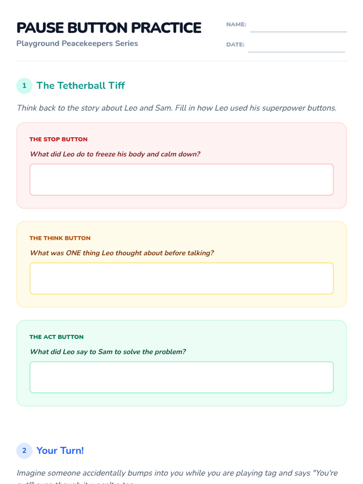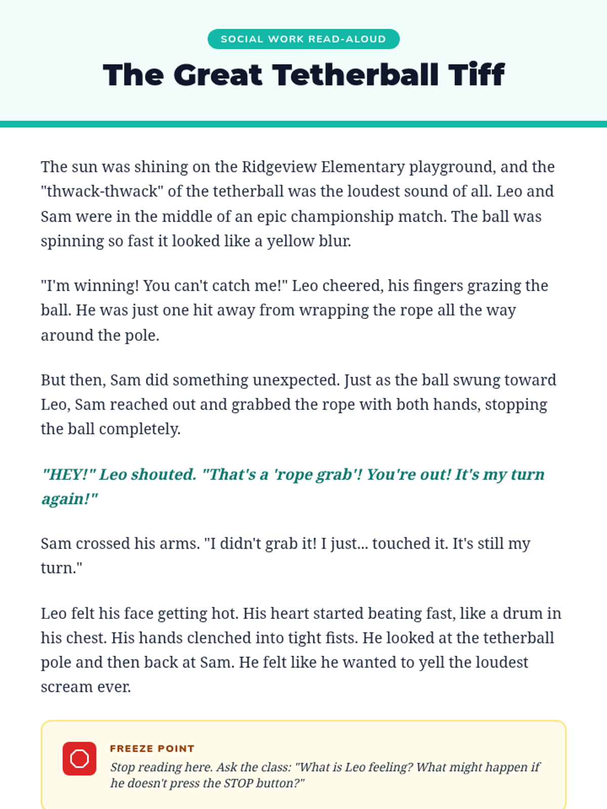 A 30-minute lesson teaching 4th graders the Stop-Think-Act method to navigate playground conflicts with emotional intelligence.